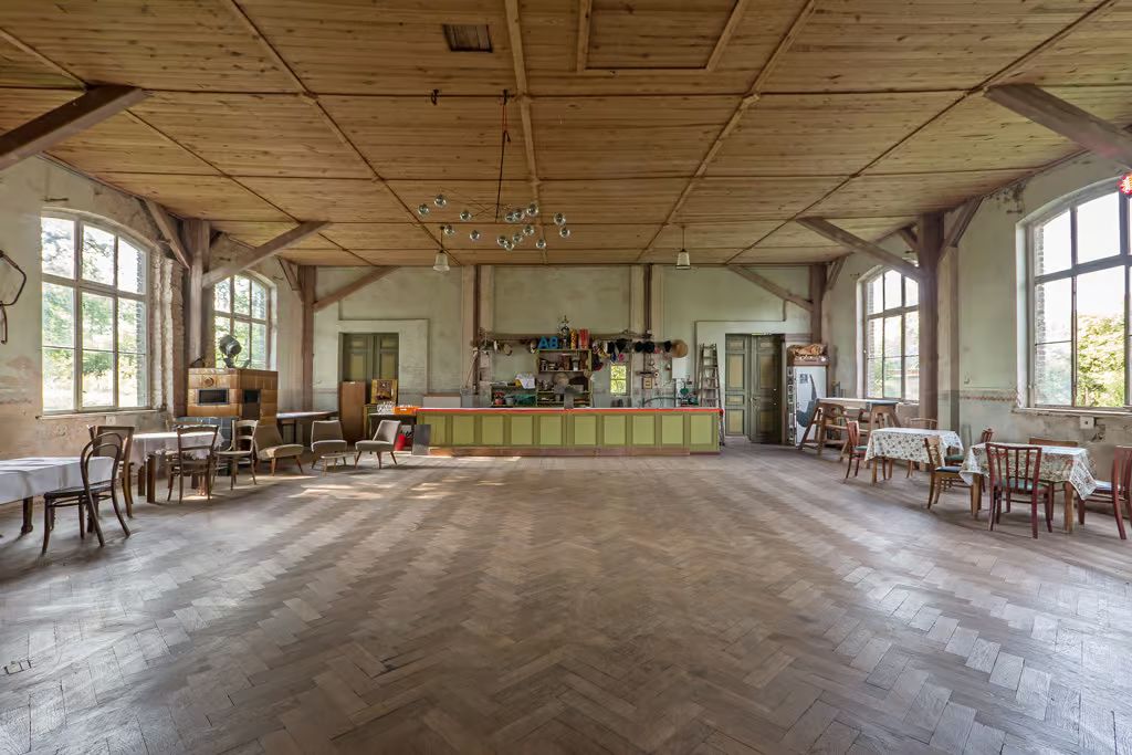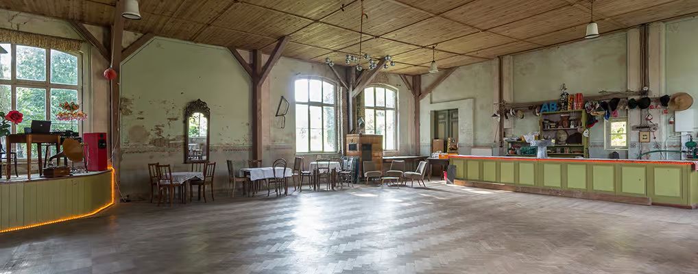 Die spürbare Aura vergangener Zeiten, das sehr gut erhaltene Eichen-Parkett, die beiden wahrscheinlich von Carinhall stammenden Spiegel, der ehemalige Tresen, sehr gute Akustik und schönes Licht machen diesen Ort einzigartig.