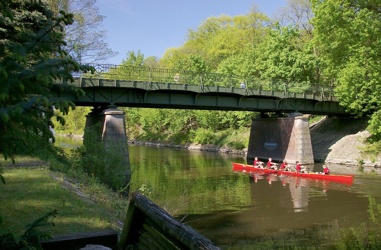 Kleine, selten befahrene Brücke, betoniert, schöner Blick über Kanal Richtung Stölpchensee