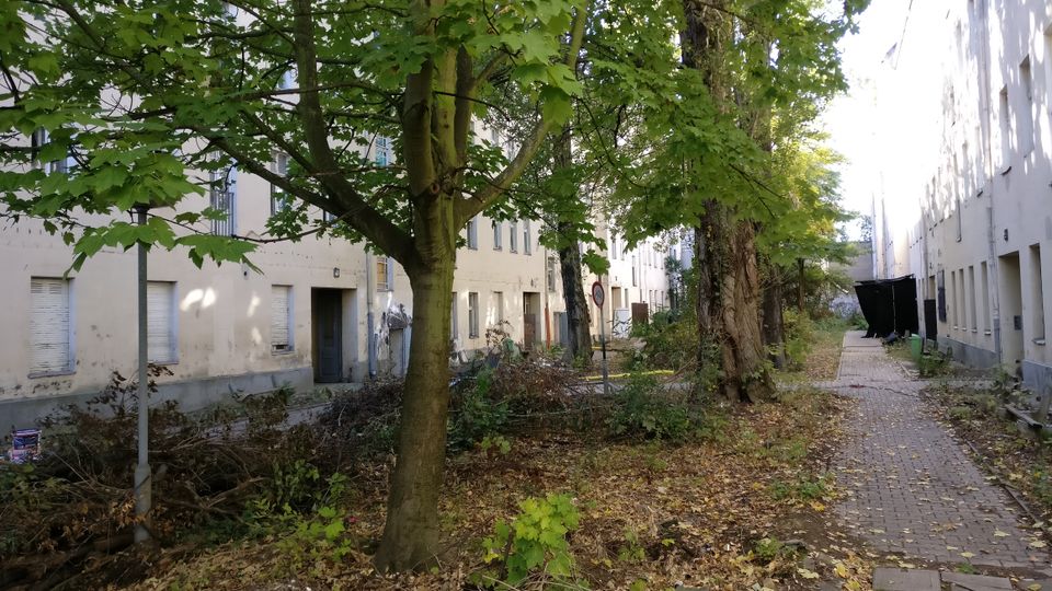 Bei diesem Motiv handelt es sich um einen unsanierten Häuserkomplex aus dem Baujahr 1917. Die insgesamt acht Altbau Wohnhäuser, stehen in 2 Riegeln und umschließen einen begrünten, abgeschirmten Innenhof (1150qm2). Mehrere große Bäume und Sitzbänke befinden sich im großen Innenhof. Es gibt einen weiteren Hinterhof (700qm2) mit morbidem Charme, begrenzt durch eine malerische Backsteinmauer und einen Zaun hinter dem 2ten Wohnhaus.