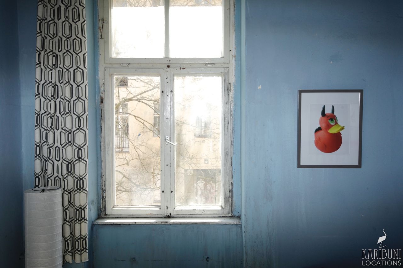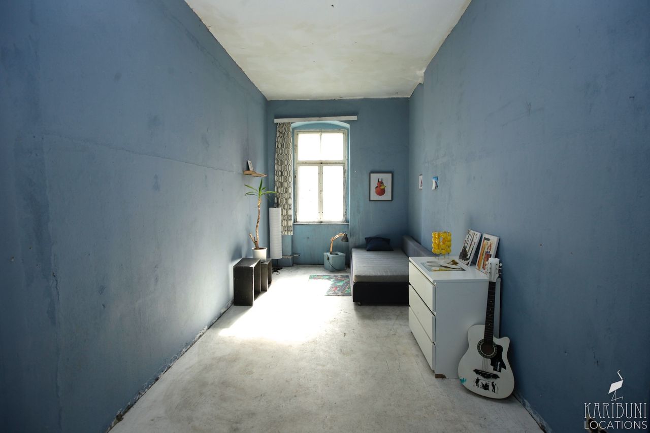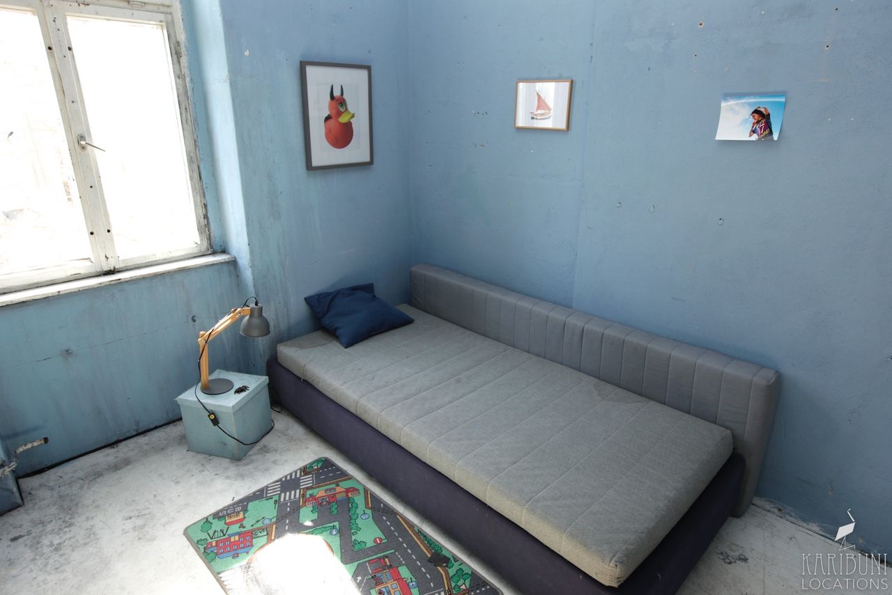 In diesem Jungs-Zimmer könnte der kleine Benjamin wohnen. Die Einrichtung ist ein bisschen runtergekommen, aber der Blauton gib Bennis Reich einen coolen Touch.