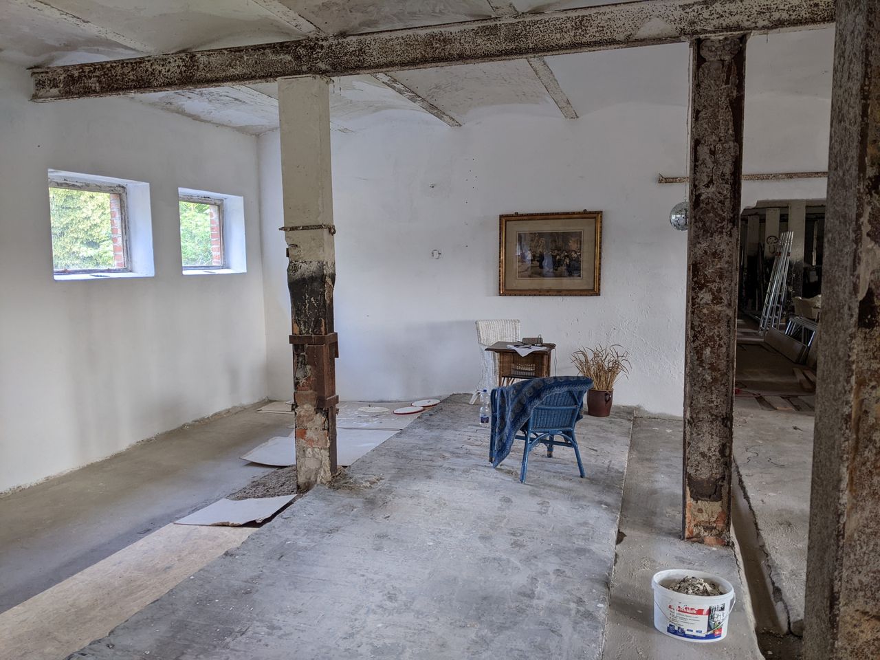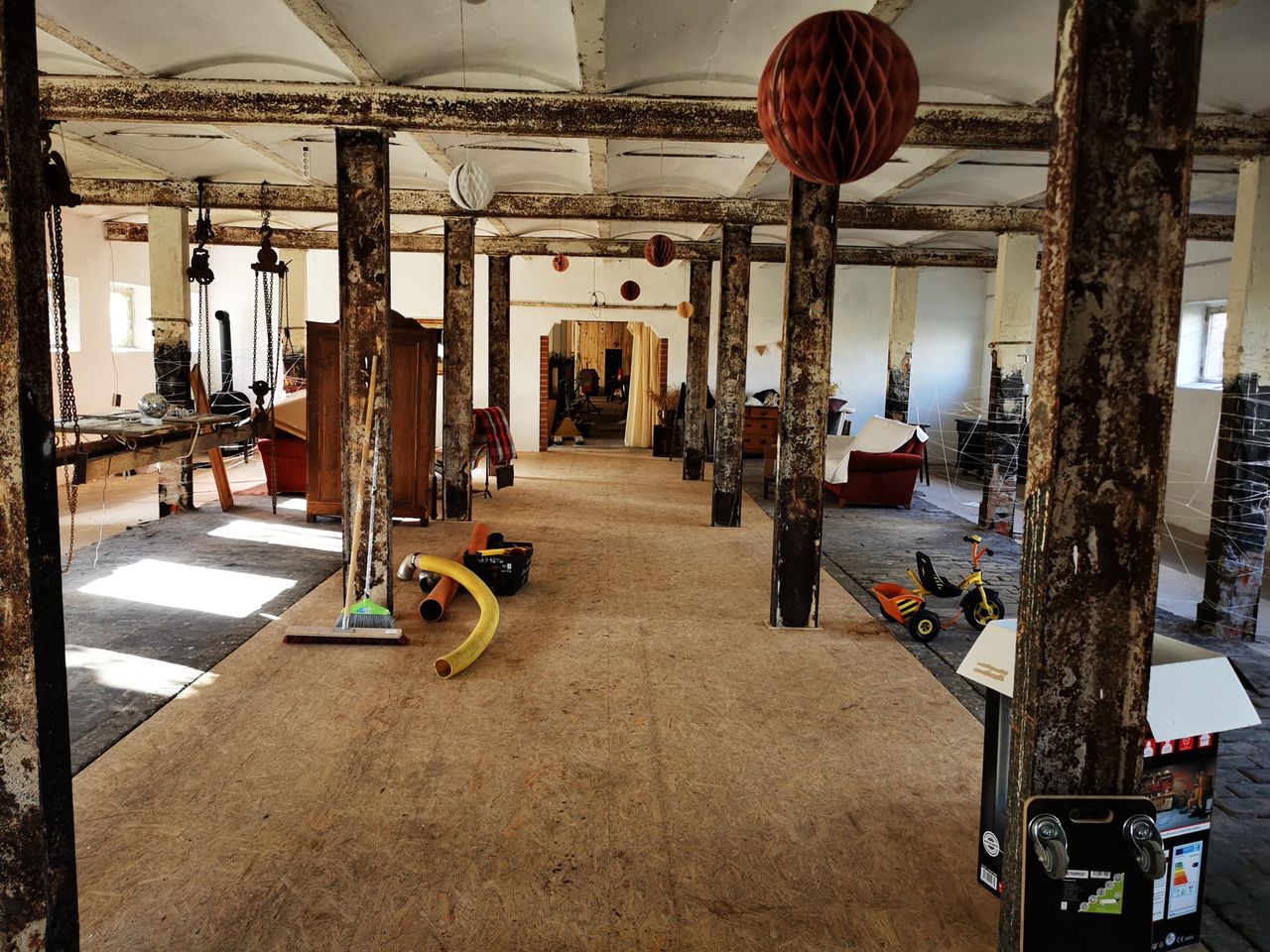 Das Gebäude ist zum Teil entkernt, das heißt die Futtertröge sind herausgerissen. Es gibt einen großen Saal mit Kappendecken und Metallträgern.
