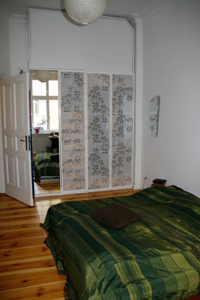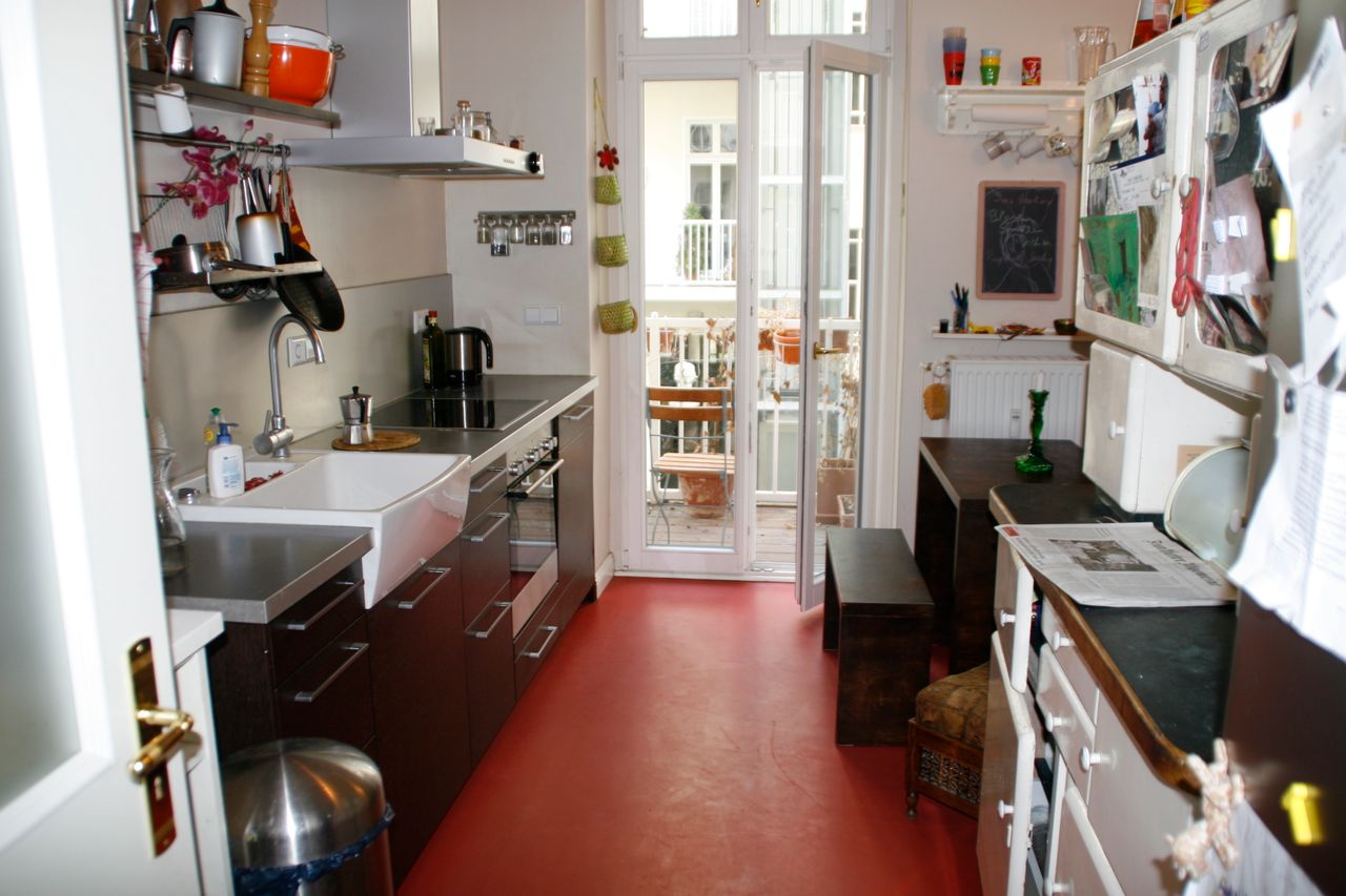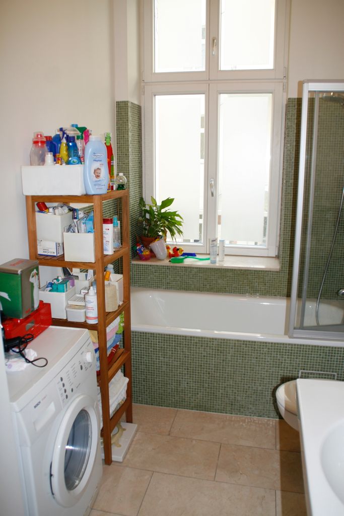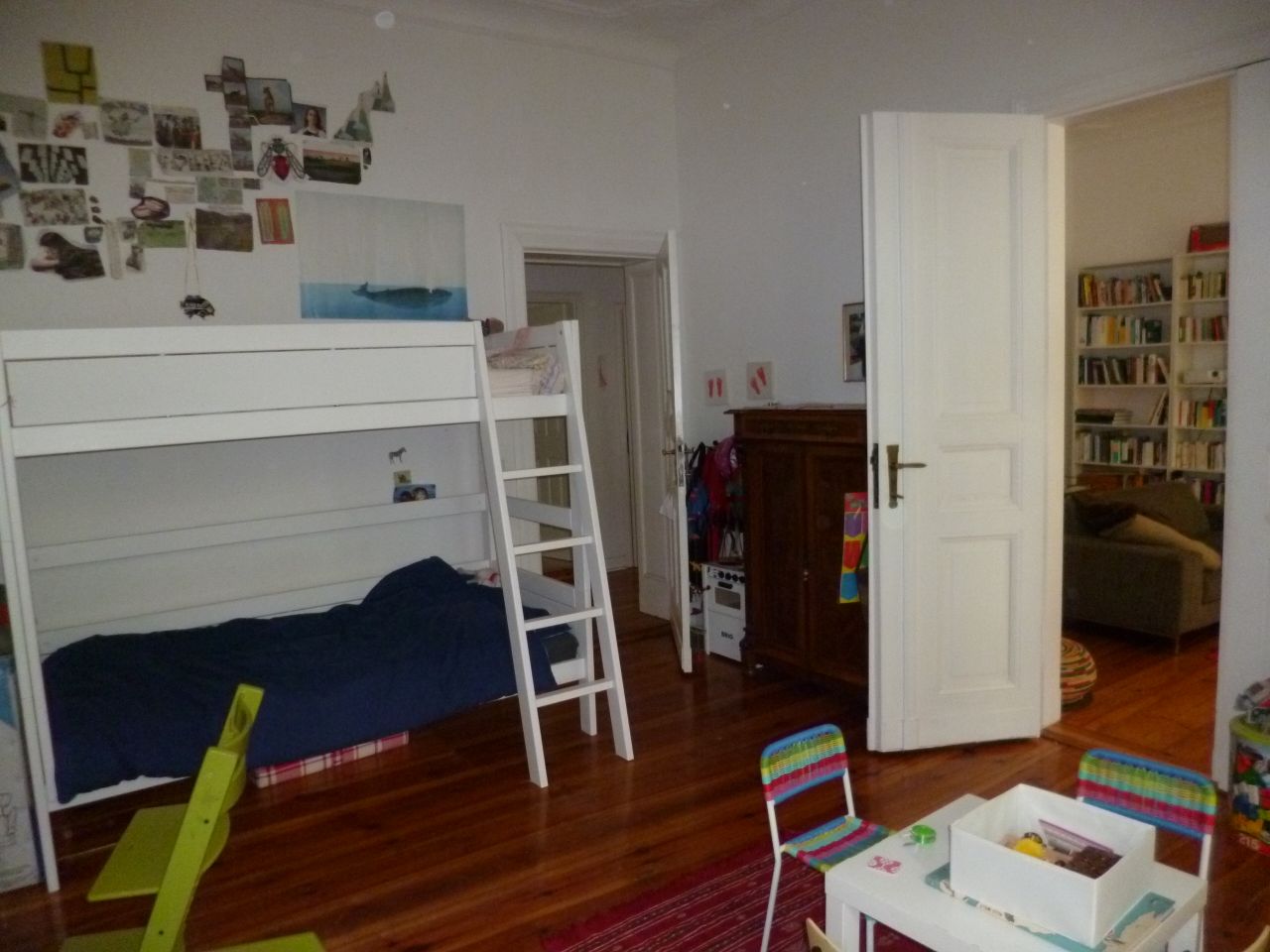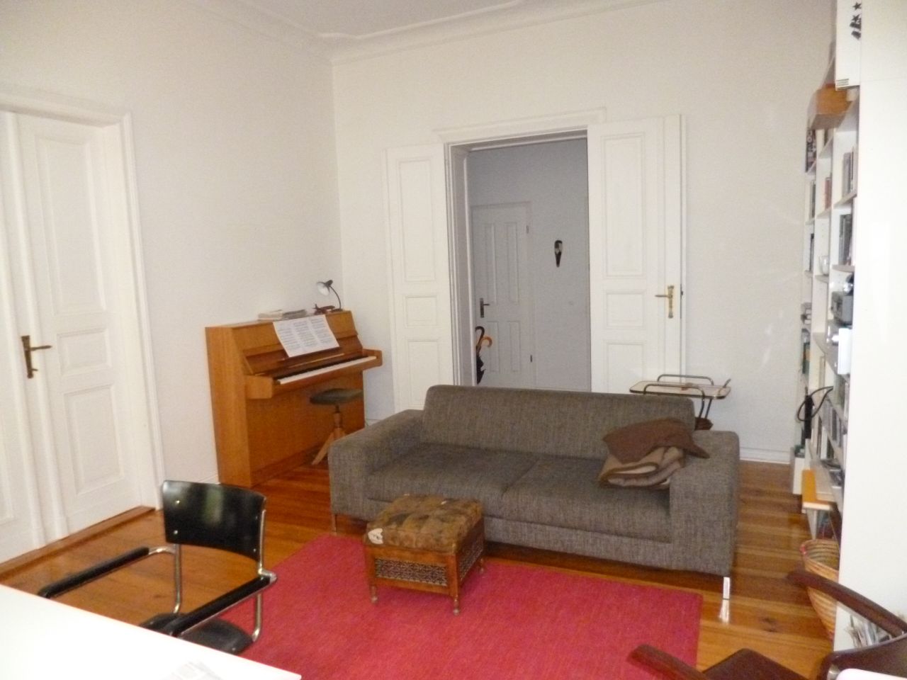 95 qm große, gepflegte Drei-Zimmer-Altbauwohnung in Prenzlauer Berg mit Holzdielen, hohen Decken und Stuck. Kastenfenster mit Gründerzeit-Oliven im Wohn- und Kinderzimmer. Eß- und Wohnzimmer mit Bauhaus-Elementen wie Lampen, Stühlen und Rollschrank sowie Designer-Tisch, 70er-Jahre-Klavier. Modernes Badezimmer mit Badewanne und WC. Separates Gäste-WC. Küche mit Linoleumboden. Zwei Balkone, der kleinere zur Straße, der größere zum Hinterhof. 1. Stock.