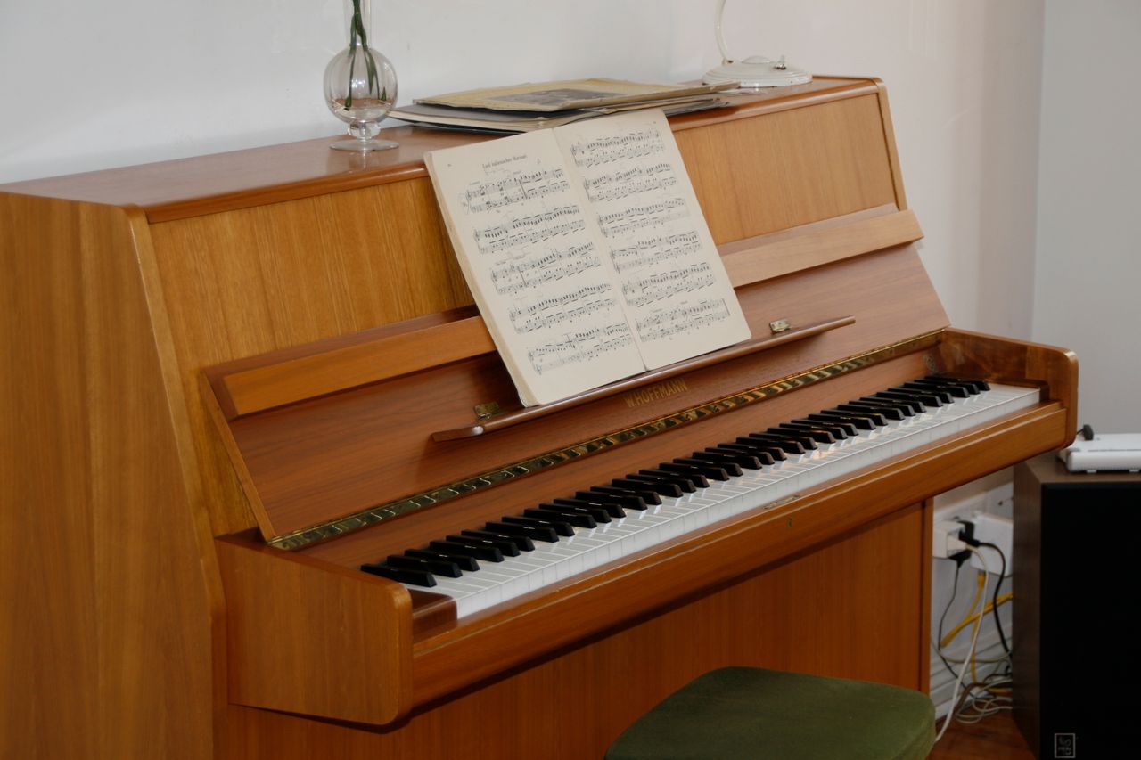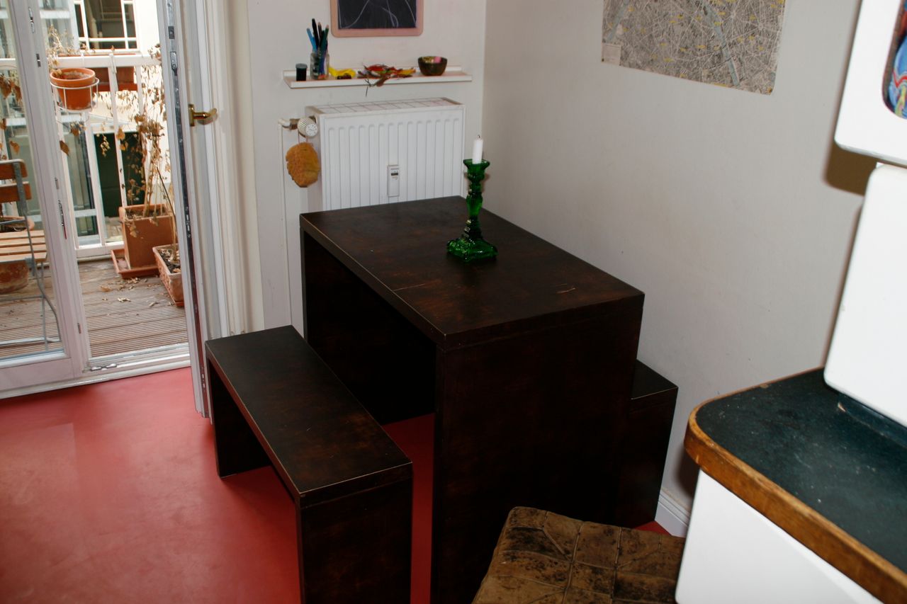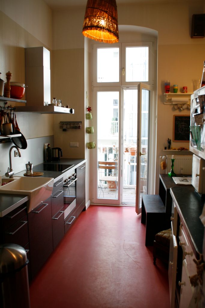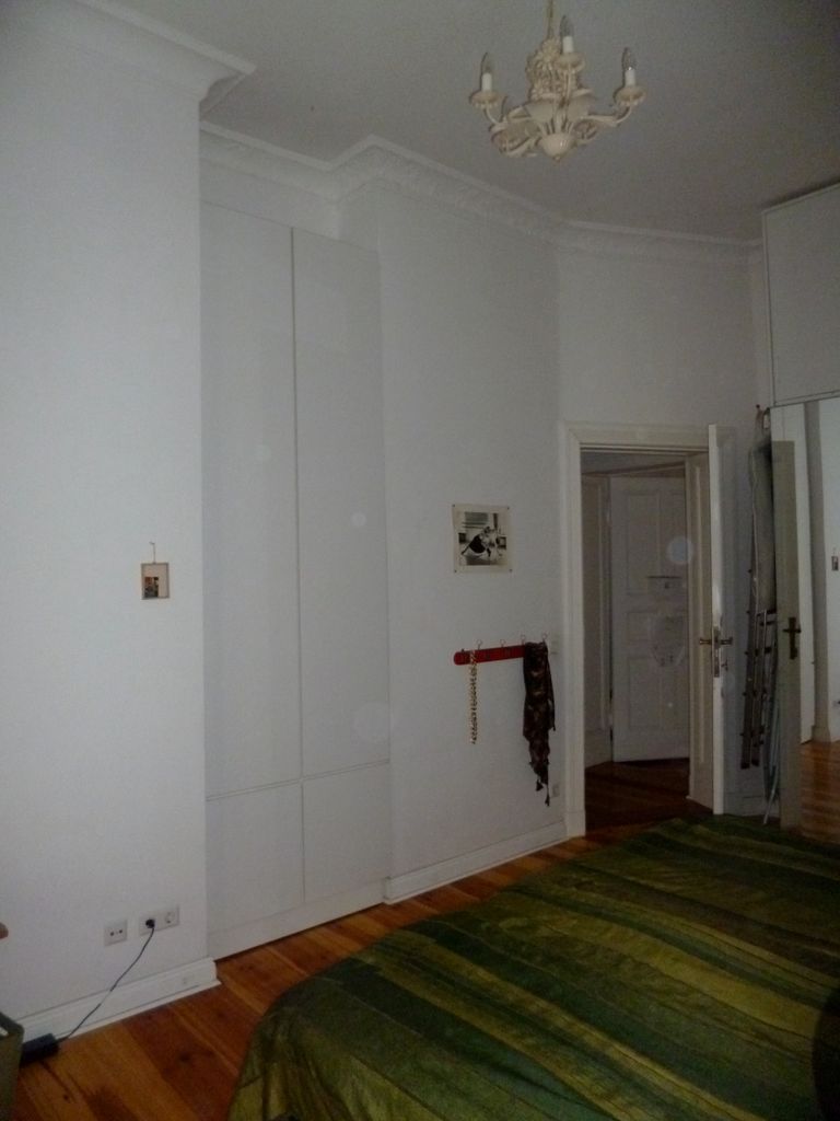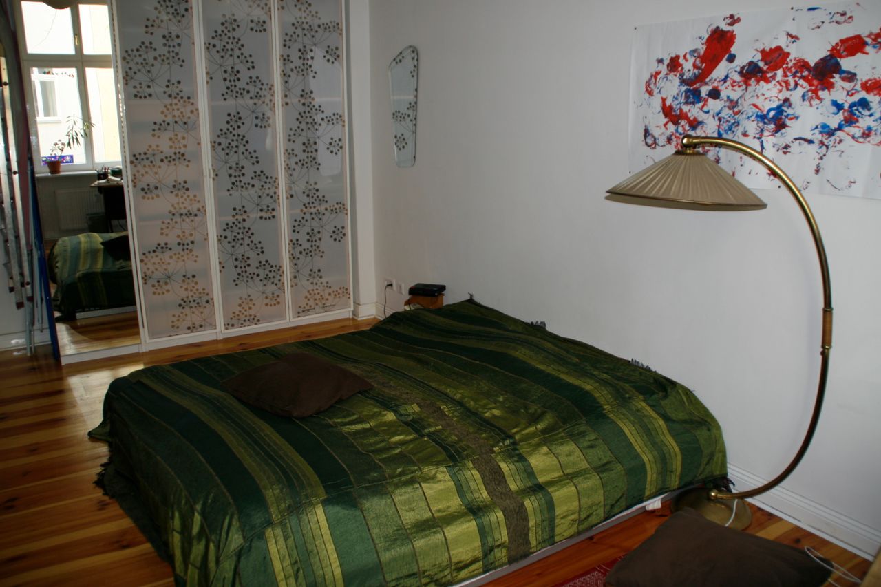 95 qm große, gepflegte Drei-Zimmer-Altbauwohnung in Prenzlauer Berg mit Holzdielen, hohen Decken und Stuck. Kastenfenster mit Gründerzeit-Oliven im Wohn- und Kinderzimmer. Eß- und Wohnzimmer mit Bauhaus-Elementen wie Lampen, Stühlen und Rollschrank sowie Designer-Tisch, 70er-Jahre-Klavier. Modernes Badezimmer mit Badewanne und WC. Separates Gäste-WC. Küche mit Linoleumboden. Zwei Balkone, der kleinere zur Straße, der größere zum Hinterhof. 1. Stock.
