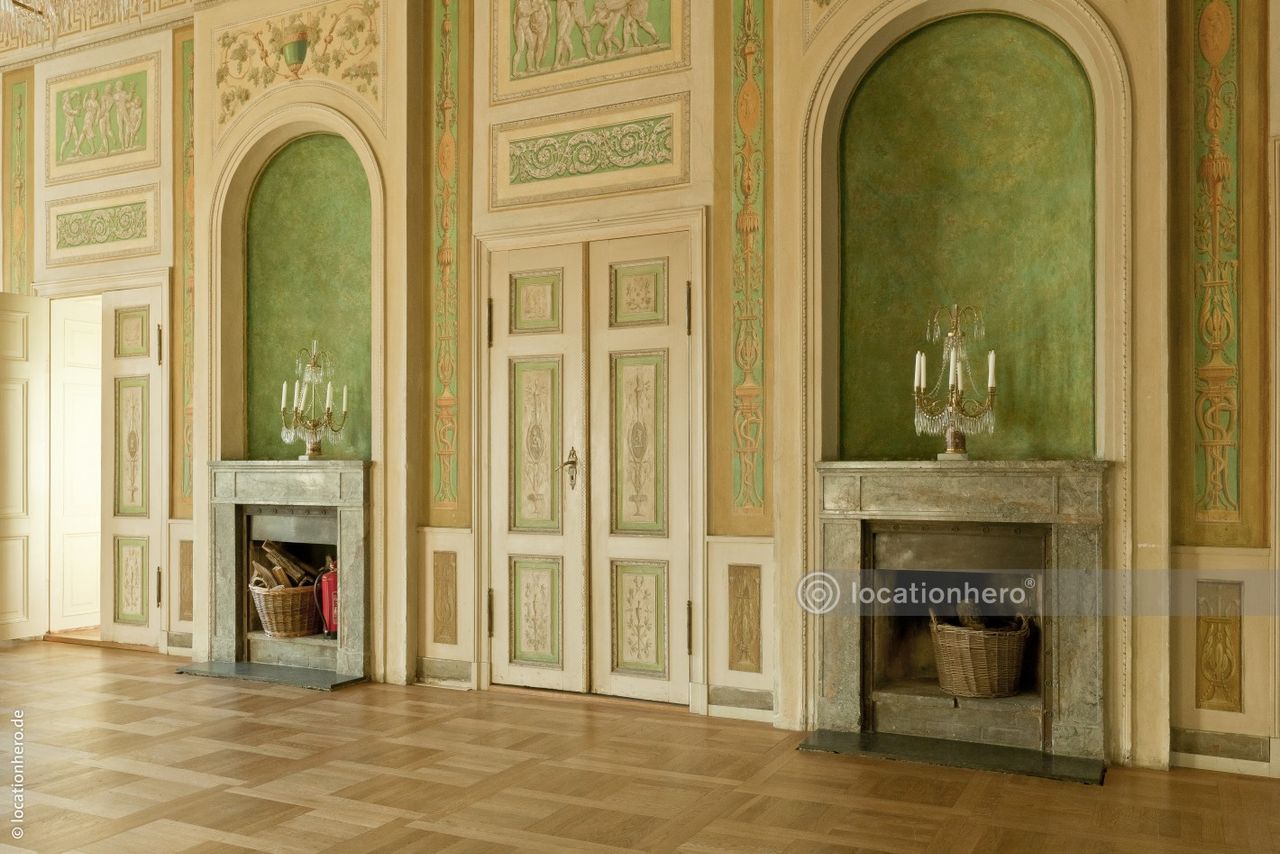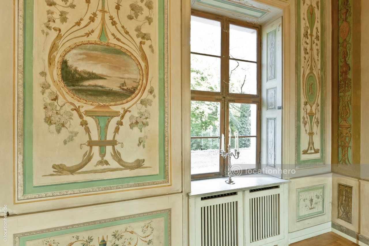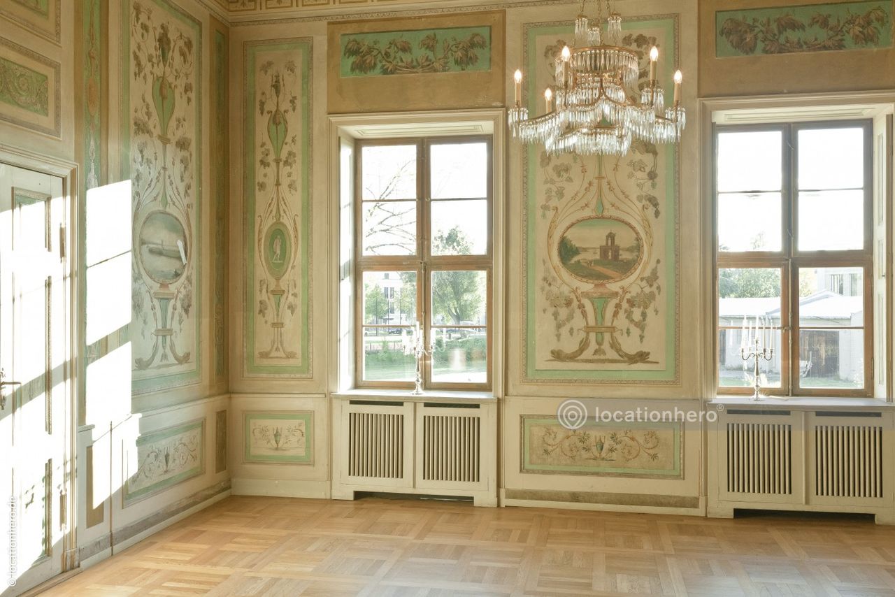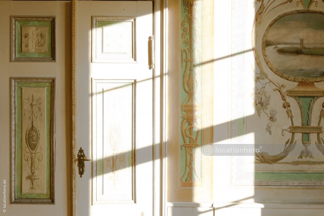 Sehr gut erhaltene Räumlichkeiten in einem frühklassizistischen Bau. Holzvertäfelungen, Wandmalereien, Kassettendecken zeigen innovative architektonische Elemente dieser Epoche.