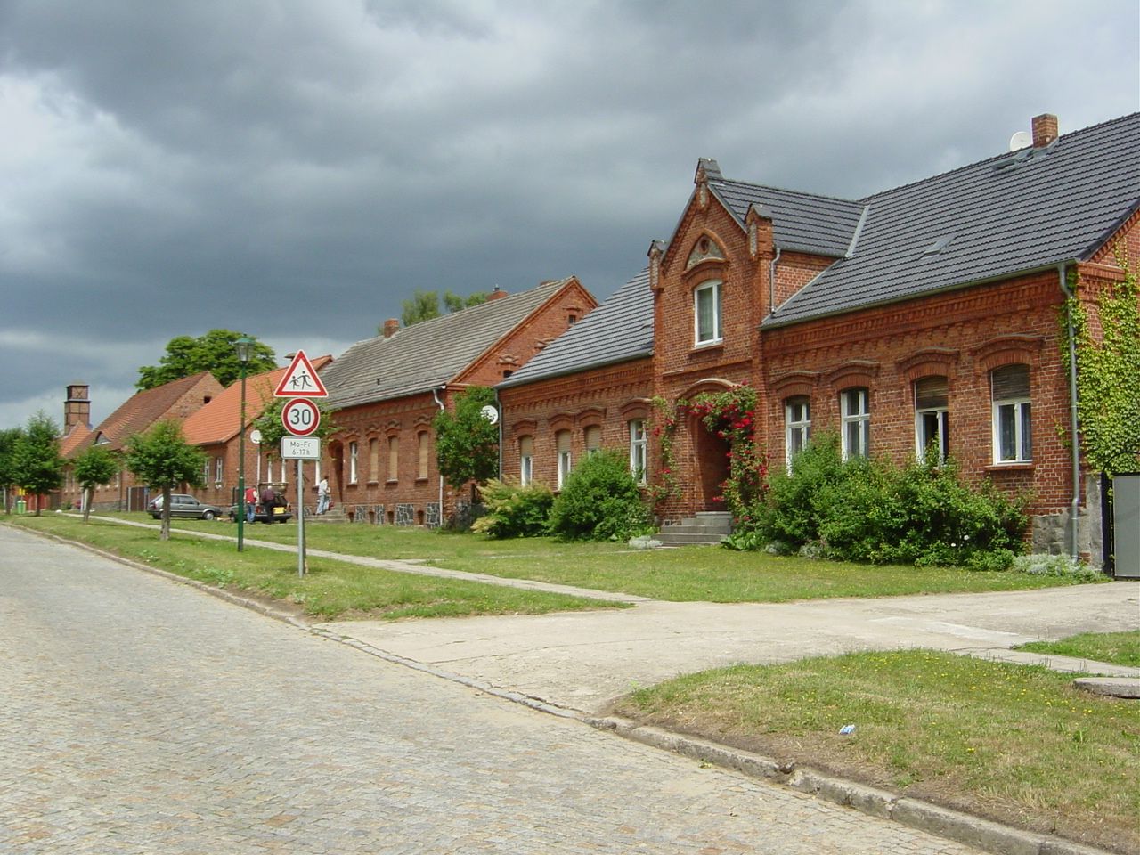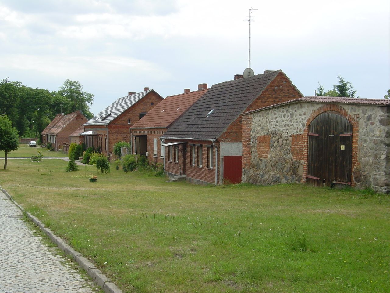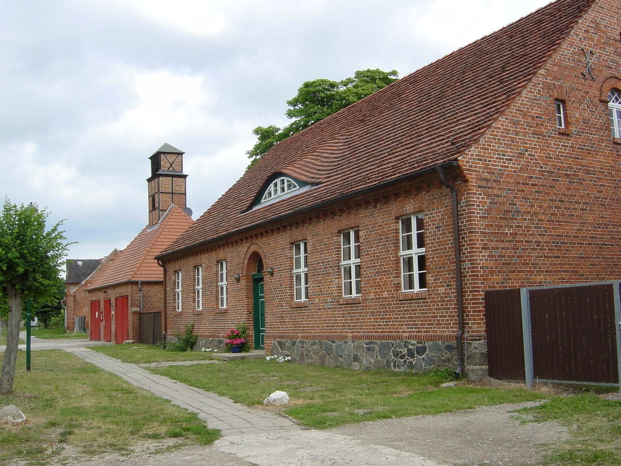 Idyllisches Dorf, größtenteils erhaltene ein- bis zweigeschossige Backsteinbauten an der Dorfstrasse, Feuerwehr, Schloss Krampfer, sowie Kirche aus Feldstein