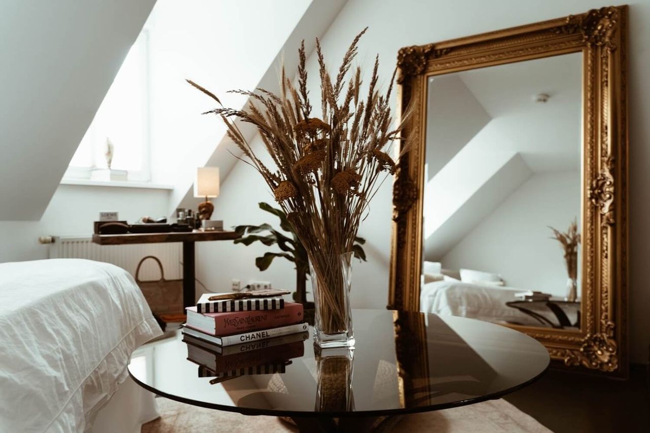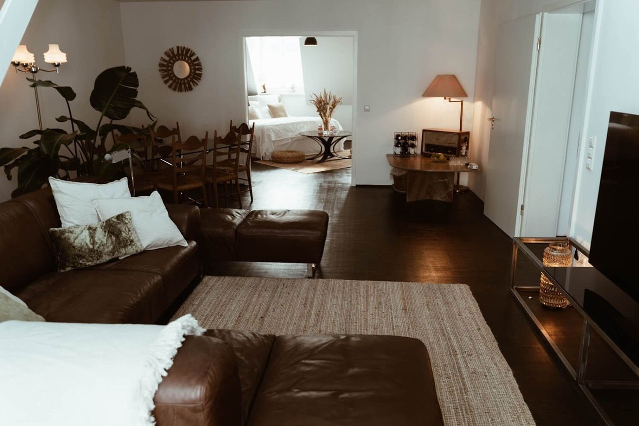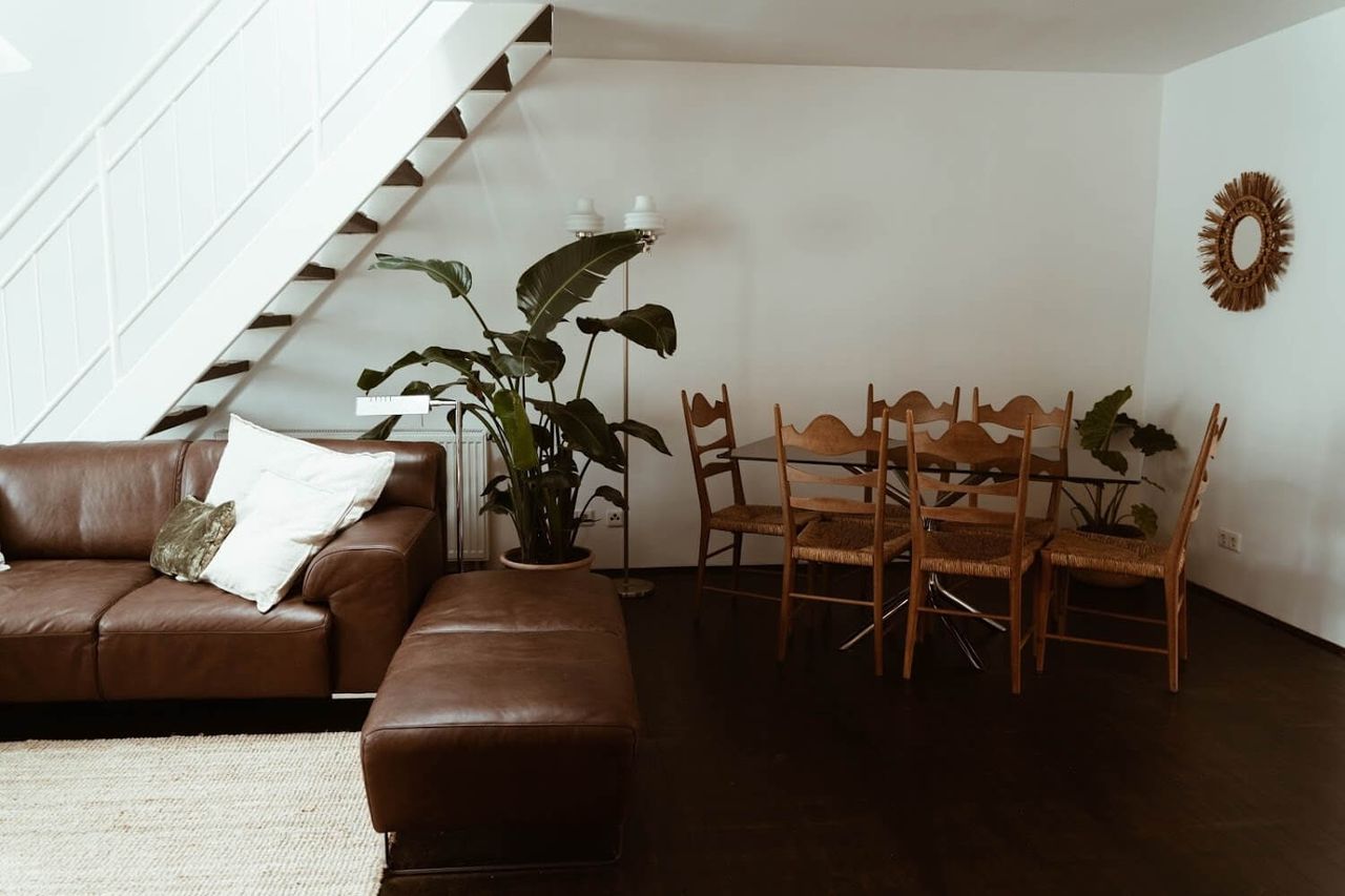 A space where mid-century, meets boho, meets industrial. With a base of dark wood floors, contrasting against white walls and a palette of neutral, earthy coloured décor - this Home Studio makes a warm yet moody set for photo, video and film shoots.