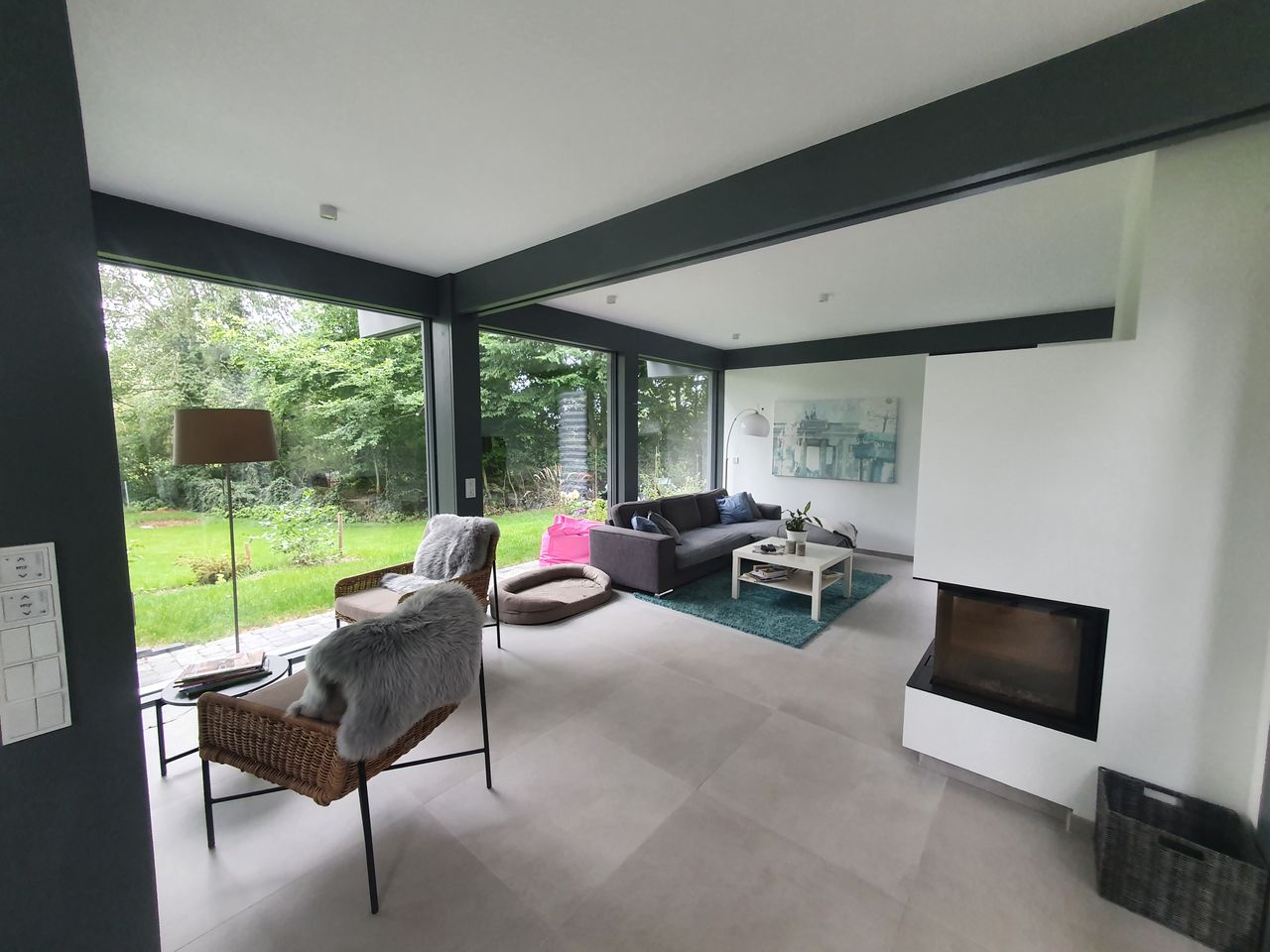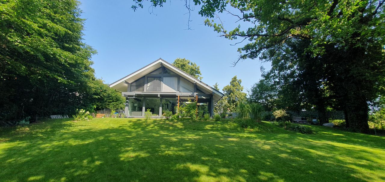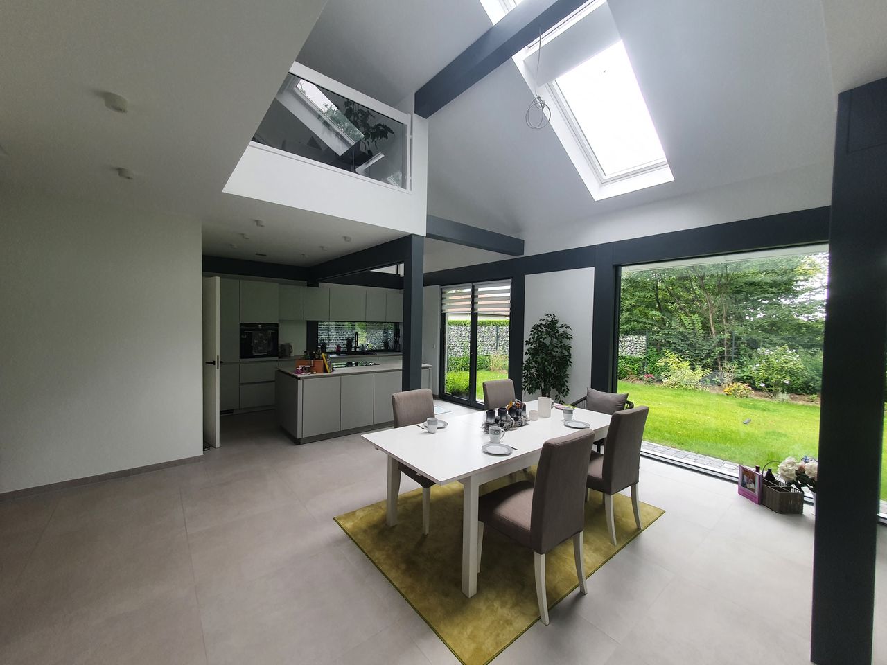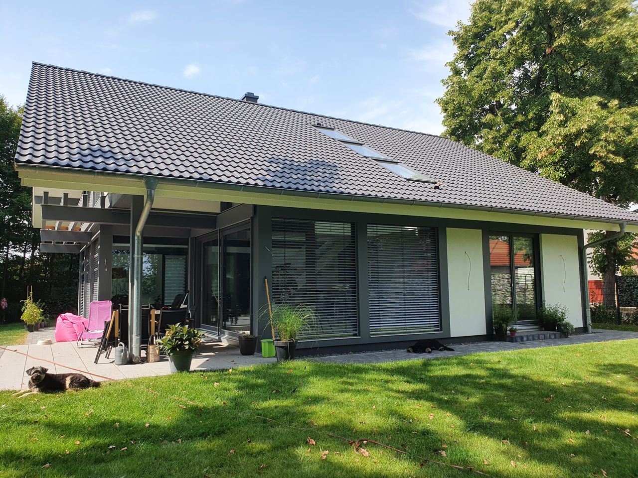 Lichtdurchfluteter, sehr großzügig und offen gestalteter Neubau in HUF-Haus Optik, graue Holzbalken in Kontrast zu weißen Wänden und hellgrauem Fußboden. Das Haus steht auf einem wunderschönen, großen Grundstück mit unverbaubarem Blick auf eine Rinderweide, eingerahmt in alten Baumbestand in einem schönen Dorf nahe Ludwigsfelde.