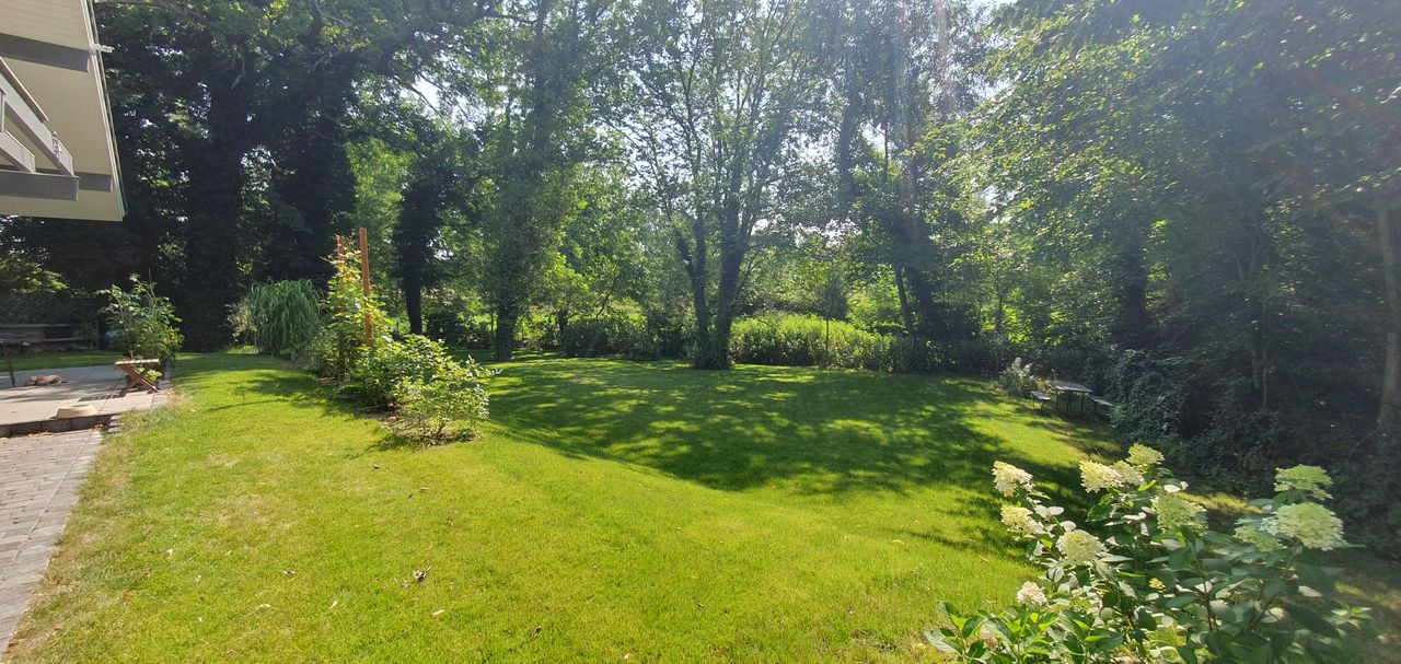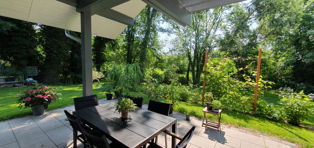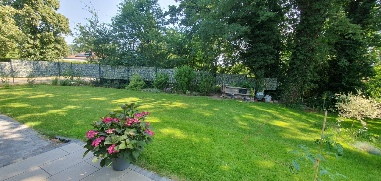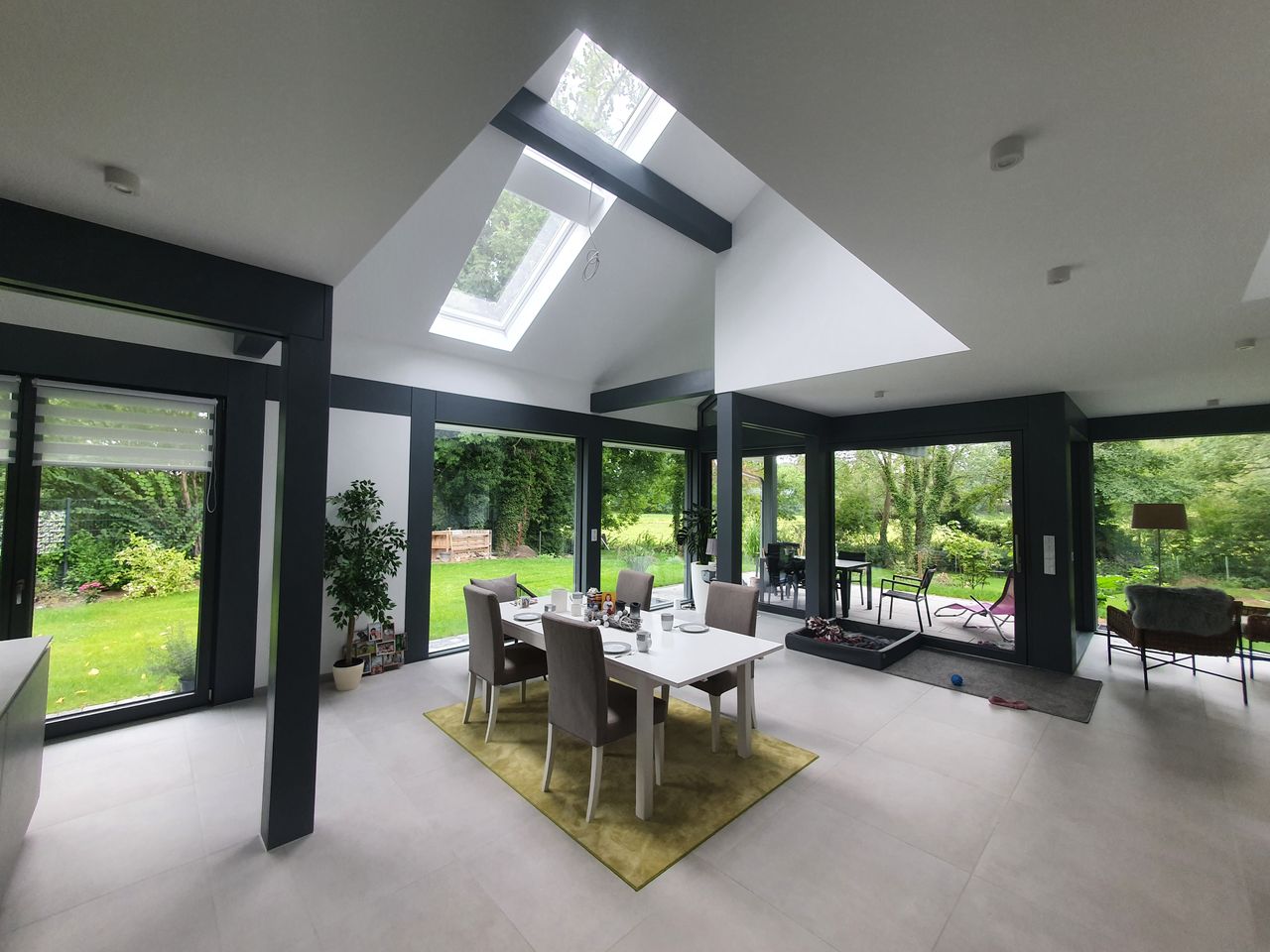 Lichtdurchfluteter, sehr großzügig und offen gestalteter Neubau in HUF-Haus Optik, graue Holzbalken in Kontrast zu weißen Wänden und hellgrauem Fußboden. Das Haus steht auf einem wunderschönen, großen Grundstück mit unverbaubarem Blick auf eine Rinderweide, eingerahmt in alten Baumbestand in einem schönen Dorf nahe Ludwigsfelde.