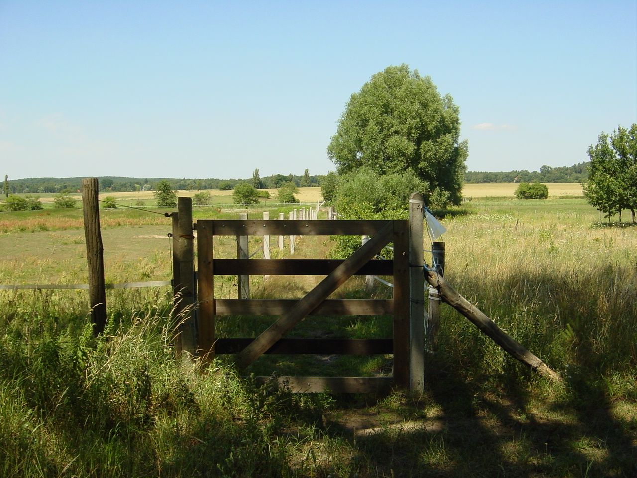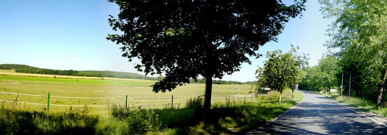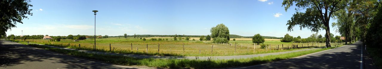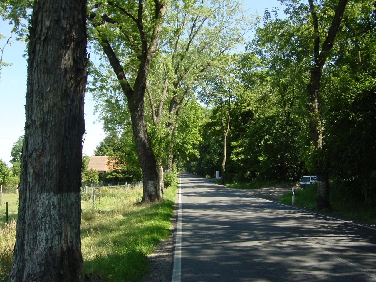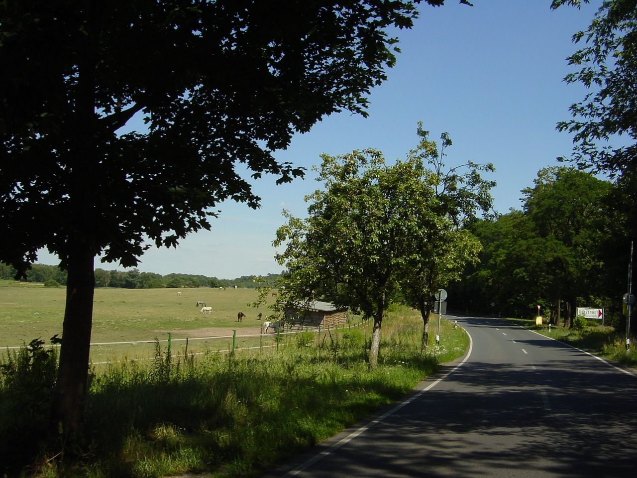 Brandenburgische Landstraße, dichter Wald, Pferdekoppeln, Wiesen, schöner Blick auf Teile der Gemeinde Langerwisch