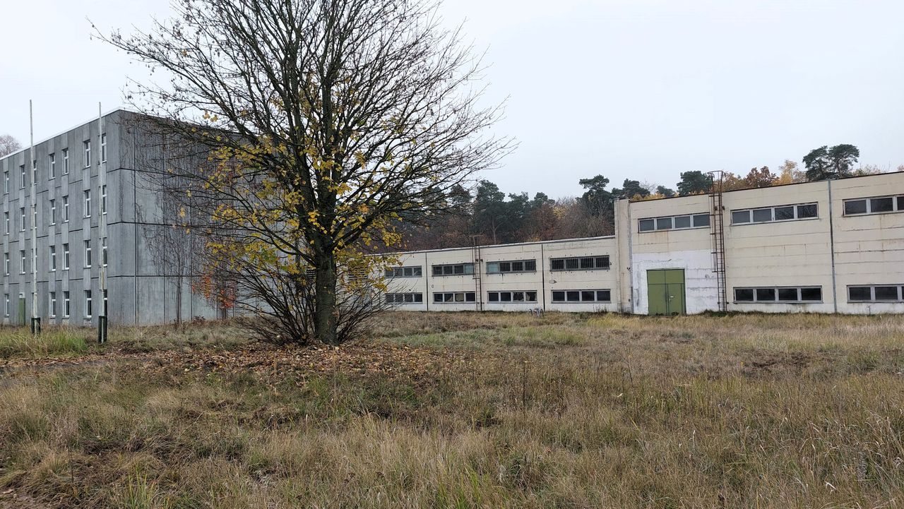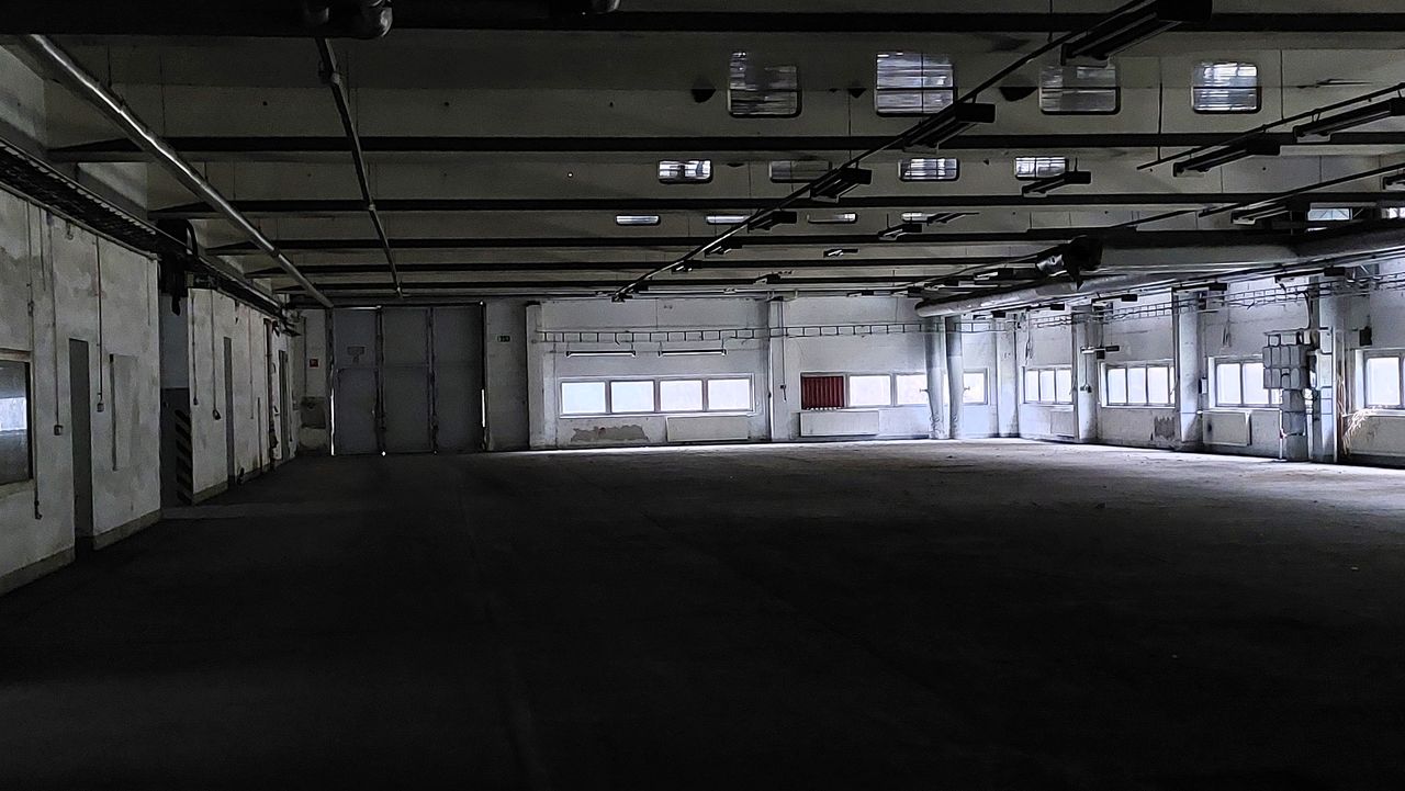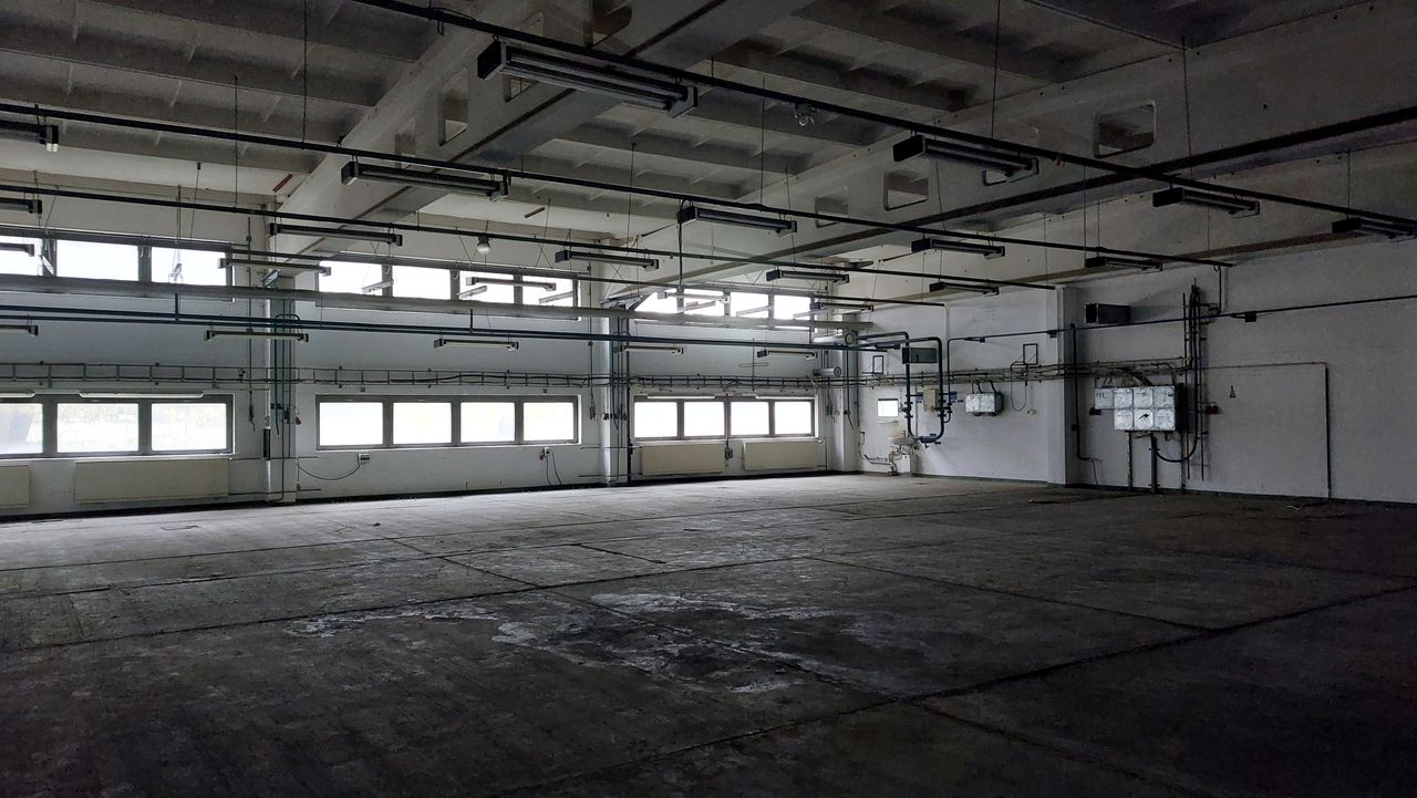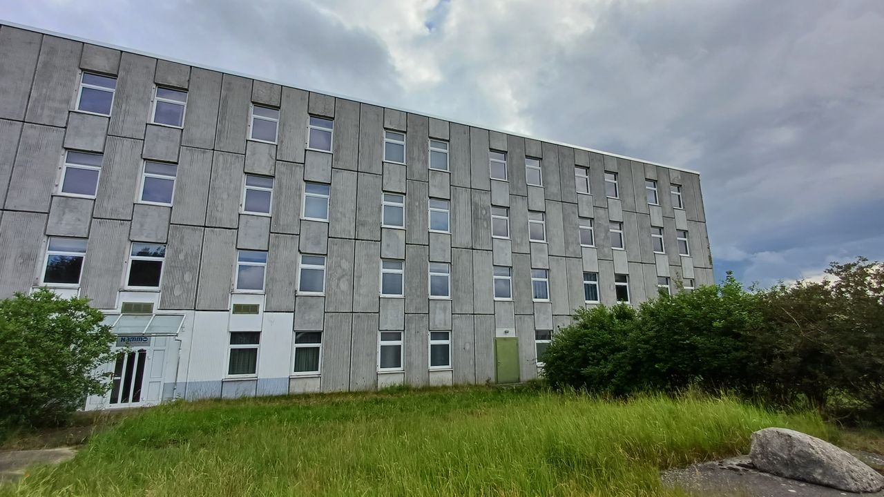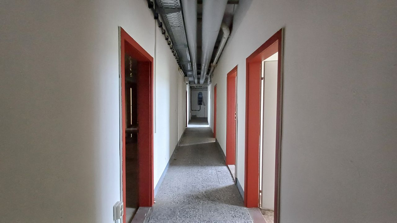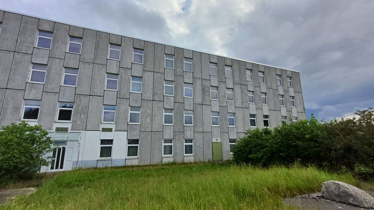 Leerstehendes Bürogebäude mit langen Fluren und diversen Produktionshallen auf abgelegenem Gelände.