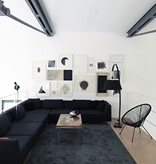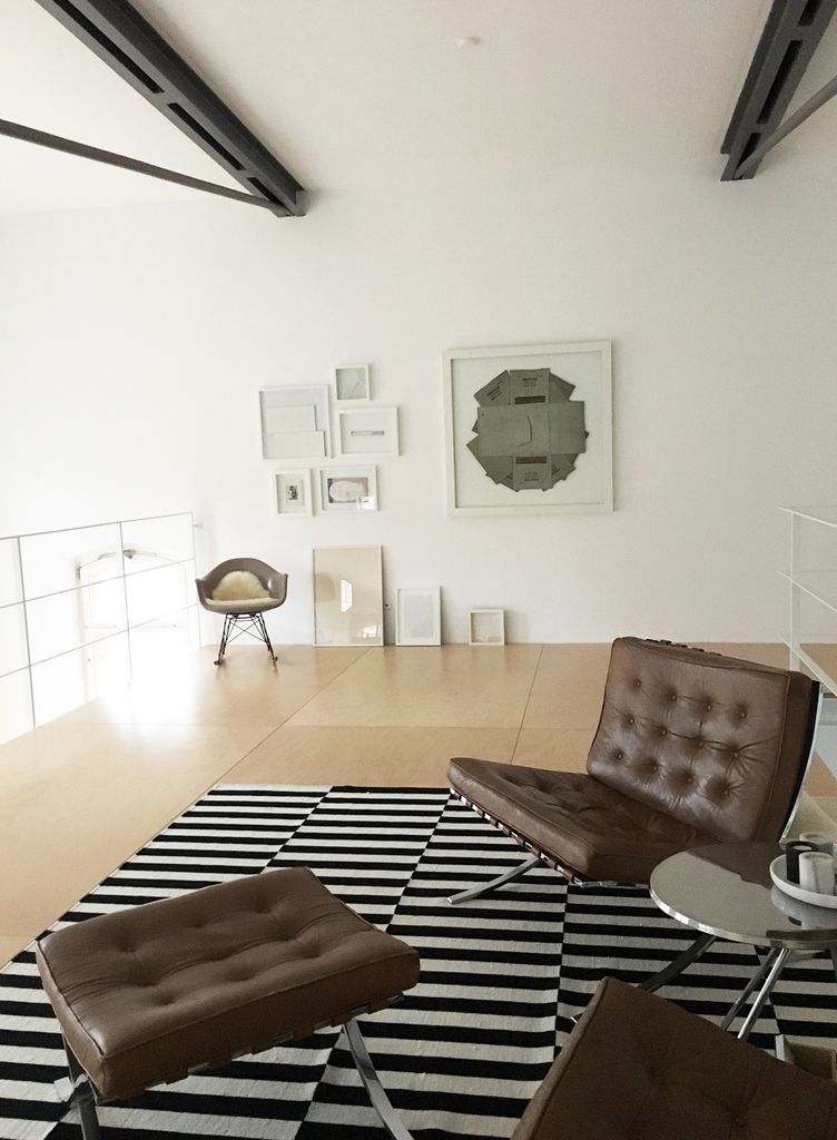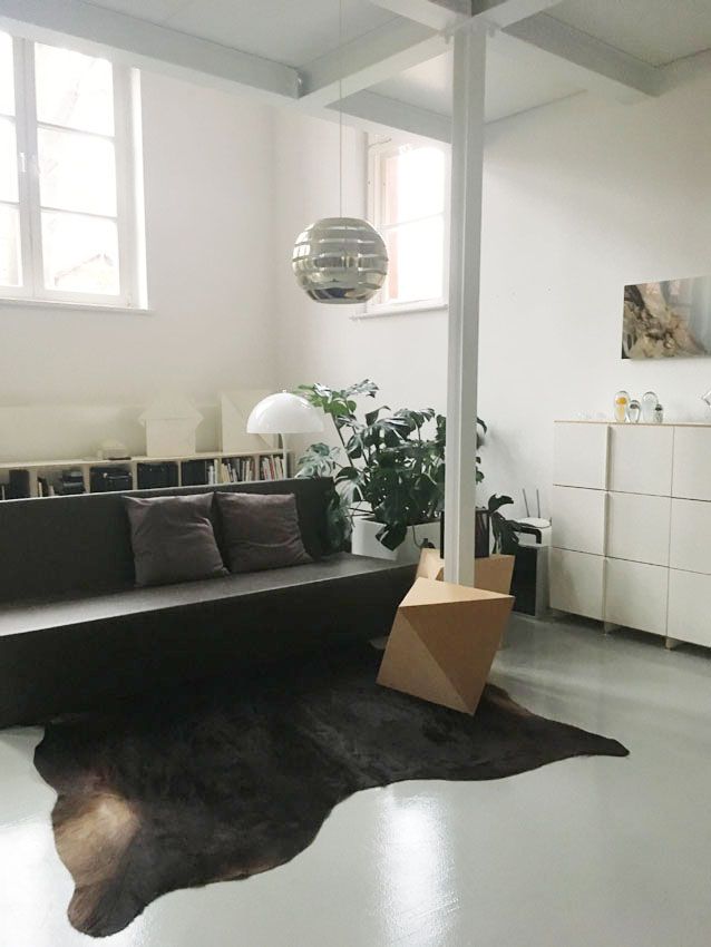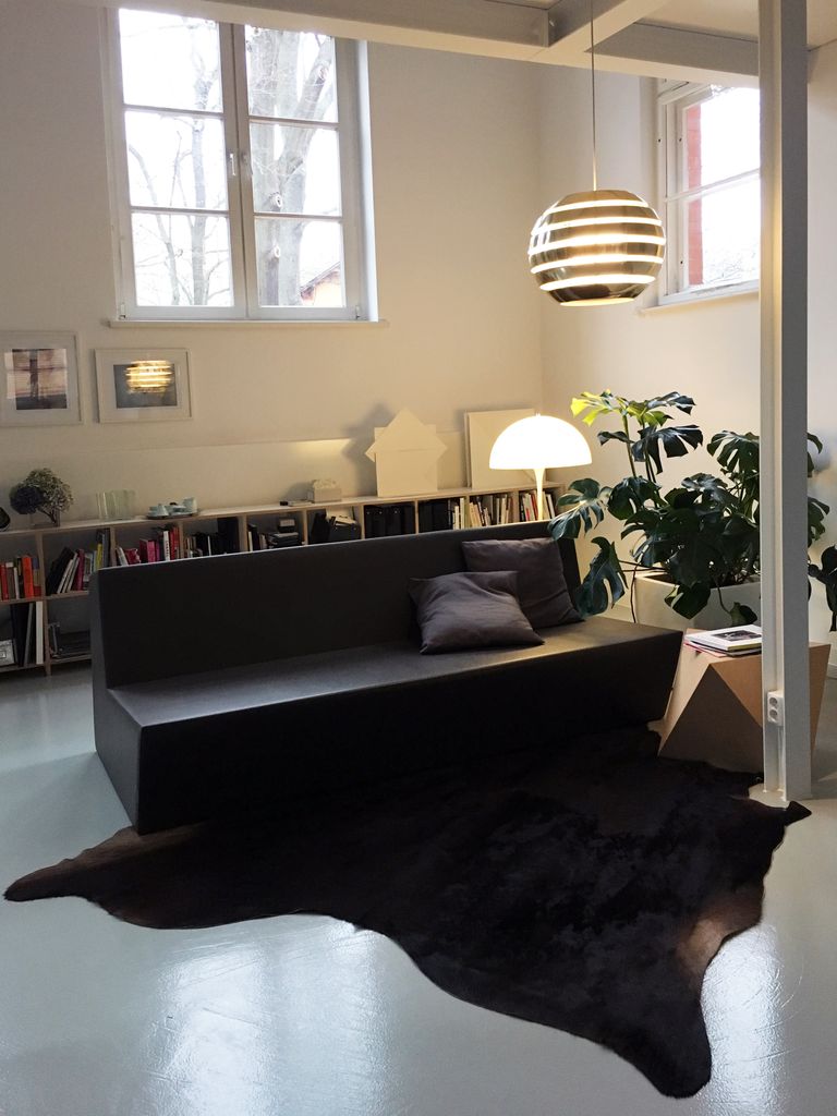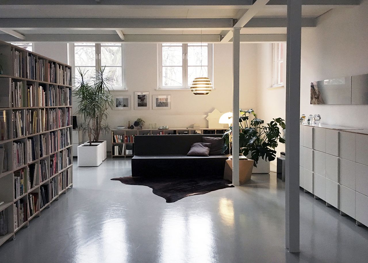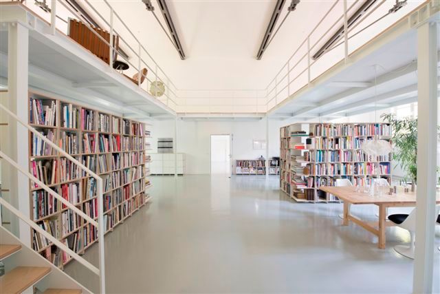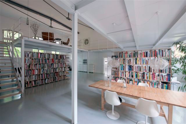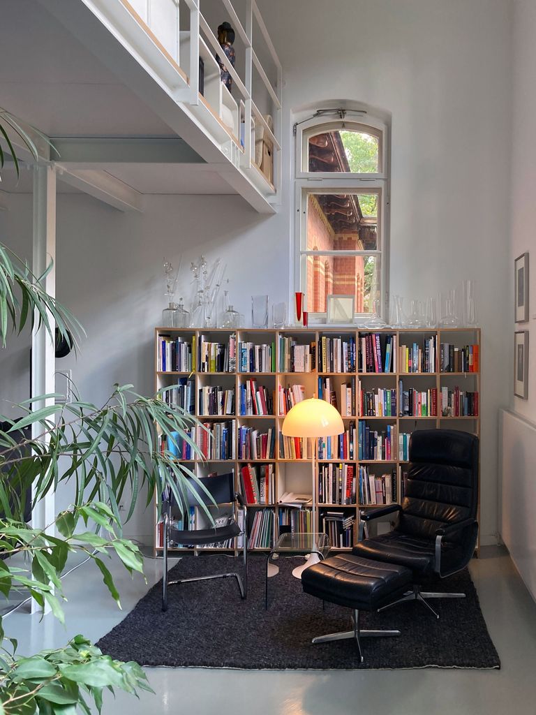 In die ehemalige Schwimmhalle (150 m2, 6.3 m hoch) mit historischer Tragstruktur wurde ein offenes Galeriegeschoss eingestellt, um den Charakter der Halle zu erhalten und zugleich eine wohnliche Atmosphäre zu gewinnen. Bücherregale dienen als offene Raumteiler. Grosse Fenster sorgen einerseits für viel Licht und den Blick in Baumkronen eines 200 Jahre alten Baumbestandes auf dem leicht verwilderten grossen Grundstück. Angrenzend gibt es eine zweite, etwas kleinere Halle (60m2, Höhe ca. 4.6m), der leer ist und als Atelier und Ausstellungsraum genutzt wird.