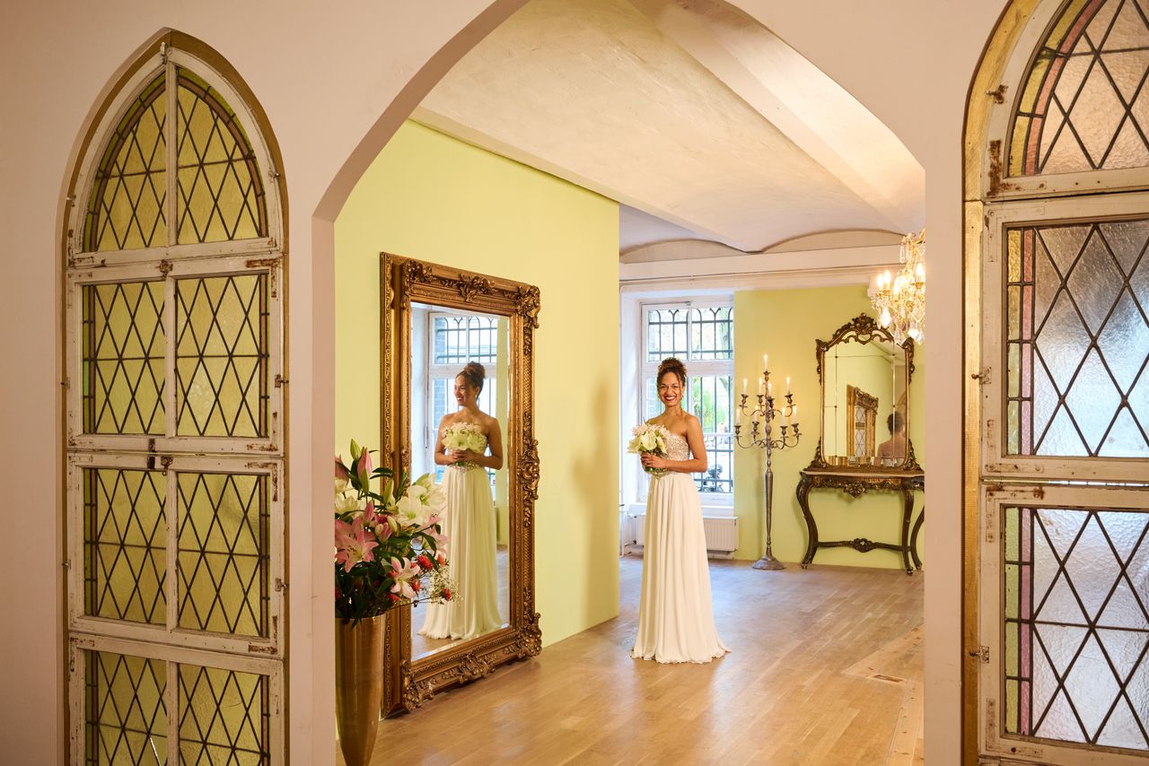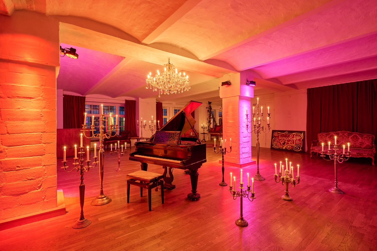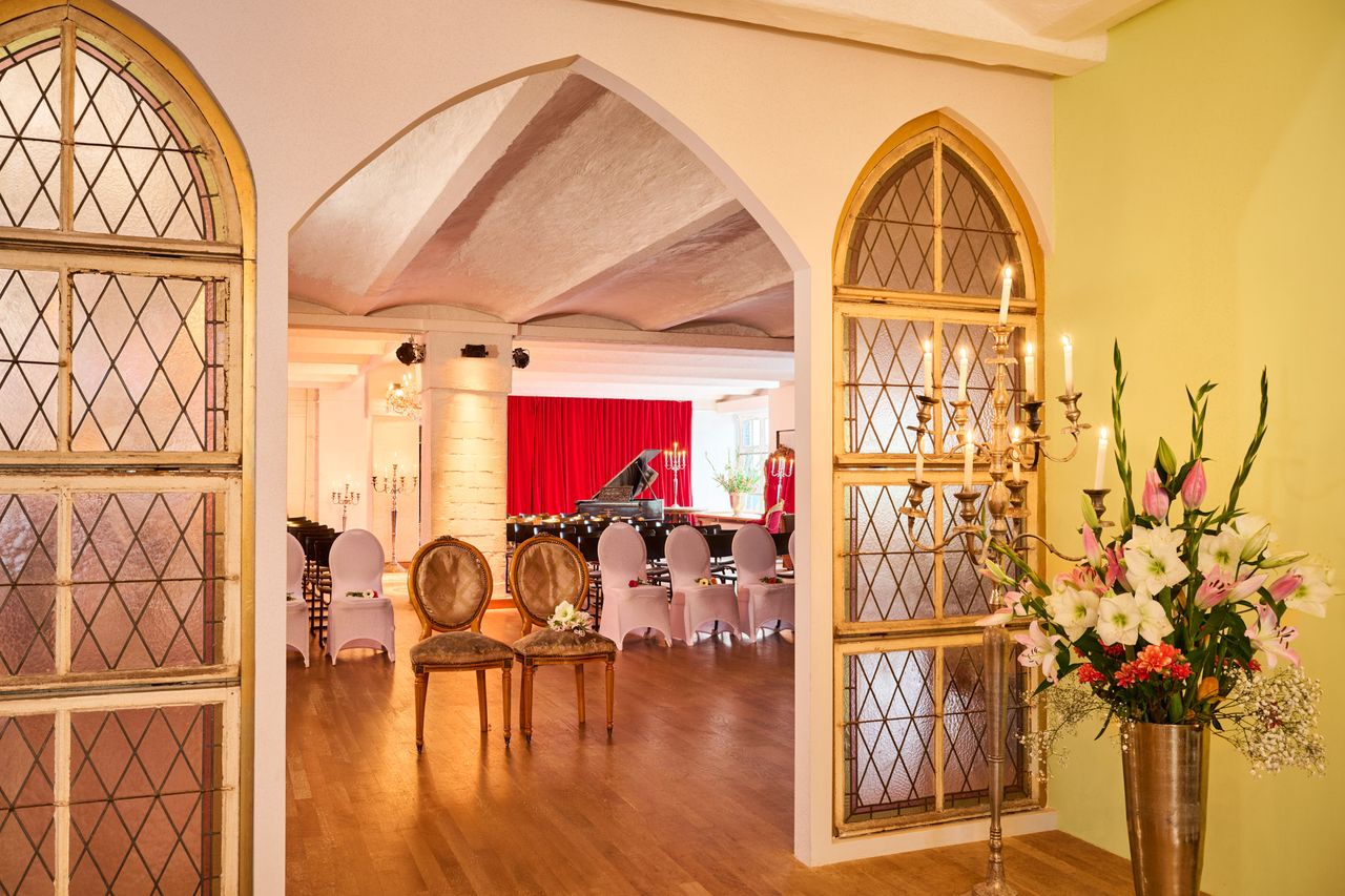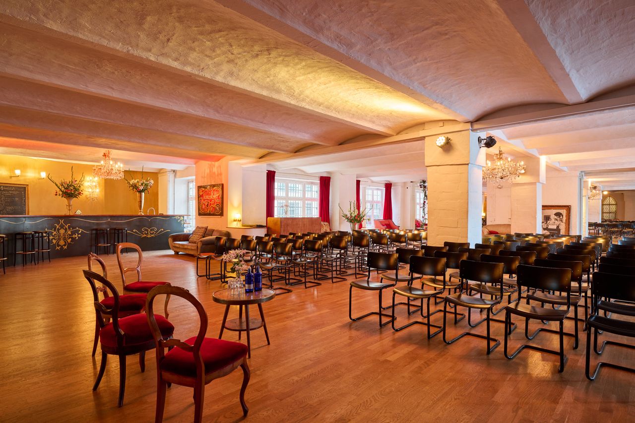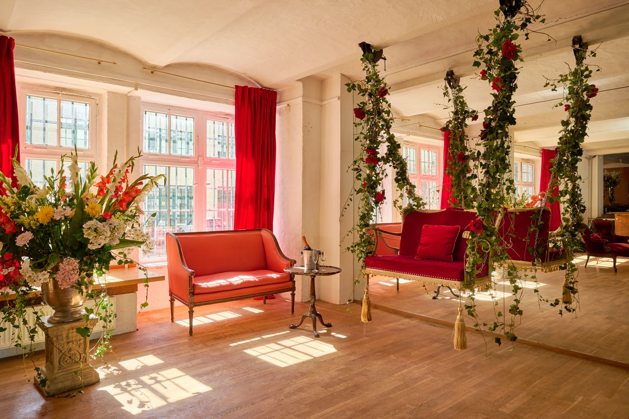 Der großzügige Loftbereich verbindet industrielle Architektur mit stilvollen Designelementen und schafft eine vielseitige Drehumgebung. Historische Kirchenfenster, antike Möbel, Kandelaber und florale Arrangements verleihen dem Raum eine besondere Atmosphäre, die an die Salonkultur der 1920er-Jahre erinnert und gleichzeitig einen modernen, urbanen Charakter bewahrt.