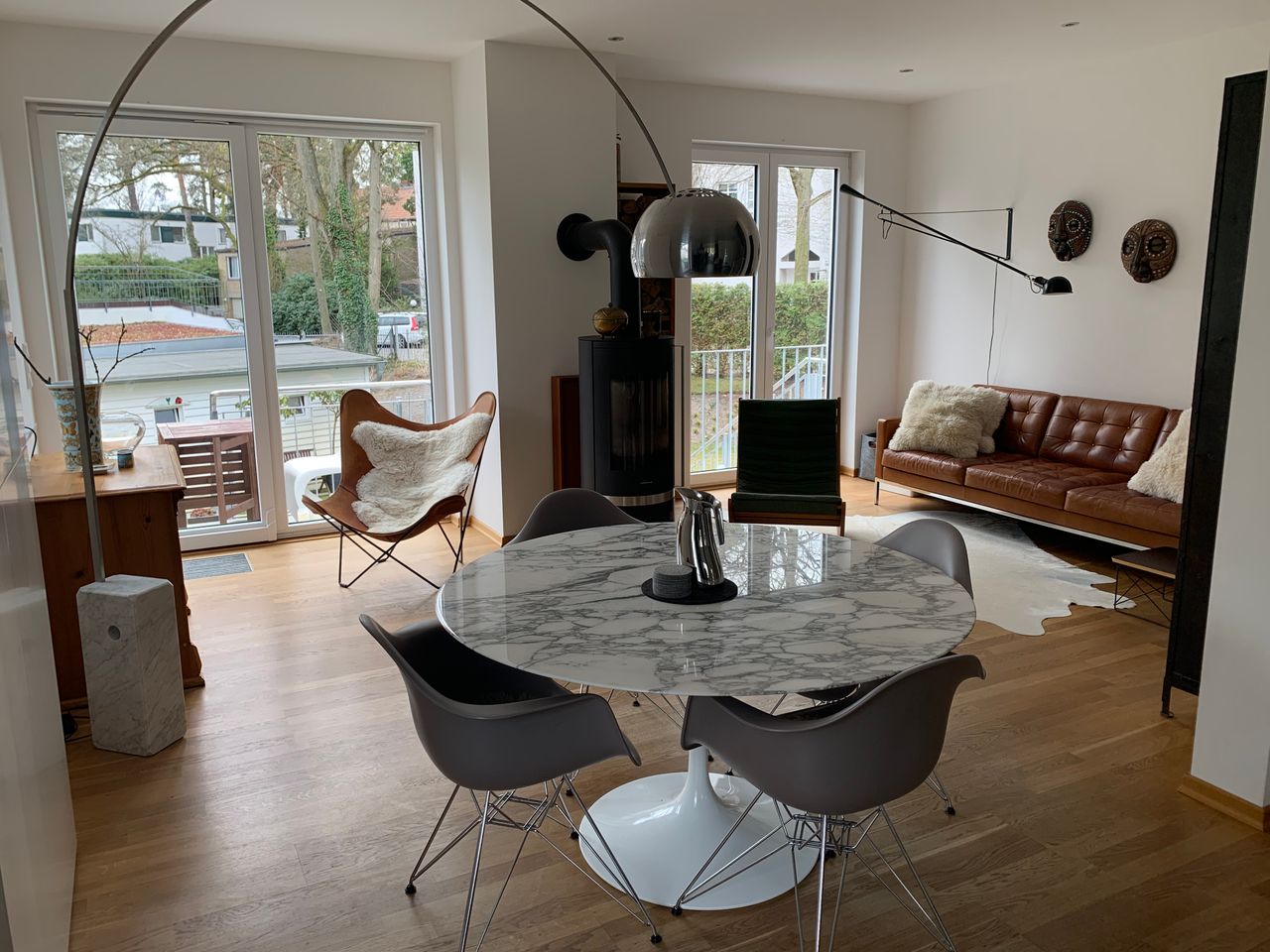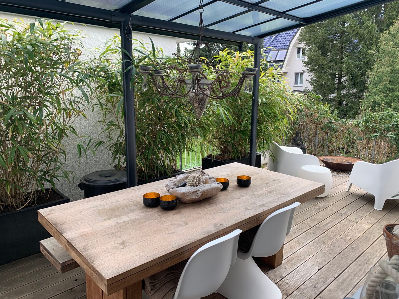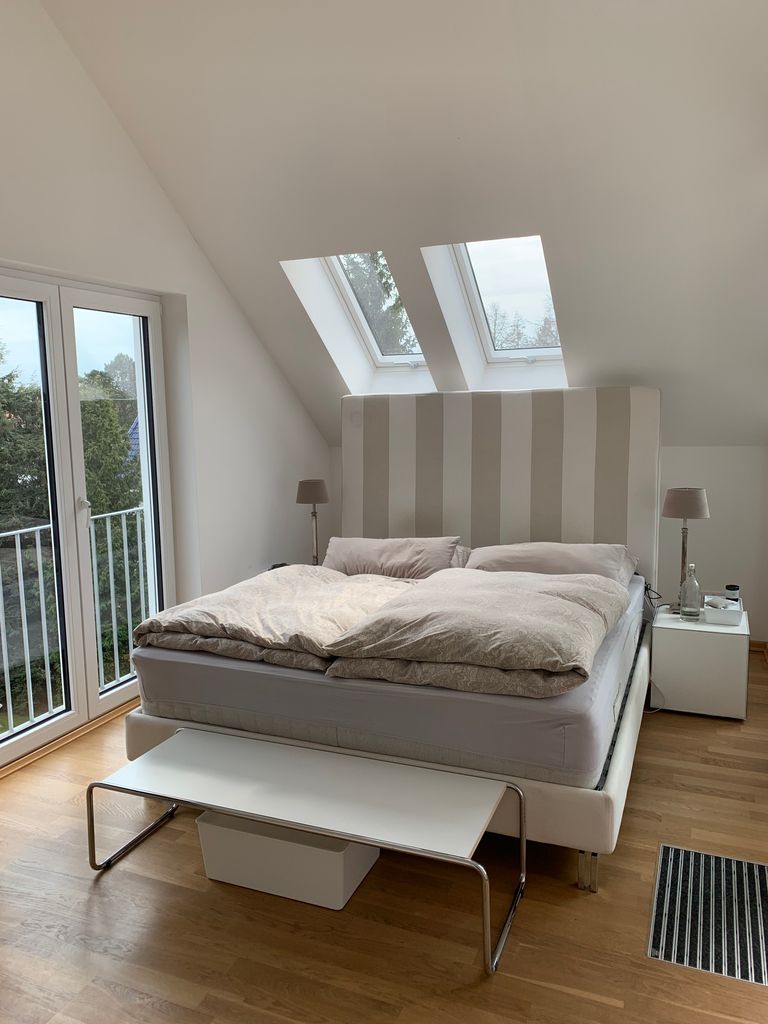 Es gibt 3 Terrassen, eine gartenseitig im UG, eine ebenerdig neben der Küche und eine im Dachgeschoss.