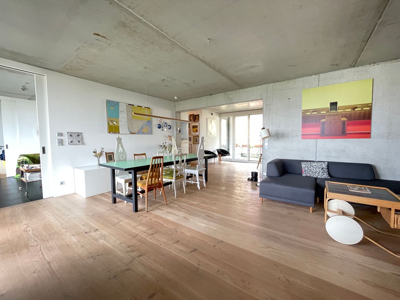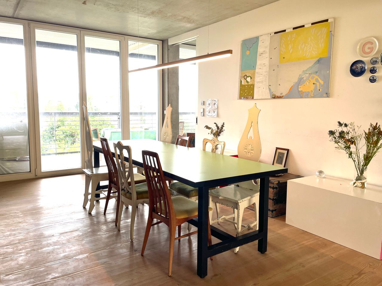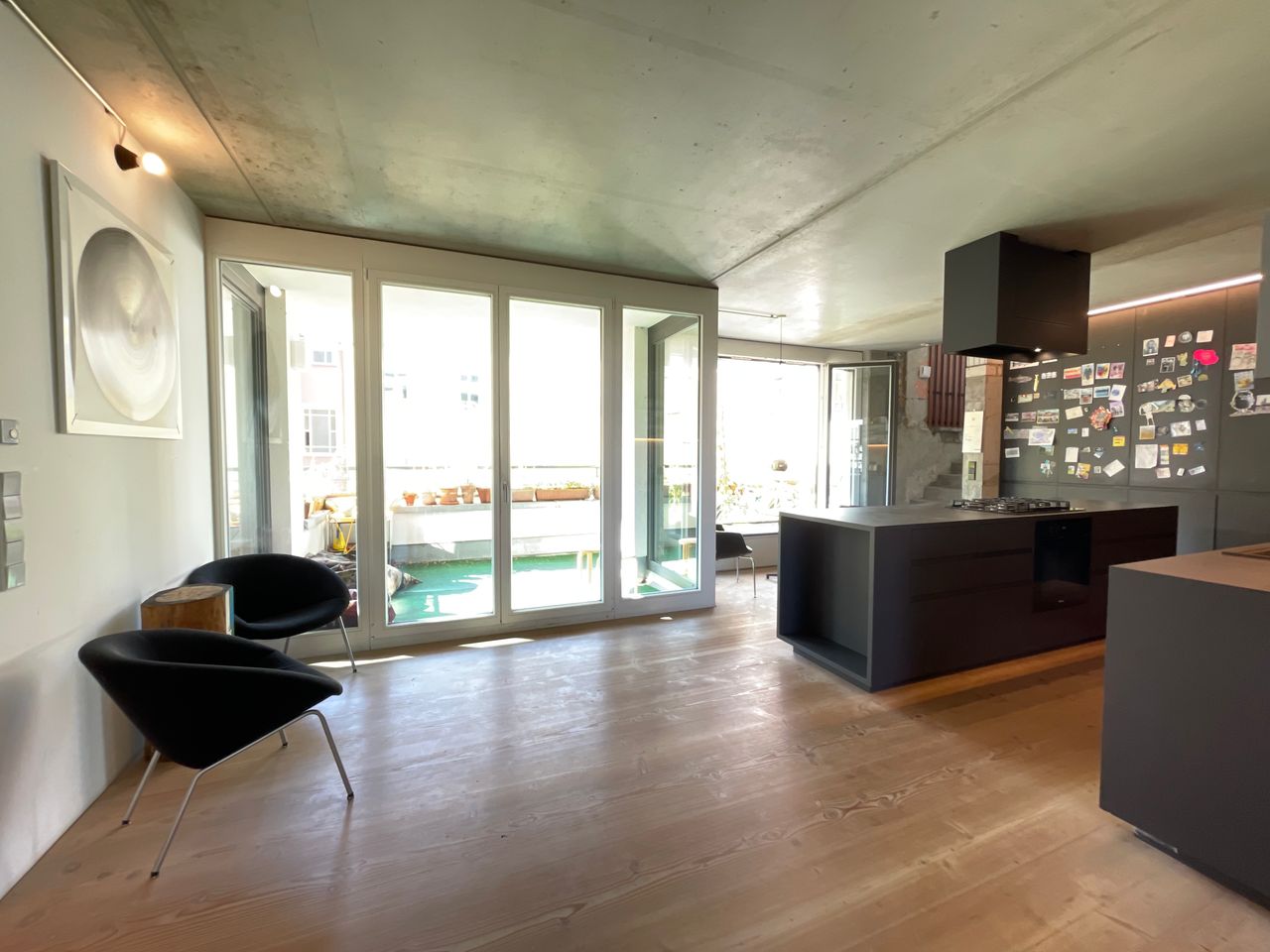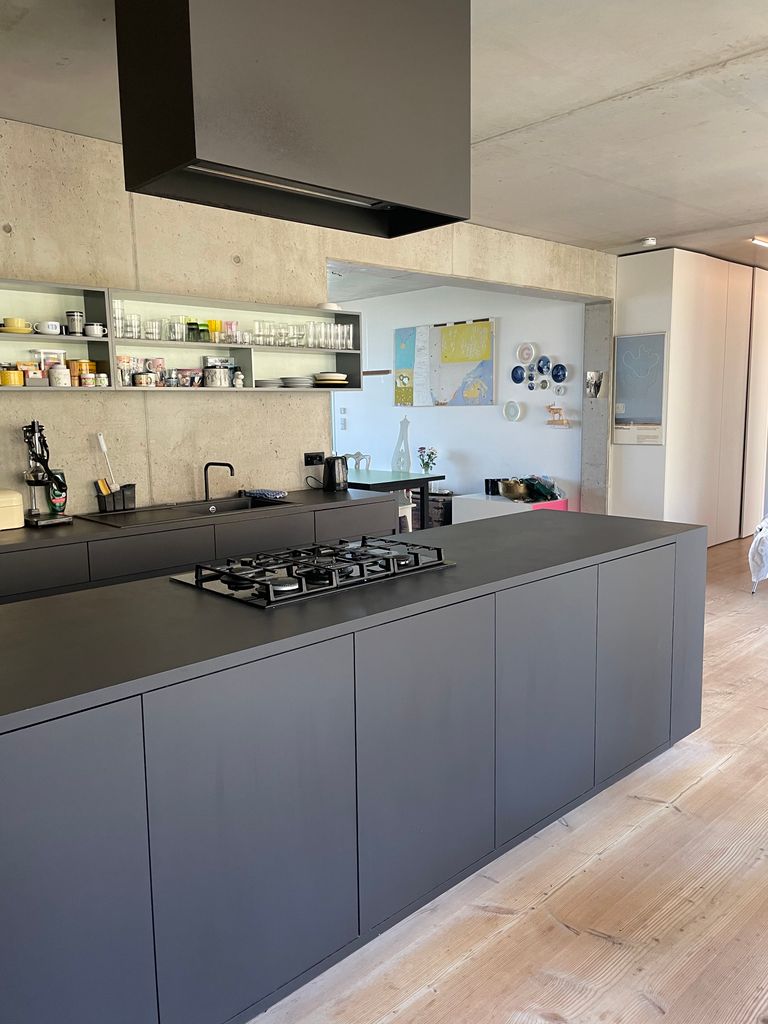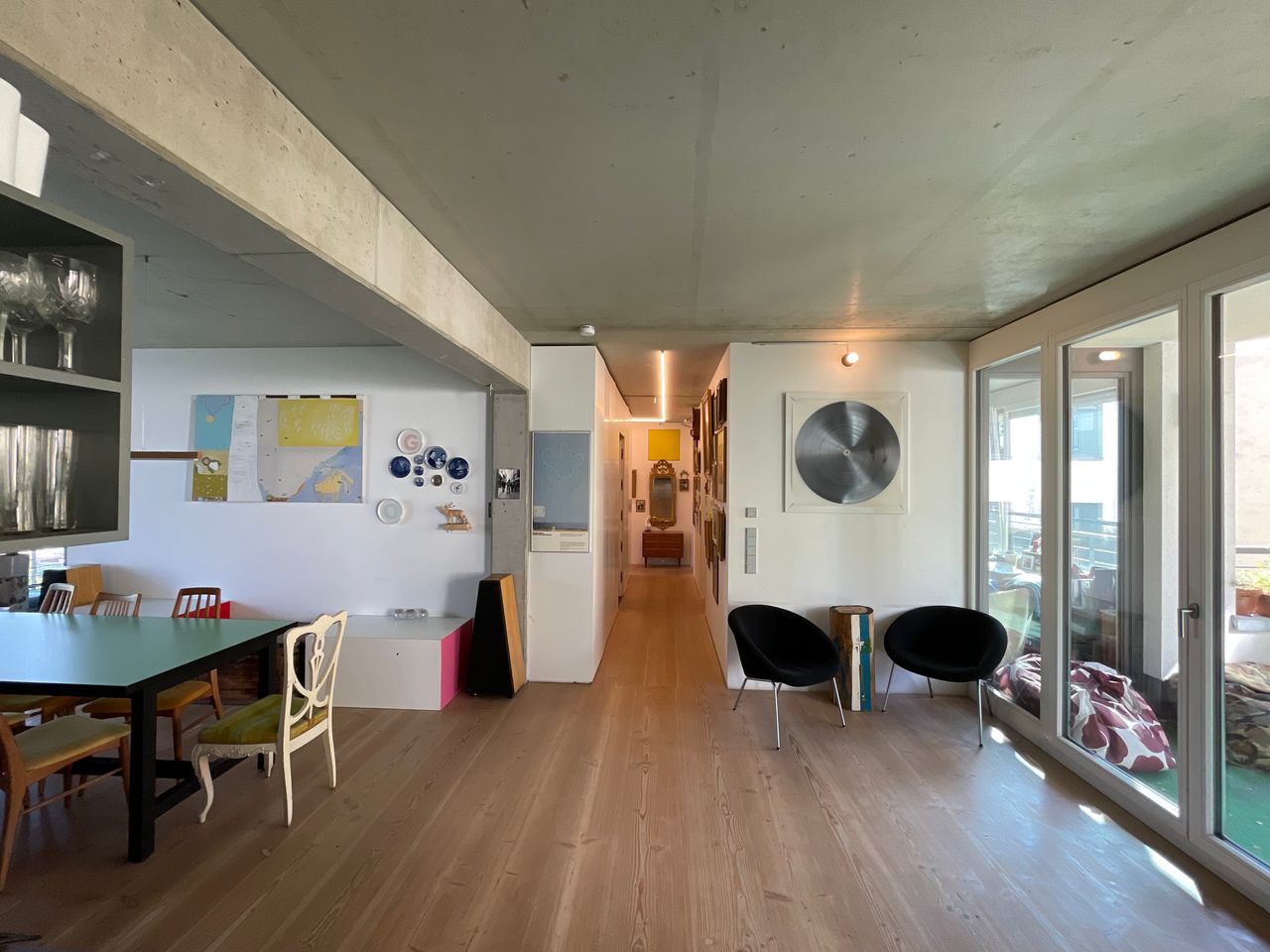 Große Weitläufige offene Loft Wohnung mit Raumhohen Fenstern zu 2 Seiten. Moderne Eingerichtet, mit viel Sichtbeton. Zwei Balkone auf beiden Seiten bieten Platz für Beleuchtung oder zur lagerung von Cases. Schickes schwarz gefliestes Bad und Große Wohnkühe mit coolem athrazit farbenem Küchentresen.