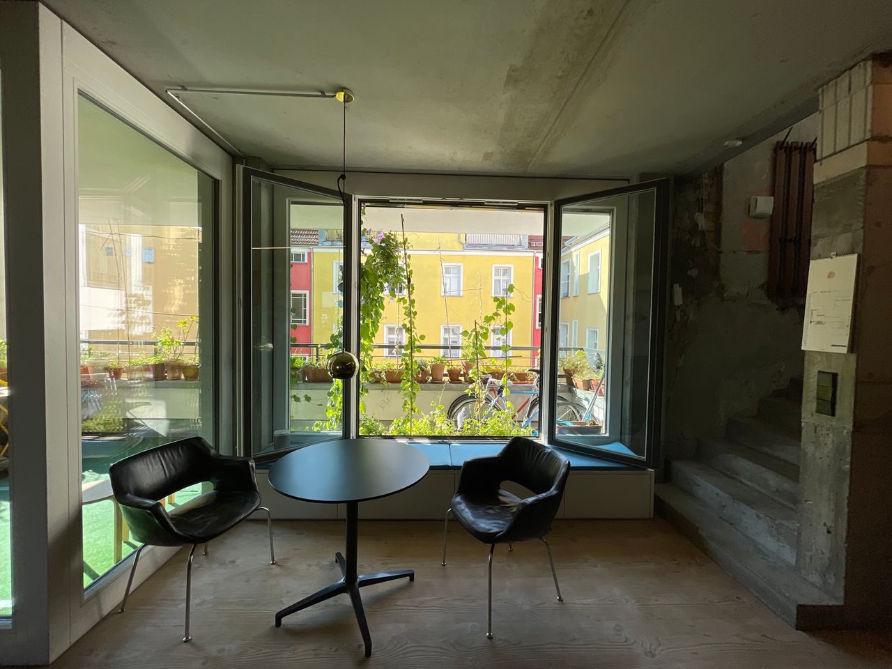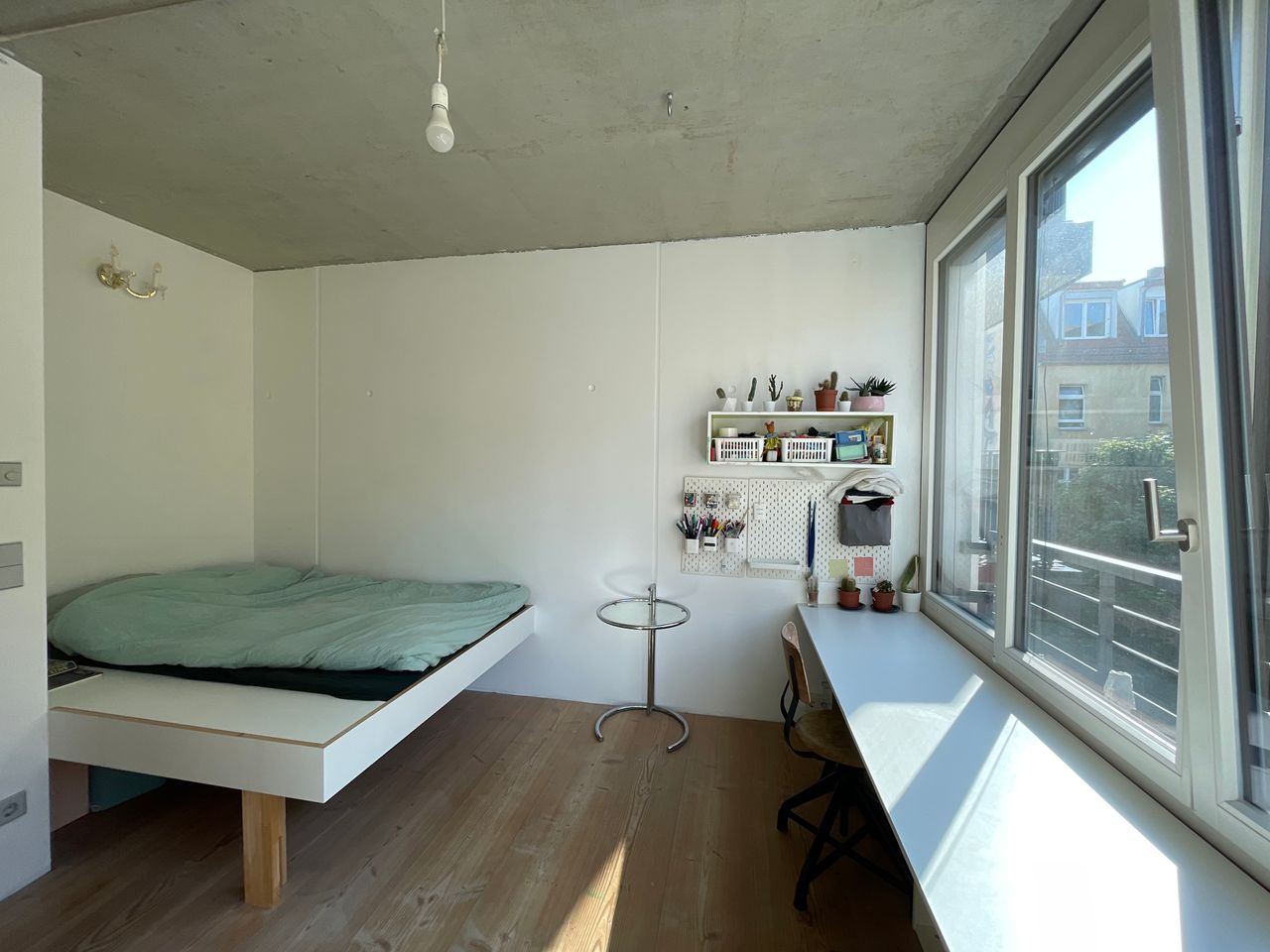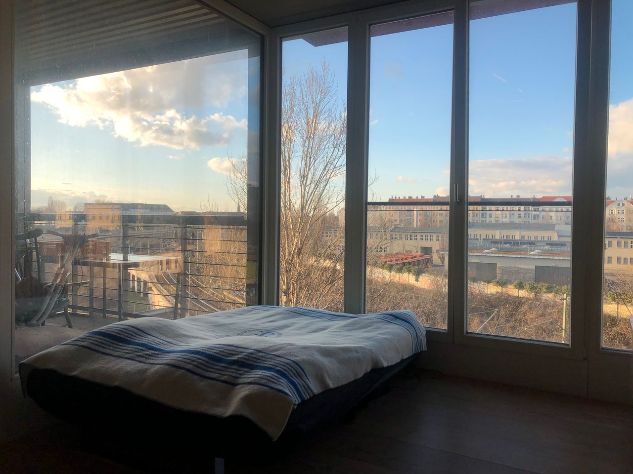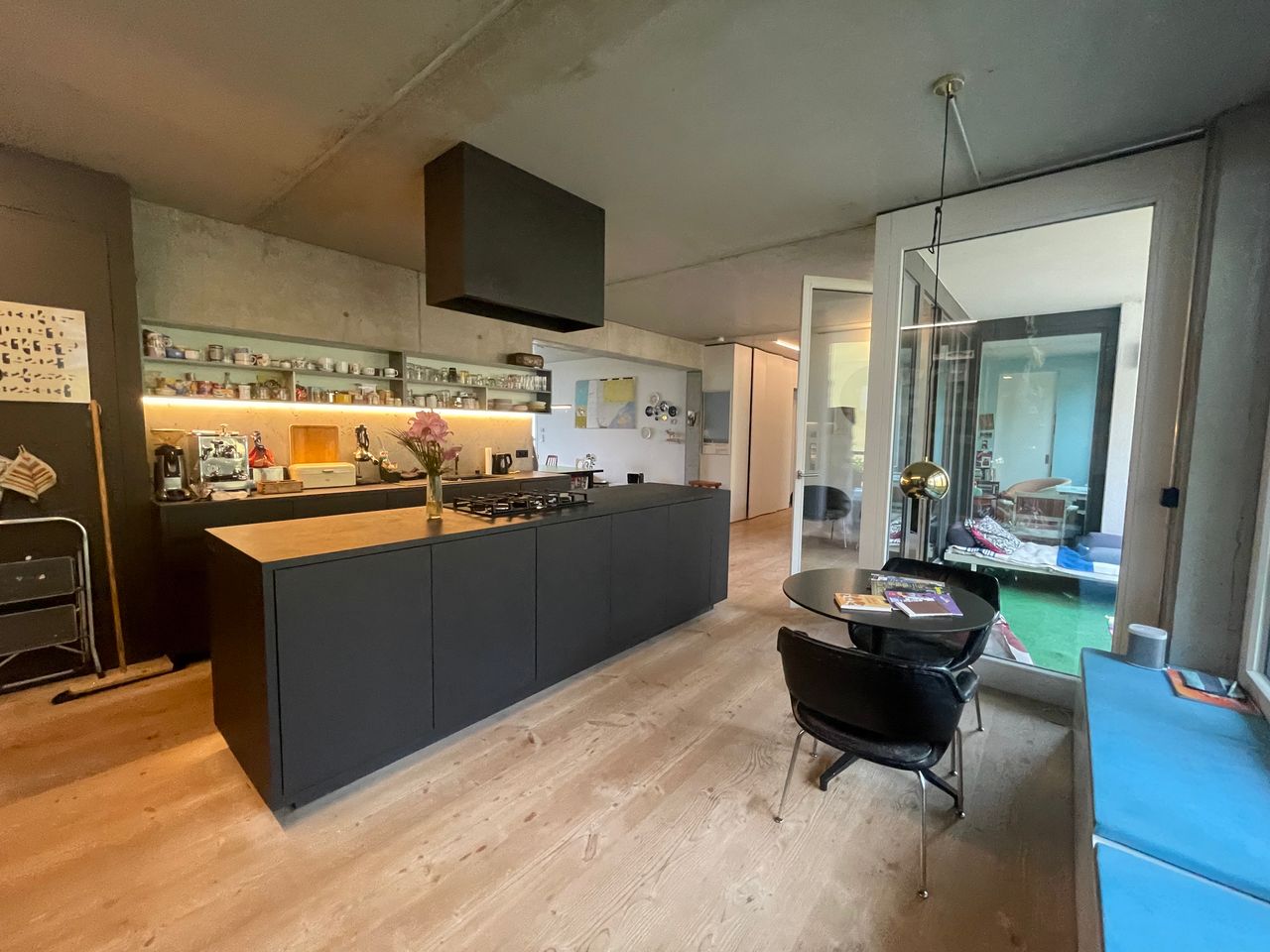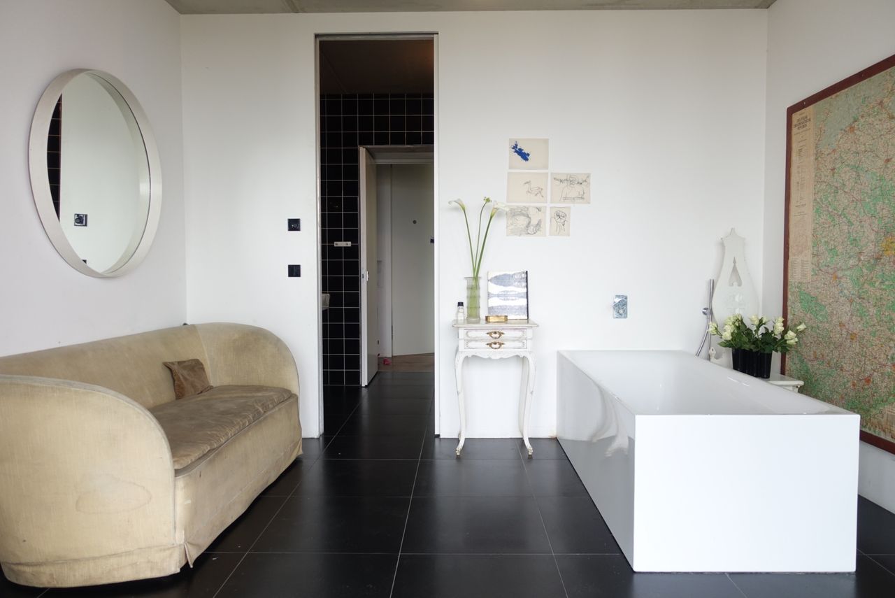 Große Weitläufige offene Loft Wohnung mit Raumhohen Fenstern zu 2 Seiten. Moderne Eingerichtet, mit viel Sichtbeton. Zwei Balkone auf beiden Seiten bieten Platz für Beleuchtung oder zur lagerung von Cases. Schickes schwarz gefliestes Bad und Große Wohnkühe mit coolem athrazit farbenem Küchentresen.