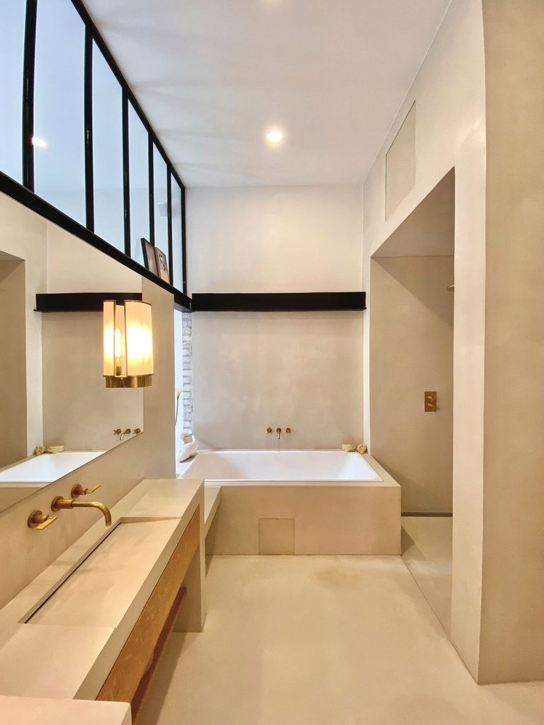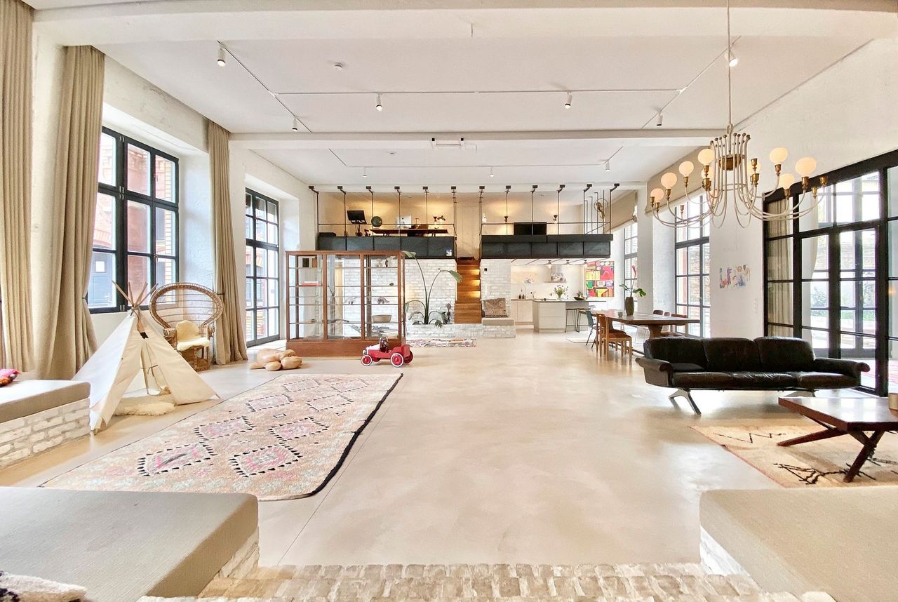 Loftwohnung mit erlesener Einrichtung auf 280 qm im Erdgeschoss. Die Terrasse misst 30 qm. Die Decke ist 4,40 Meter hoch und mit Akustikelementen versehen. Sie verfügt über zwei individuell gestaltete Bäder und eine Sauna.