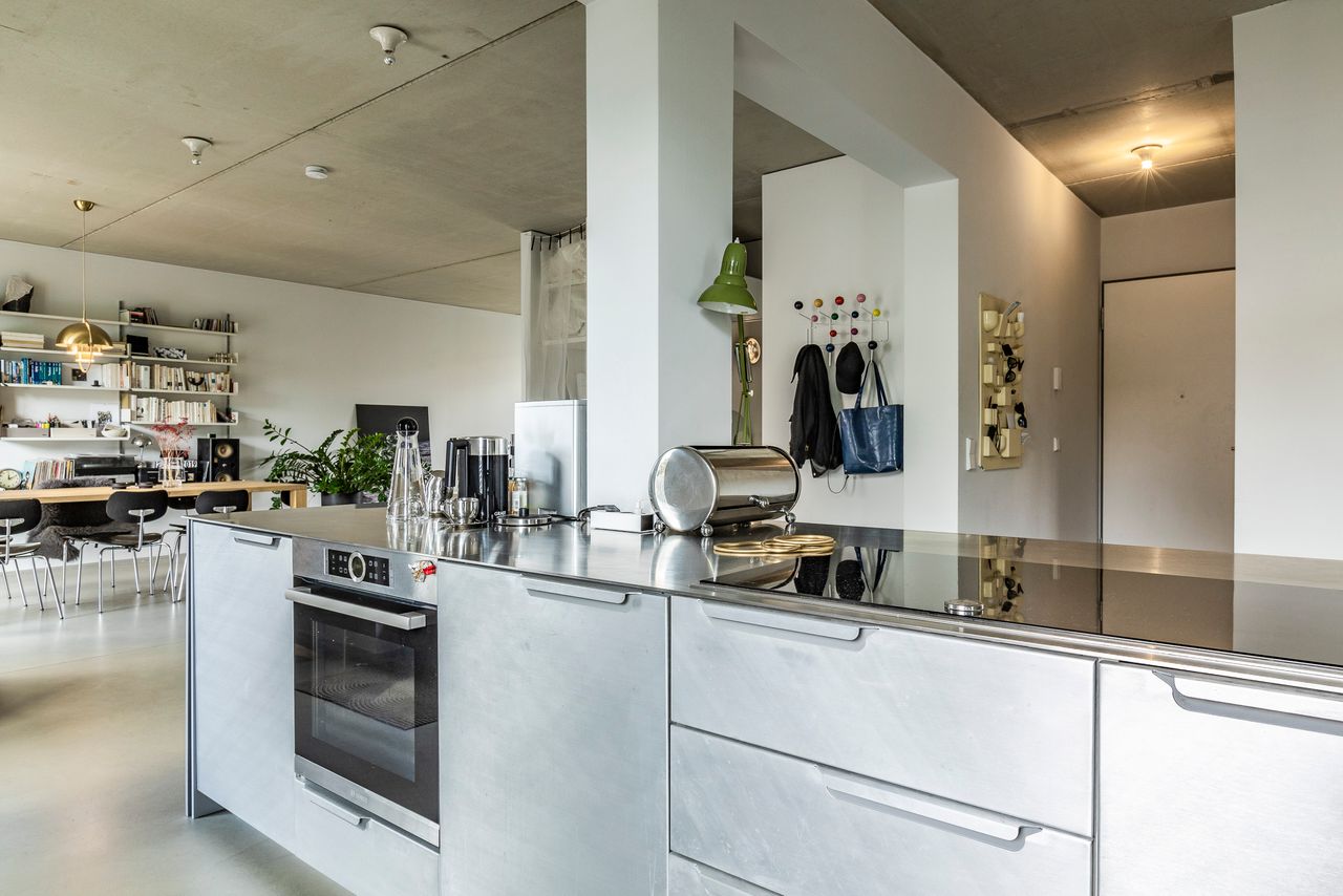 Großzügiges Loftapartment mit Wohnküche und Arbeitsbereich in einem. Angrenzend ein Balkon mit städtischem Umfeld. Außer dem Masterbad gibt es ein Gästebad angrenzend an das Schlafzimmer. Es dominieren Farbtöne zwischen weiß und schwarz.