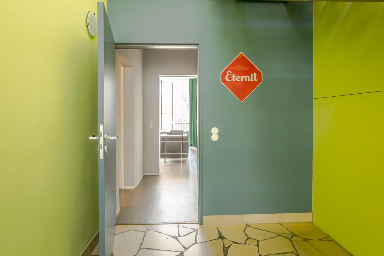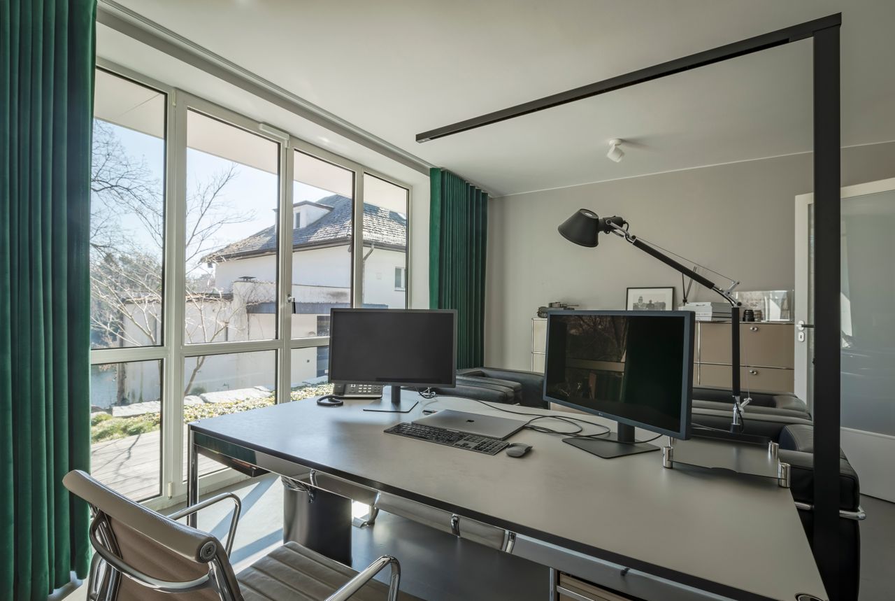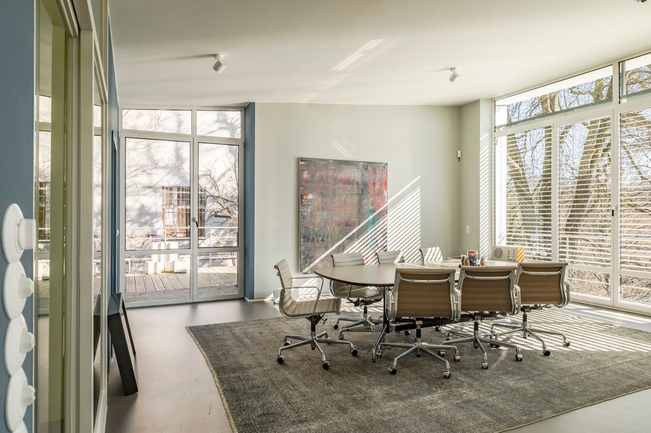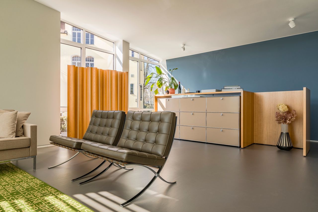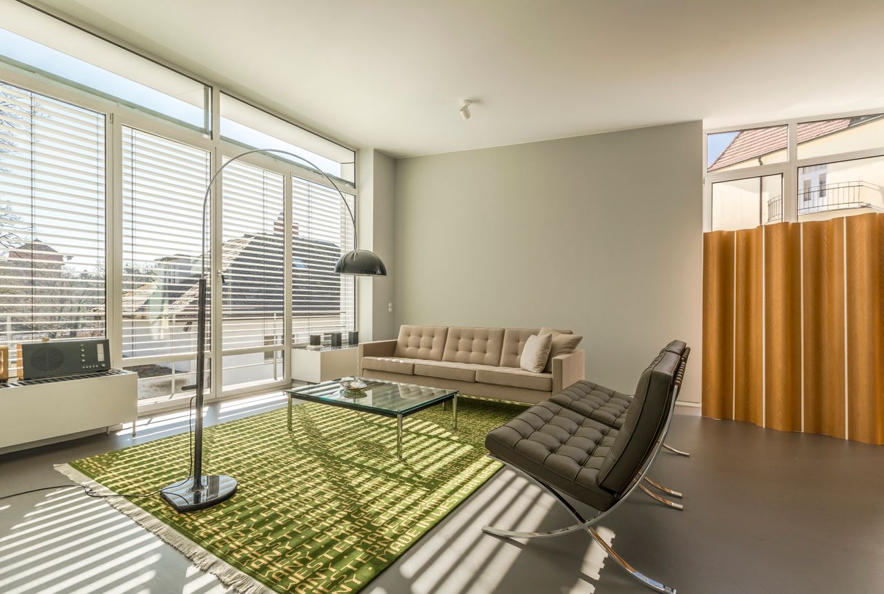 Das Baudenkmal und ehemalige Eternit Gästehaus bietet auf 2 Etagen großzügige, lichtdurchflutete Wohnflächen mit ca. 210 m². Der geöffnete Salon in der oberen Etage mit seinen Terassen schafft durch weite Blickachsen ein beeindruckendes Raumgefühl. Designer-Möbel im Mid-Century-Stil unterstreichen den besonderen Charakter des Hauses und bieten mit Walk-in Dusche, Küche und Kamin eine moderne Repräsentanz. Die Wandfarben sind farbig bzw. hellen Grau – ideal für Filmaufnahmen gestaltet.