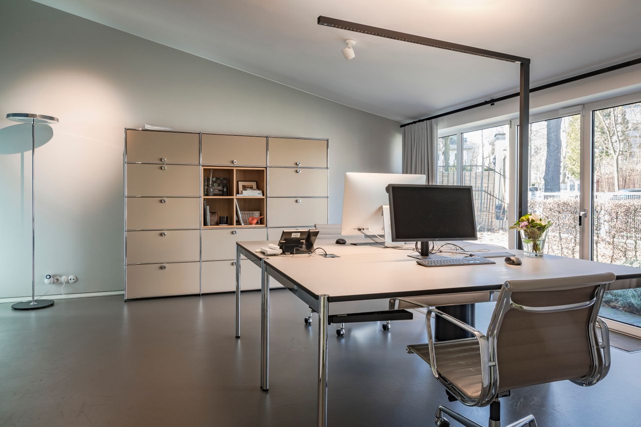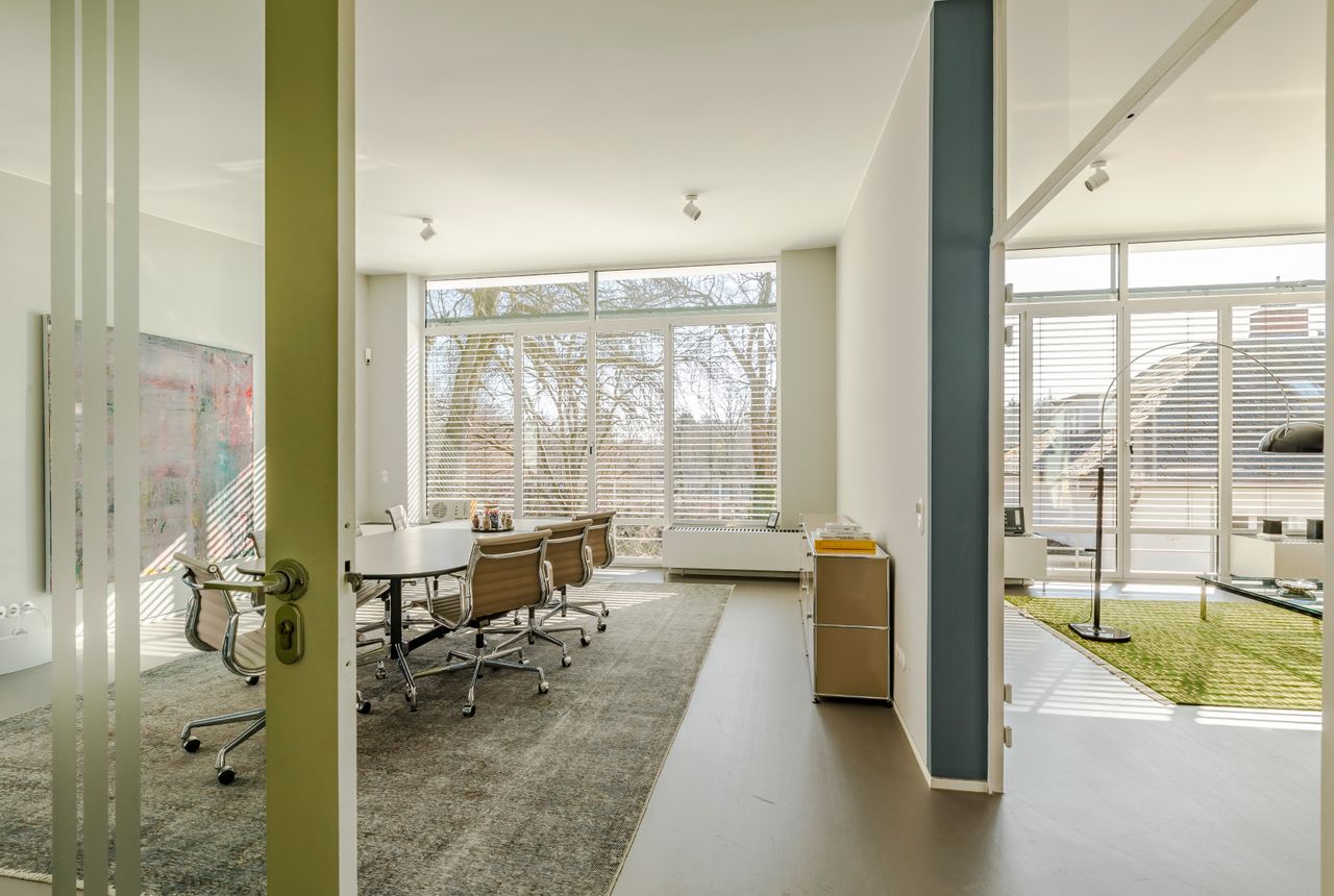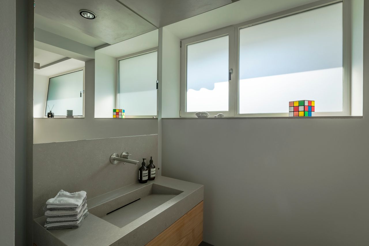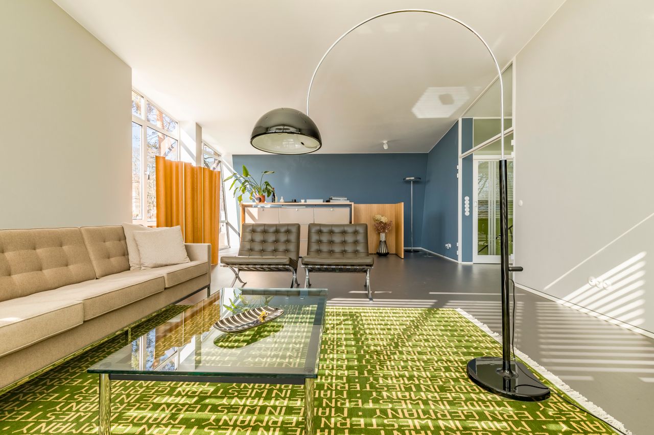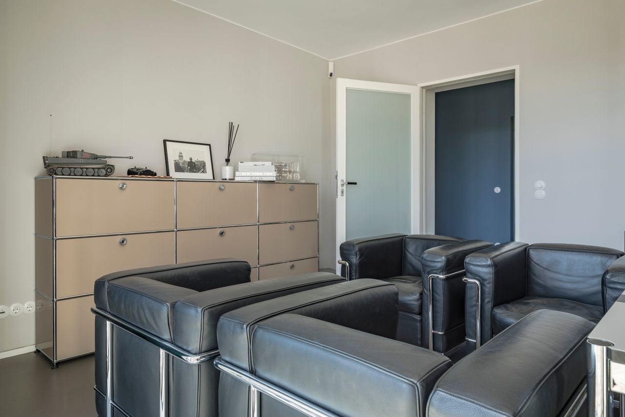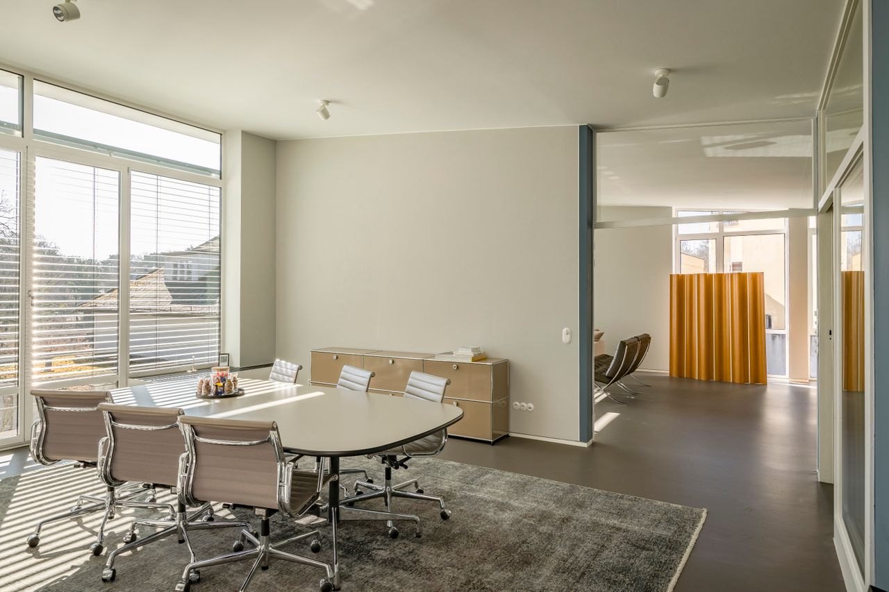 Das Baudenkmal und ehemalige Eternit Gästehaus bietet auf 2 Etagen großzügige, lichtdurchflutete Wohnflächen mit ca. 210 m². Der geöffnete Salon in der oberen Etage mit seinen Terassen schafft durch weite Blickachsen ein beeindruckendes Raumgefühl. Designer-Möbel im Mid-Century-Stil unterstreichen den besonderen Charakter des Hauses und bieten mit Walk-in Dusche, Küche und Kamin eine moderne Repräsentanz. Die Wandfarben sind farbig bzw. hellen Grau – ideal für Filmaufnahmen gestaltet.