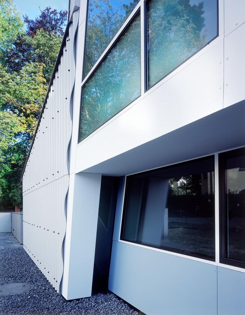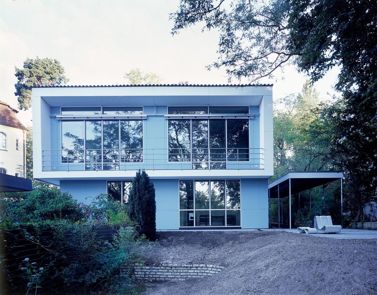 Der nach Süden ausgerichtete Garten begeistert mit einer weitläufigen Rasenfläche, direktem Wasserblick und Steg, während die klare, moderne Linienführung des Hauses markant zwischen den historischen Villen der Umgebung hervorsticht.