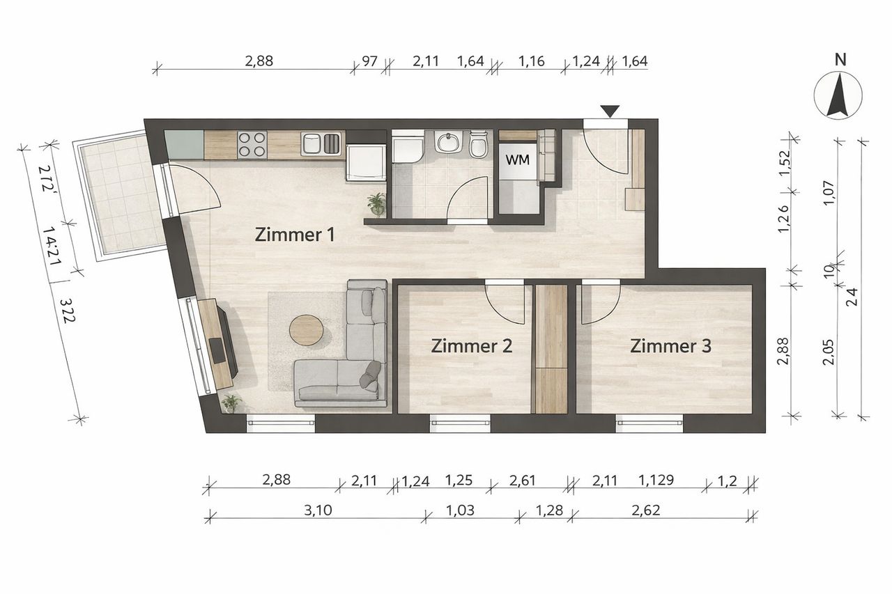 Moderne 3-Zimmer-Wohnung mit offenem Wohn-Küchenbereich und Balkon