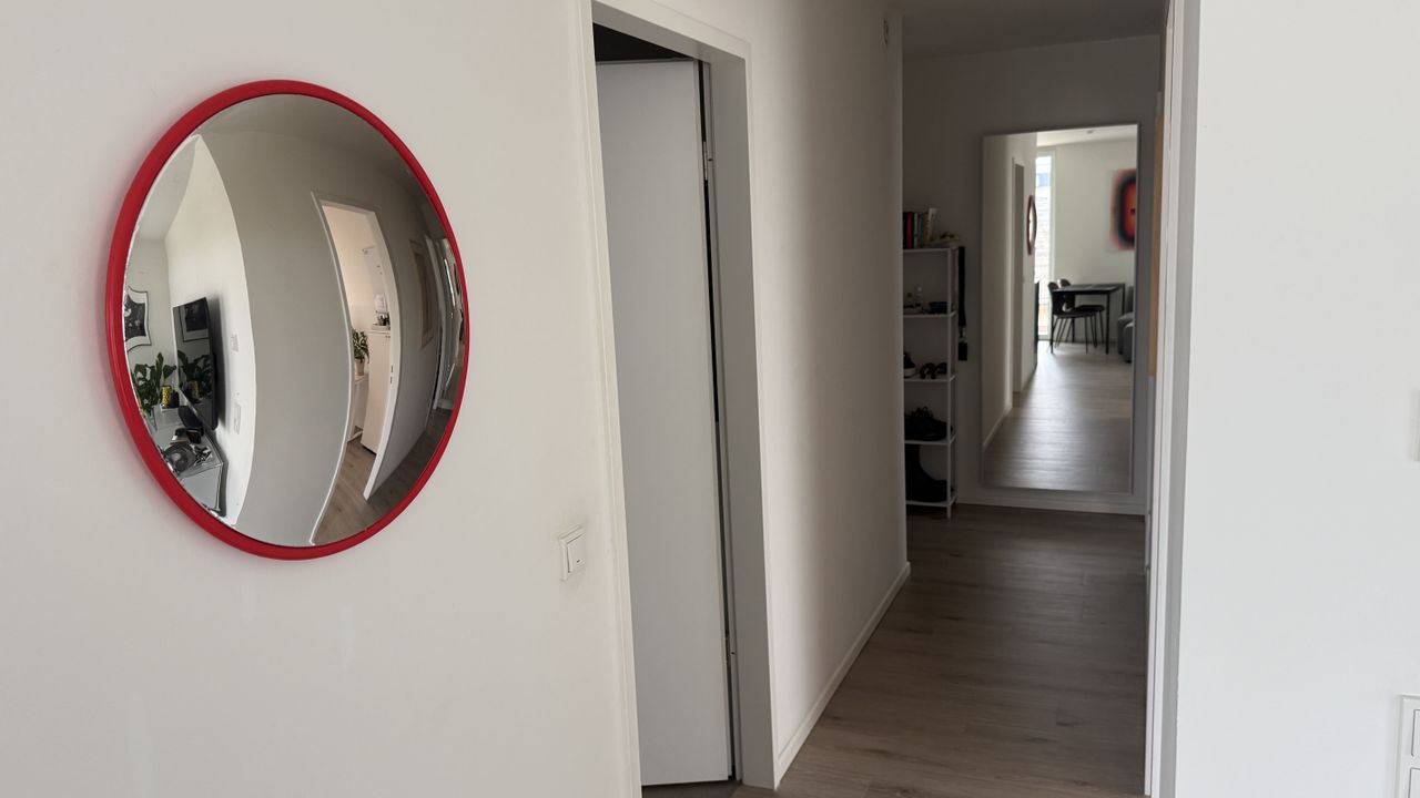Moderne 3-Zimmer-Wohnung in Berlin-Lichtenberg, ca. 51 m² Wohnfläche, 7. Obergeschoss mit Aufzug in einem Neubau aus dem Jahr 2021. Die Wohnung verfügt über einen offenen Wohn-/Küchenbereich mit Balkonzugang, weiße Wände, Boden in Holzoptik und eine moderne schwarze Einbauküche mit hellen Holzarbeitsflächen. Im Wohnbereich befinden sich u. a. graues Sofa, großer wandmontierter Fernseher, silbernes Sideboard, Pflanzen und einzelne Kunst- bzw. Interior-Elemente. Insgesamt cleanes, zeitgenössisches Wohnbild mit guter Tageslichtsituation und neutraler Farbwelt. Geeignet für Foto, Interviews, Social Content, Editorial und kleinere Film- oder Videoproduktionen. Kleine Teams bevorzugt, Nutzung und Umstellungen von Mobiliar nach Absprache.