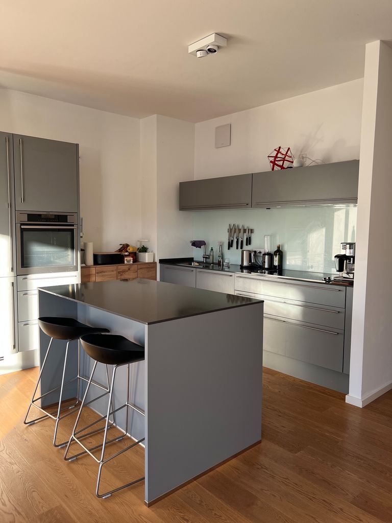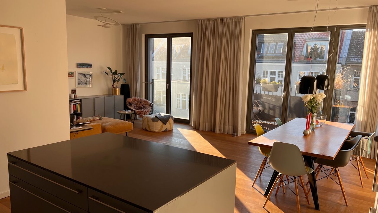 Large Kitchen / Living area with floor-to-ceiling windows and a view of the Funkturm. The apartment features also a separate bedroom and a separate small guest room / office / nursery plus bathroom with bathtub.