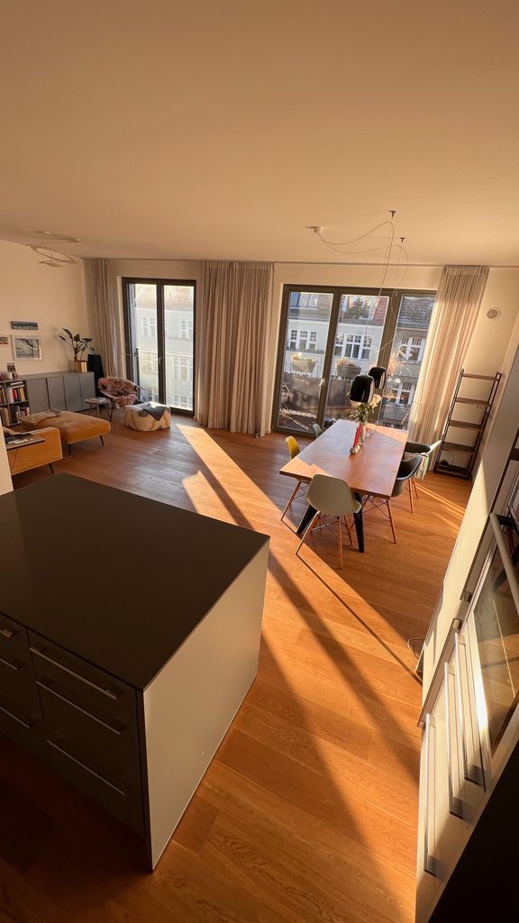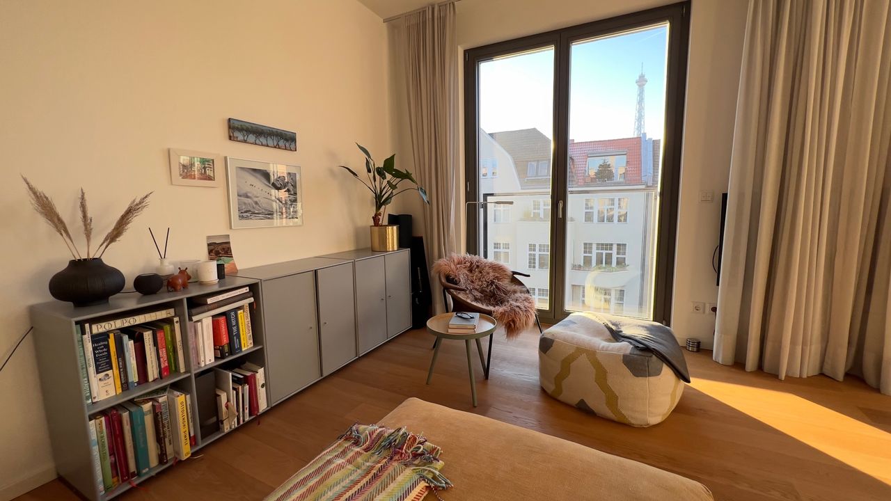 Großer Küchen-/Wohnbereich mit bodentiefen Fenstern und Blick auf den Funkturm. Die Wohnung verfügt außerdem über ein separates Schlafzimmer und ein separates kleines Gästezimmer / Büro / Kinderzimmer sowie ein Badezimmer mit Badewanne.