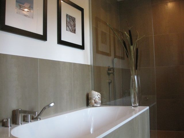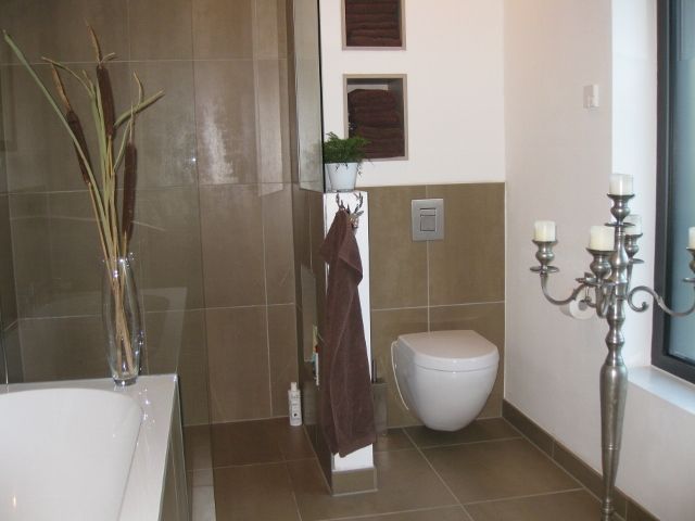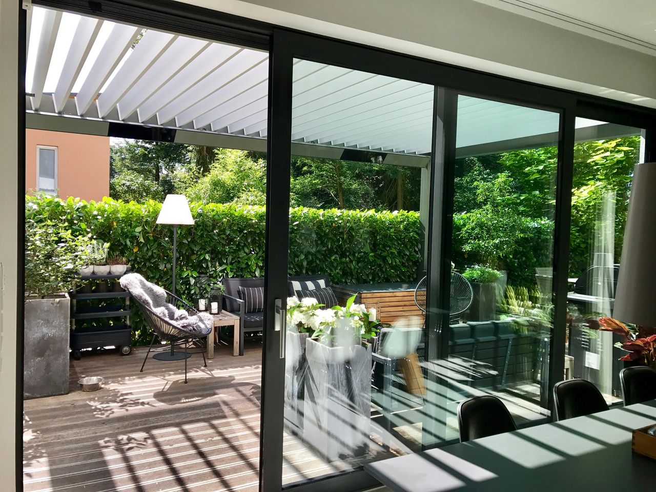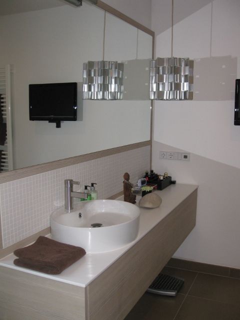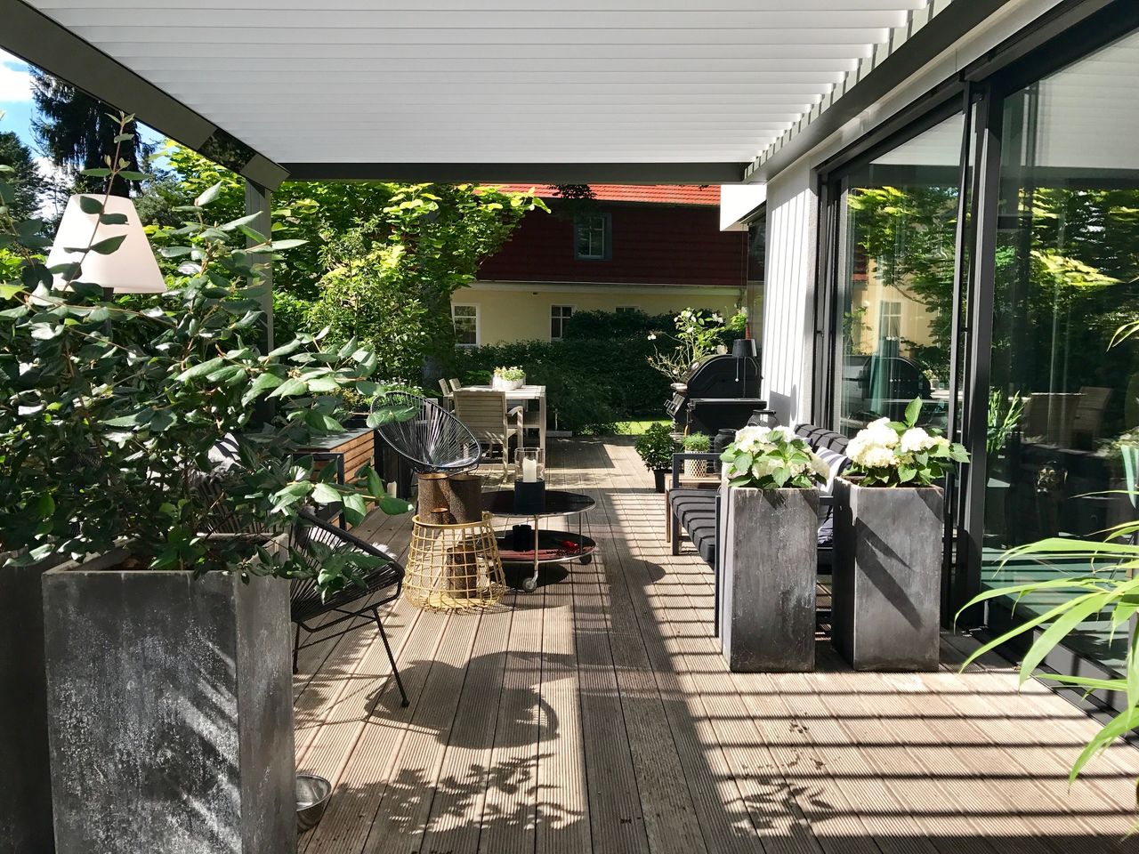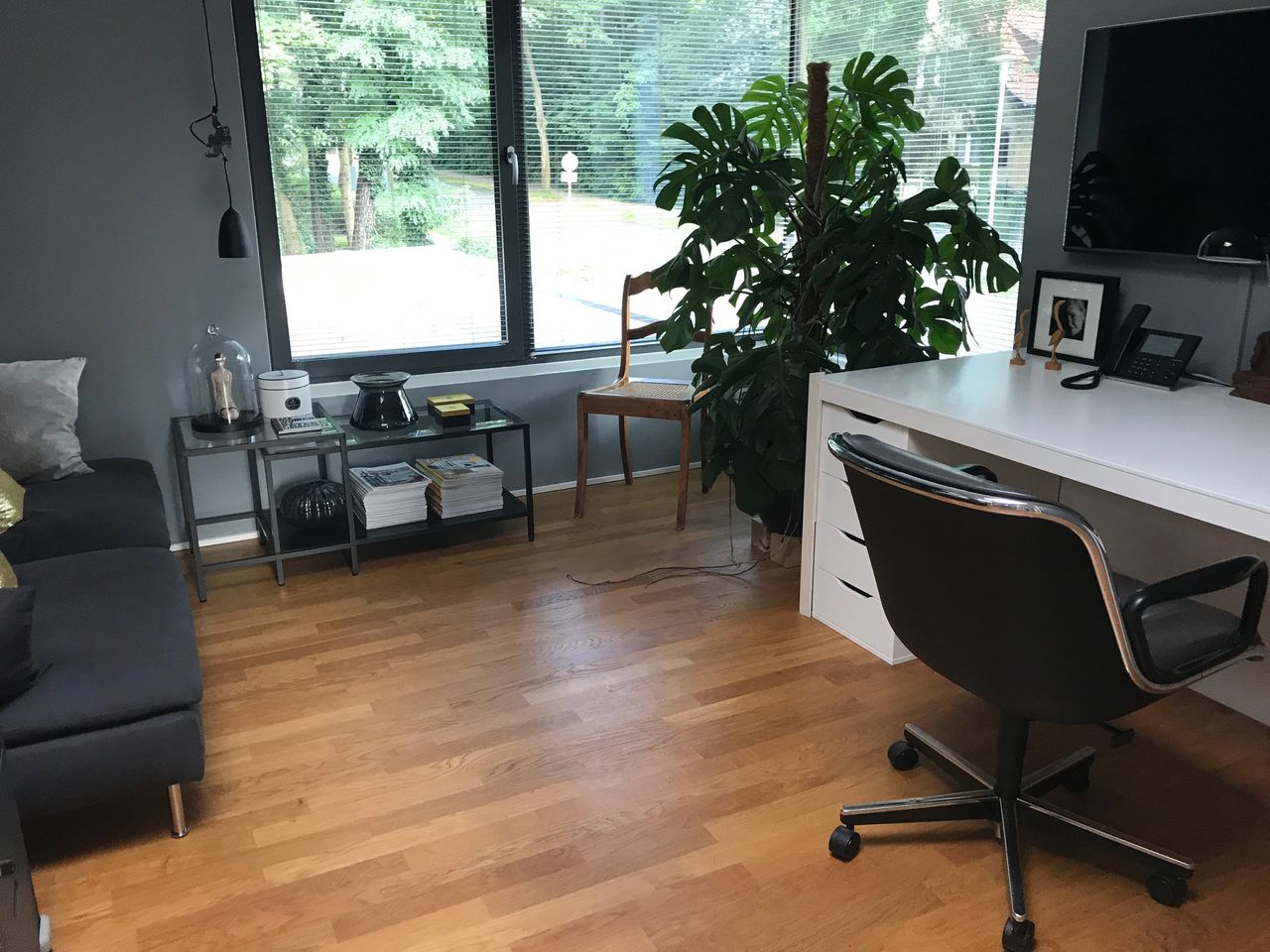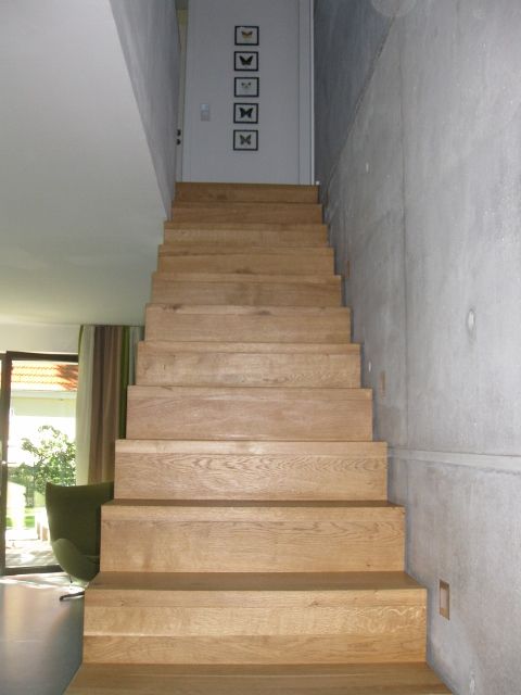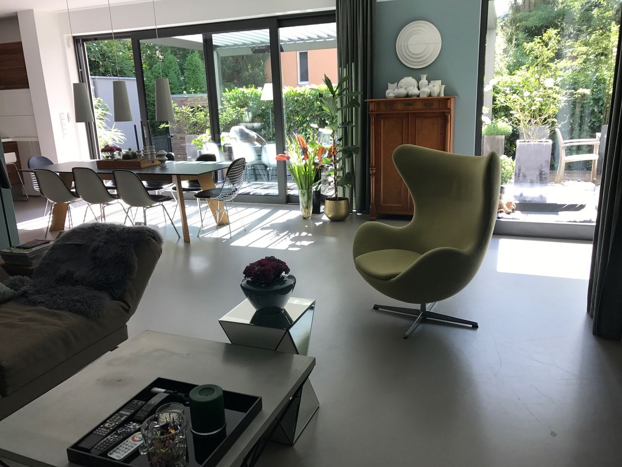 Wohnfläche 140 qm, EG ca. 70 qm, offener Wohn-Ess-Bereich, hellgrauer Linoleumfussboden, moderne Einrichtung, Sichtbetonwand, 60 qm Holzterrasse, Grundstück ca. 700 qm