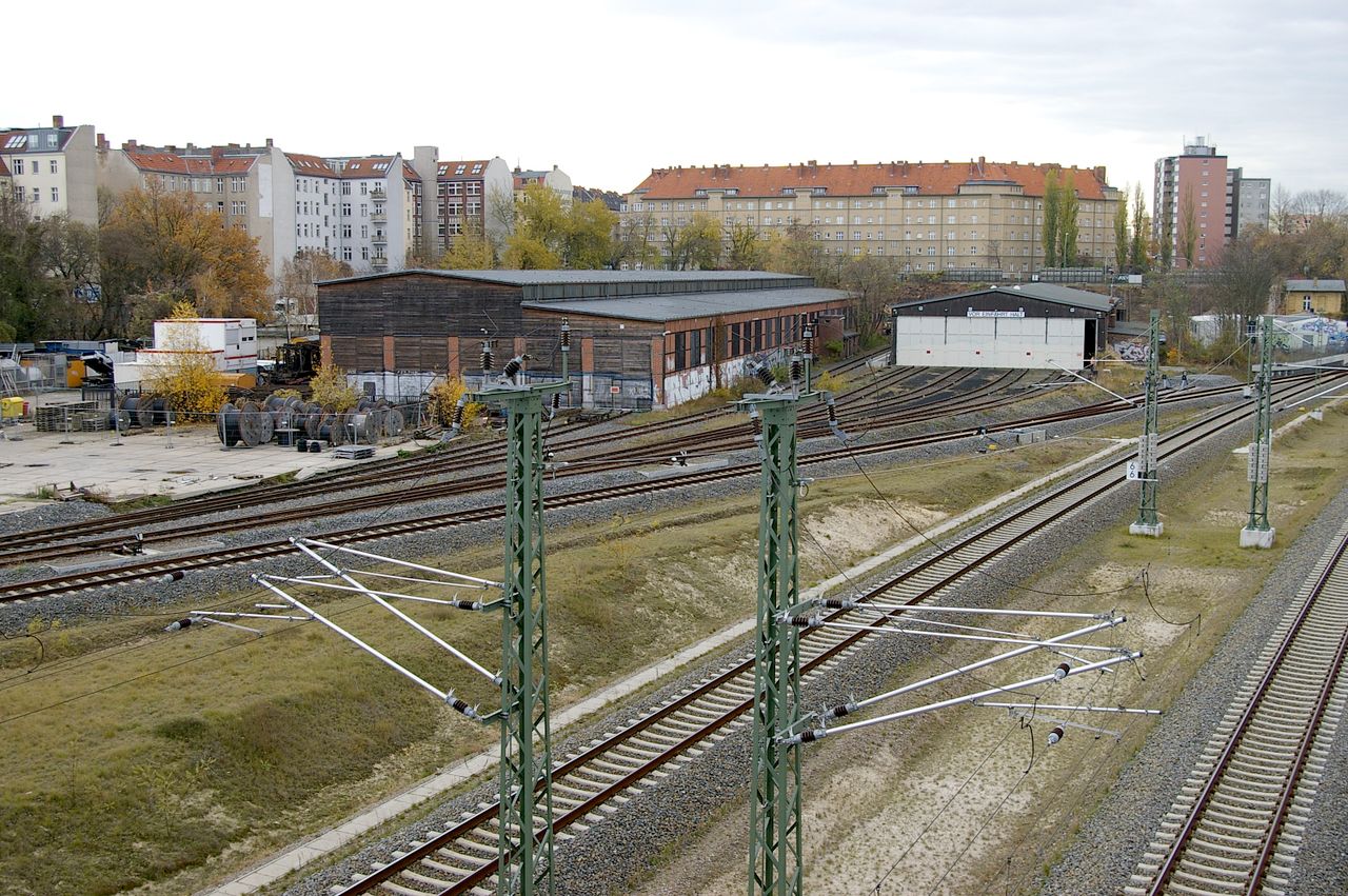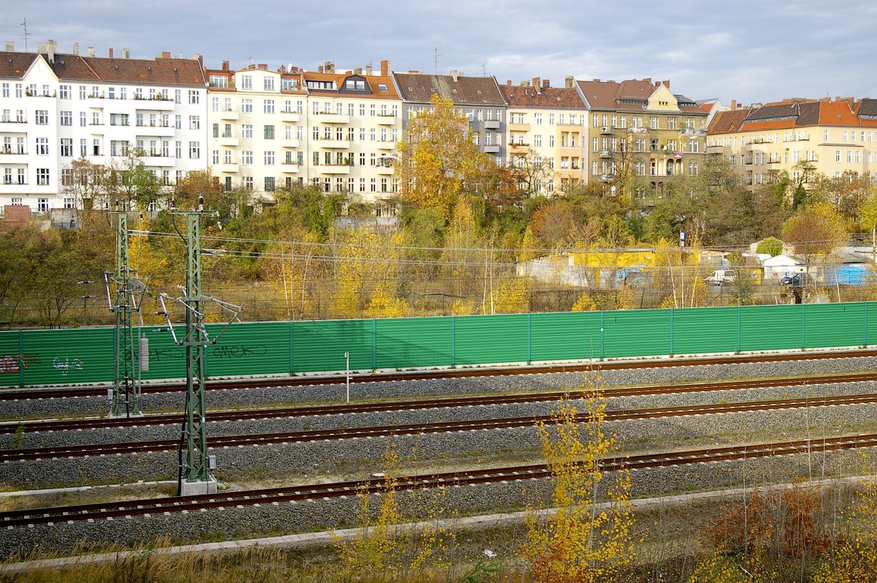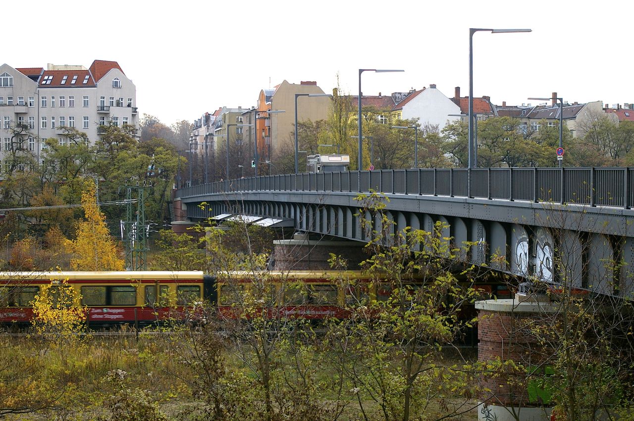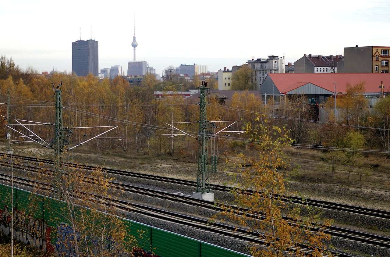 Die Brücke führt über die S-Bahn und Bahntrasse und gewährt einen guten Ausblick auf die Bauten am Potsdamer Platz.