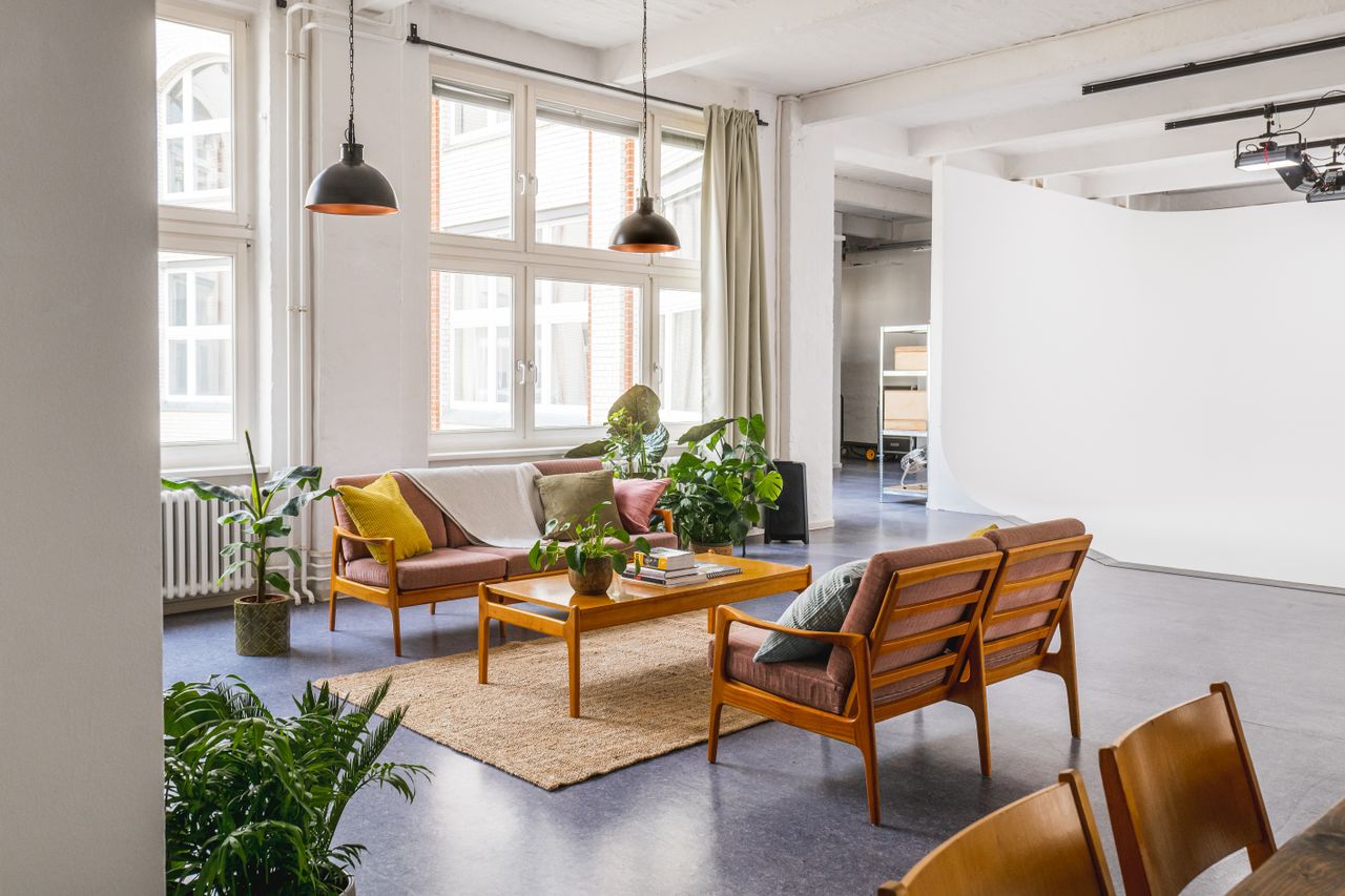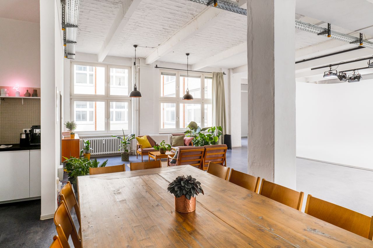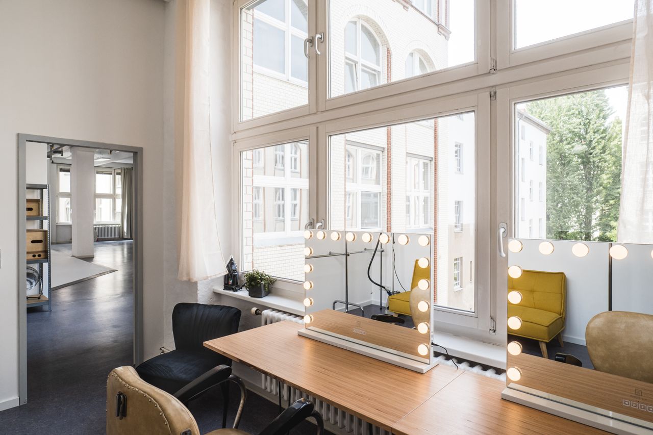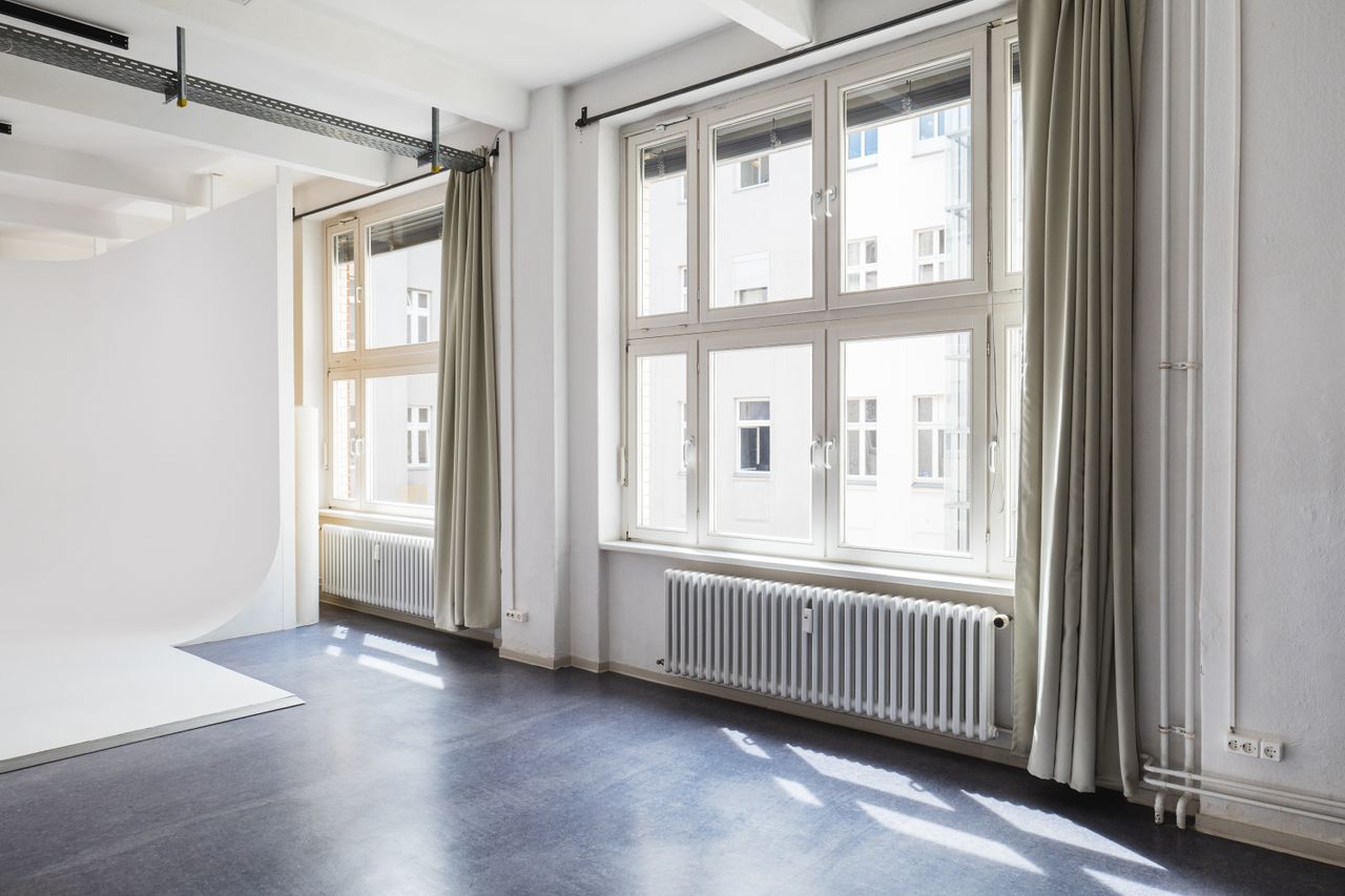 In the heart of beautiful Kreuzberg, Neon Island Studio provides the perfect location for film and photo. In a charming Berlin backyard, an old shoe factory has been turned into a 266 m2 large studio and event space bathing in daylight – that can still be completely blocked thanks to blackout curtains. All creativity can be expressed on the 50 m2 U-shaped infinity cove, equipped with a rail system on the ceiling as well as a preinstalled lamps (Aputure Nova P300c). More equipment for light, camera and more is available on request, and our seasoned production team is prepared to help with any special demands and happy to be consulted on conception and execution matters. Additionally, the studio features a fully equipped kitchen as well as a separate room for hair, makeup, and styling. Finally, our two private parking spots right in front of the two freight elevators (1.80 m2 and 7.30 m2 respectively), equipment and props will be up on the second floor in no time.