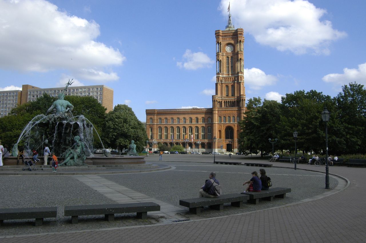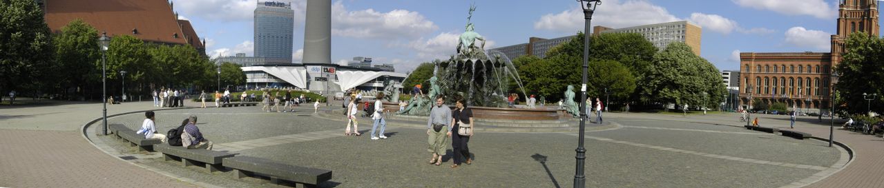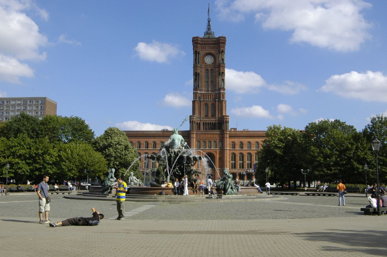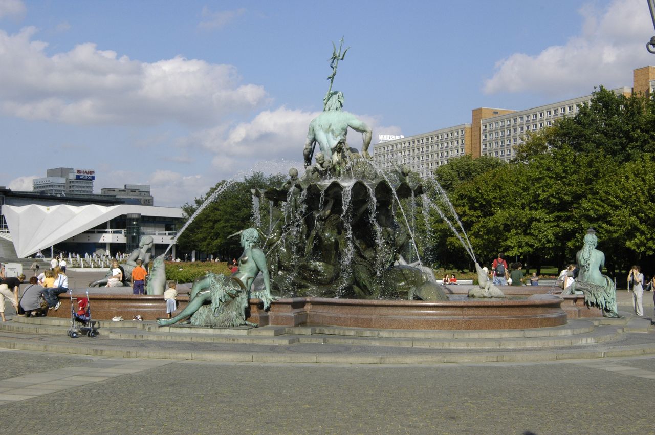 Prächtiger Brunnen mit großen Bronzefiguren direkt neben dem Fernsehturm und dem Roten Rathaus, im Hintergrund ist die St. Marienkirche zu sehen.