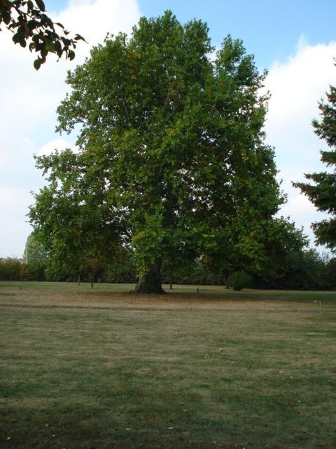 Außengelände: vor dem Treppenaufgang halbrunde Rasenfläche, zwei stattliche Eiben, ca. 200 jähr. große Platane auf dem Rasen vor der Gartentreppe rückseitig des Hauses, zwei Linden neben der Treppe