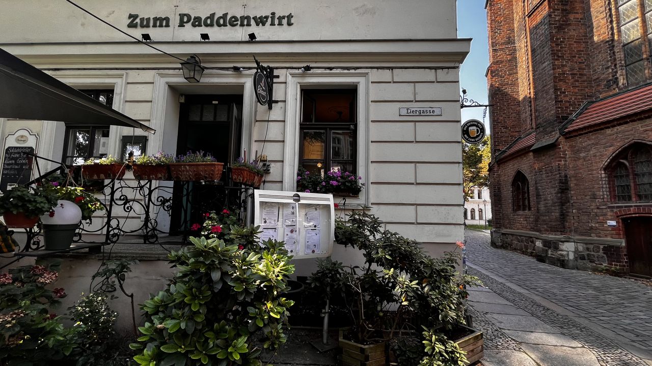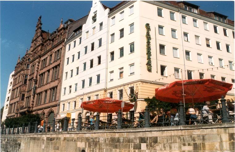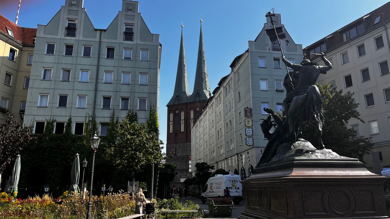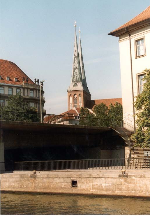 "Das Nikolaiviertel im Berliner Ortsteil Mitte ist das älteste Siedlungsgebiet der Hauptstadt. Im Zweiten Weltkrieg fast vollständig zerstört, wurde es 1980–1987 im Auftrag des Magistrats von Ost-Berlin anlässlich der 750-Jahr-Feier der Stadt unter der Leitung des Architekten Günter Stahn wiederaufgebaut. Rund um die rekonstruierte Nikolaikirche entstand auf annähernd mittelalterlichem Grundriss ein Bauensemble aus fiktiv arrangierten Bürgerhäusern in traditioneller Bauweise sowie Ortbetonbauten mit Vorhangfassaden.[1] Das Baudenkmal gehört heute zu den Sehenswürdigkeiten Berlins." (zitiert nach: de.wikipedia.org)