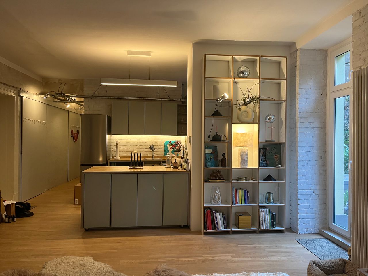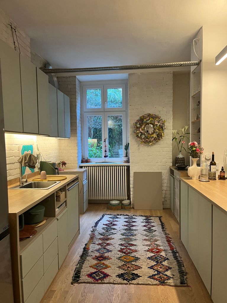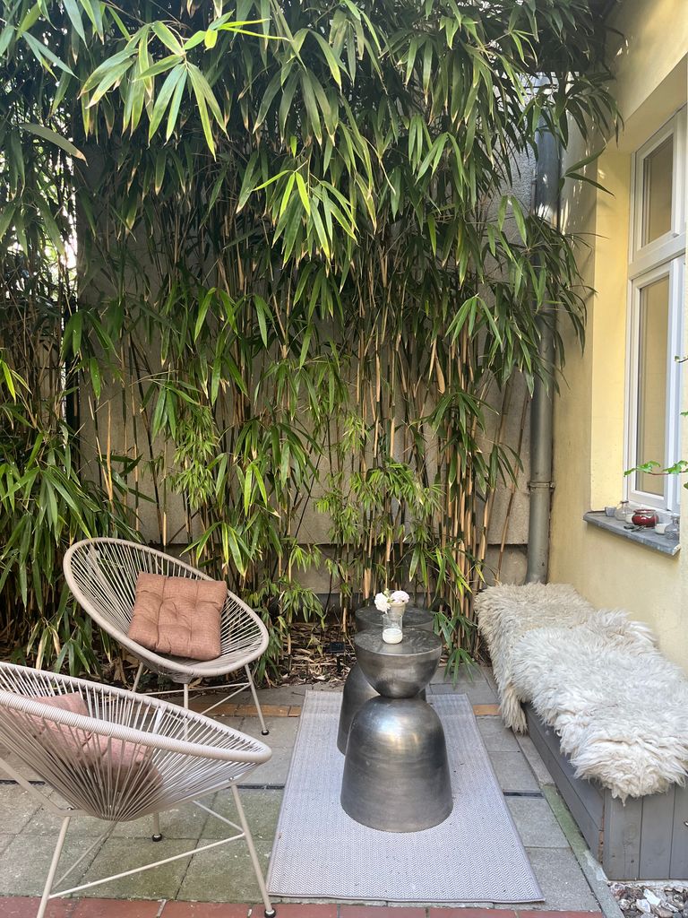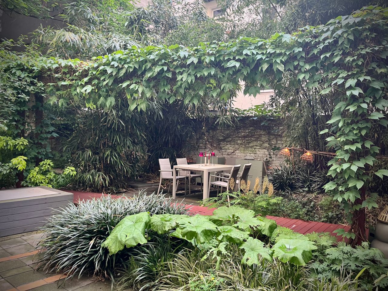 highlight of the property is the exclusive, lovingly landscaped garden of 140 m2 in the second walled courtyard. The garden features several idyllic retreats, Bamboo trees, fawns and special plants.The apartment boasts two bathrooms and a wood burning stove in the living room provides cosy evenings. The sound atelier is a room for creating music, with many gongs, piano and other instruments.The open-plan kitchen and the artistically plastered walls with brick and plaster elements give the apartment a unique charm, making it a green oasis in the city. It has parquet and design pieces, with a neo-romantic style. Thew house has lighting system Philipps Hue, therefore is possible tyo choose any kind of colour/illumination.