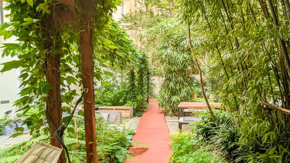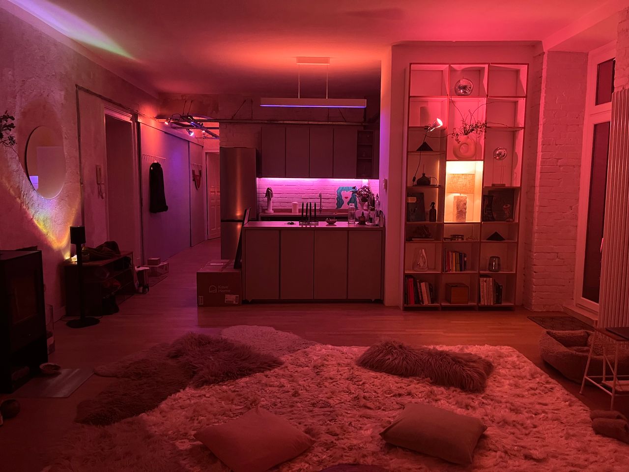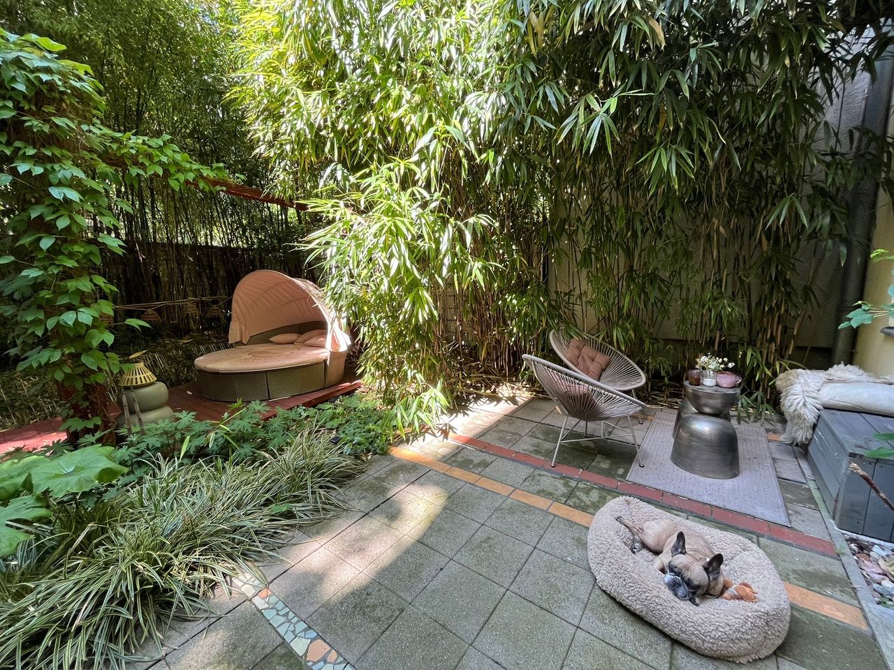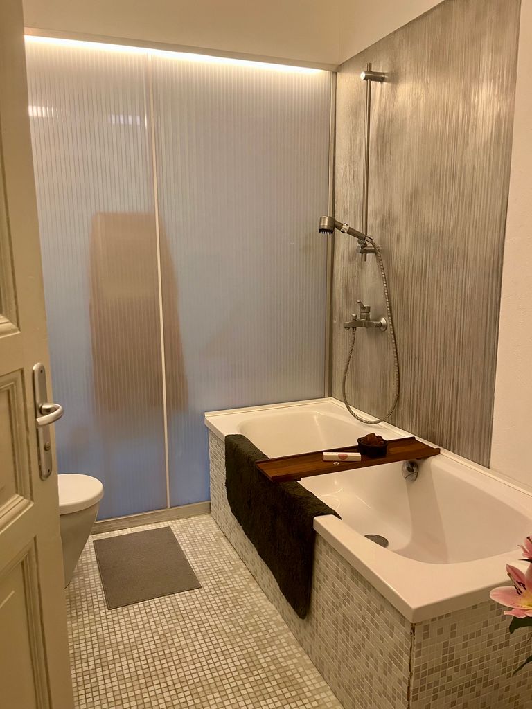 highlight of the property is the exclusive, lovingly landscaped garden of 140 m2 in the second walled courtyard. The garden features several idyllic retreats, Bamboo trees, fawns and special plants.The apartment boasts two bathrooms and a wood burning stove in the living room provides cosy evenings. The sound atelier is a room for creating music, with many gongs, piano and other instruments.The open-plan kitchen and the artistically plastered walls with brick and plaster elements give the apartment a unique charm, making it a green oasis in the city. It has parquet and design pieces, with a neo-romantic style. Thew house has lighting system Philipps Hue, therefore is possible tyo choose any kind of colour/illumination.