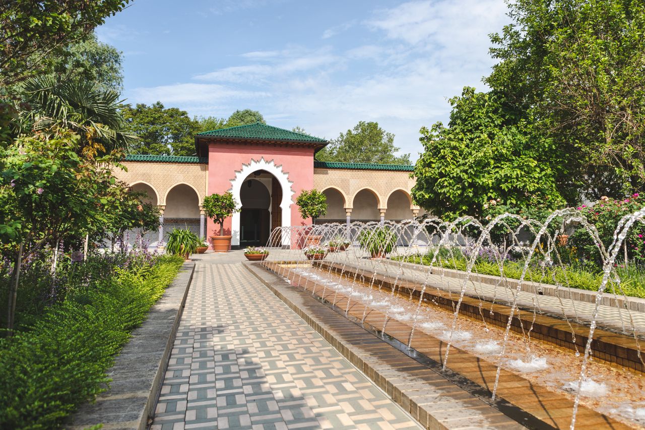 Über den „Saal der Empfänge“ gelangt man in den 63 x 38 Meter großen Gartenhof. Er ist den orientalischen Vorbildern entsprechend geometrisch-vierteilig angelegt. Von der großen Brunnenschale in der Mitte gehen vier Wasserbecken ab, an denen vier gleich große, rechteckige Beete liegen. Entsprechend der orientalisch-islamischen Gartenkultur finden sich hier sowohl Zier- als auch Nutzpflanze. Insgesamt 1,3 Millionen marokkanische Kacheln zieren die Mauern und Arkaden des Gartens.