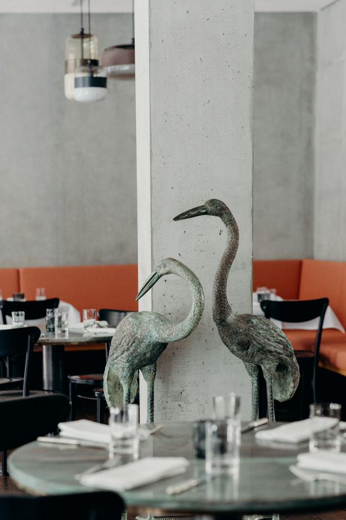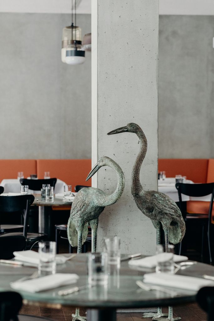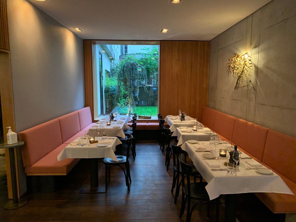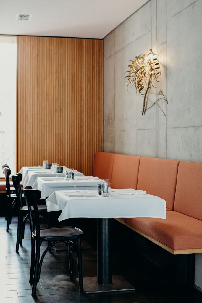 Beim Aus- und Umbau des Restaurants war es den Betreibern wichtig, ein zeitloses und elegantes Ambiente zu schaffen – ohne dass es dabei zu aufdringlich wirkt. Die moderne Betonstruktur mit Holzpanelen aus heimischer Buche und roséfarbenen Polsterstoffen des deutschen Traditionsunternehmens Rohi zaubern ein warmes, harmonisches Ambiente. verwandelt hat. Die Hängelampen aus Muranoglas der venizianischen Glasmanufaktur Vistosi und ausgesuchte Fundstücke, sowie Anfertigungen aus Messing unterstreichen charmant den persönlichen Stil der Gastgeber.