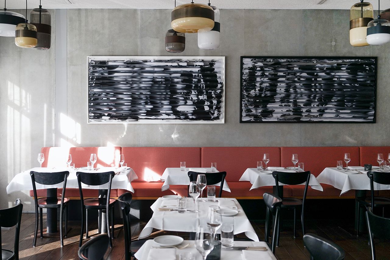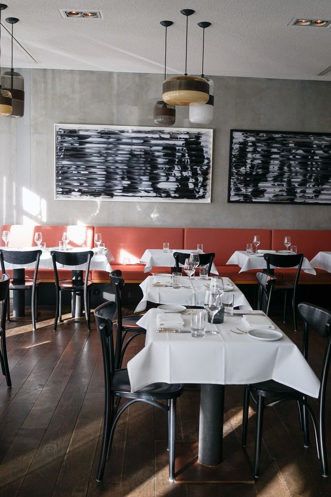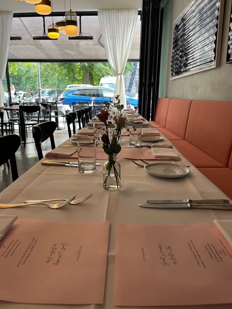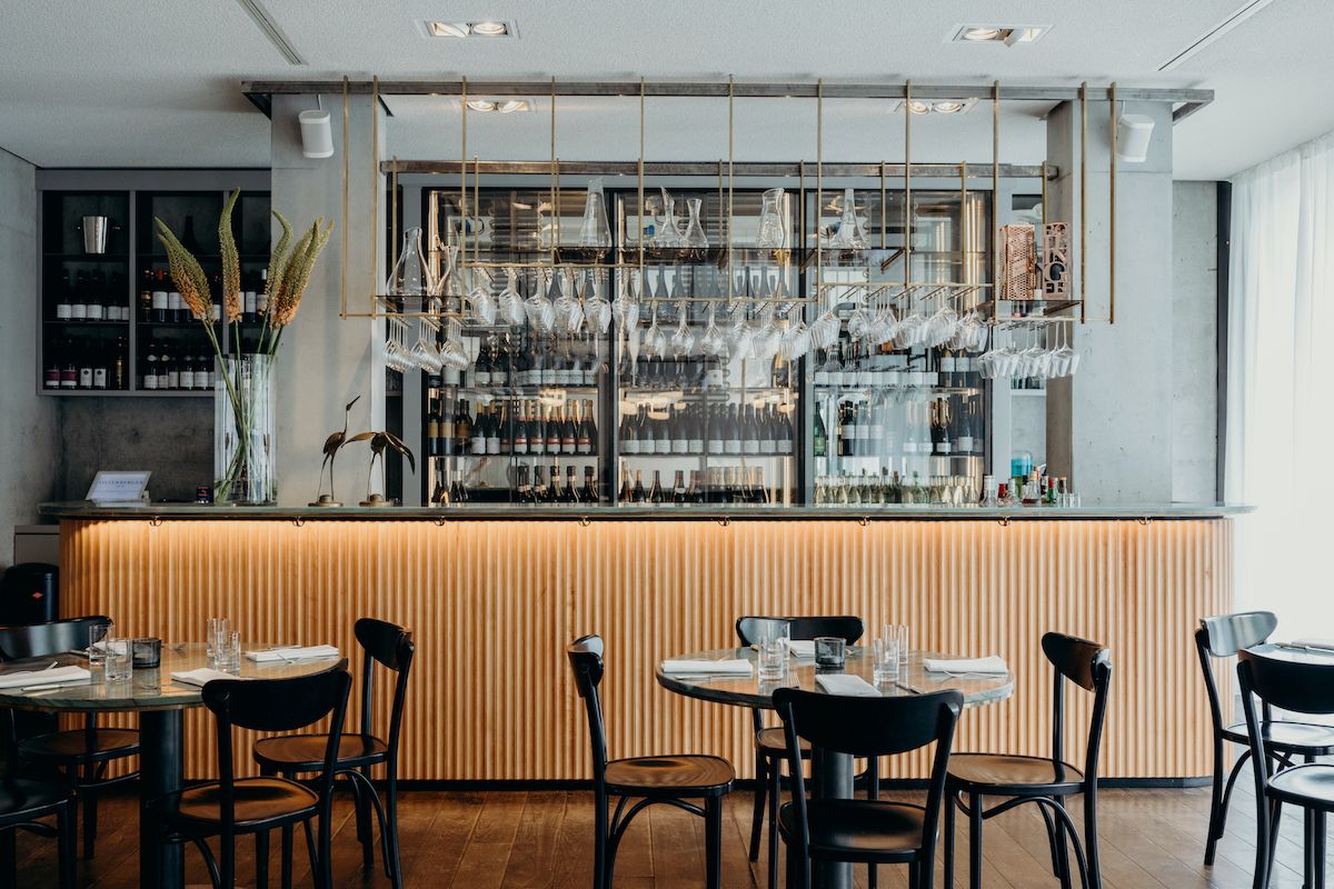 Beim Aus- und Umbau des Restaurants war es den Betreibern wichtig, ein zeitloses und elegantes Ambiente zu schaffen – ohne dass es dabei zu aufdringlich wirkt. Die moderne Betonstruktur mit Holzpanelen aus heimischer Buche und roséfarbenen Polsterstoffen des deutschen Traditionsunternehmens Rohi zaubern ein warmes, harmonisches Ambiente. verwandelt hat. Die Hängelampen aus Muranoglas der venizianischen Glasmanufaktur Vistosi und ausgesuchte Fundstücke, sowie Anfertigungen aus Messing unterstreichen charmant den persönlichen Stil der Gastgeber.