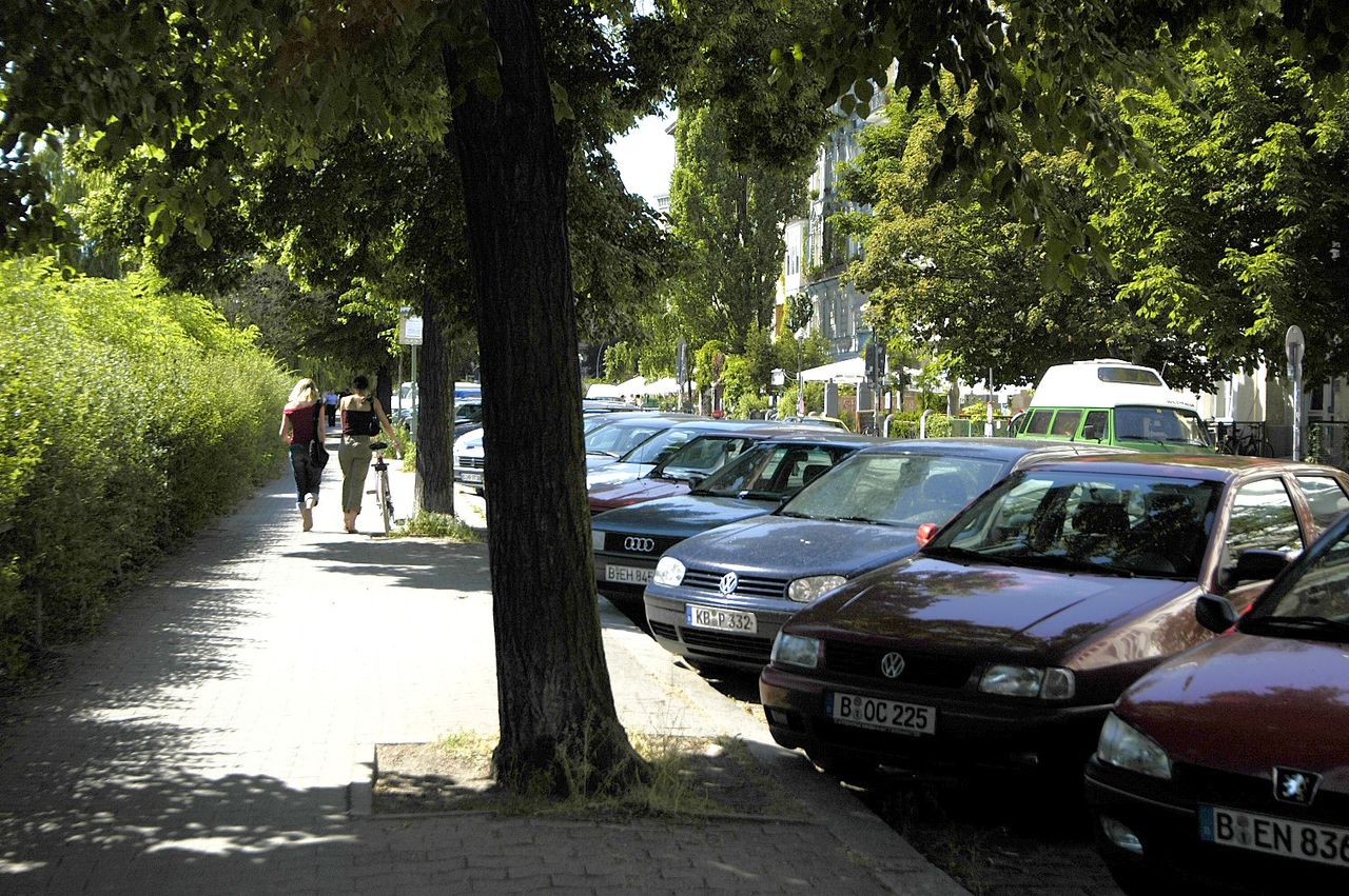 Kopfsteinpflasterstraße mit Gründerzeitbauten und romantischer Uferpromenade, tagsüber viele Jogger und Spaziergänger, viele schicke Cafés