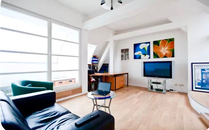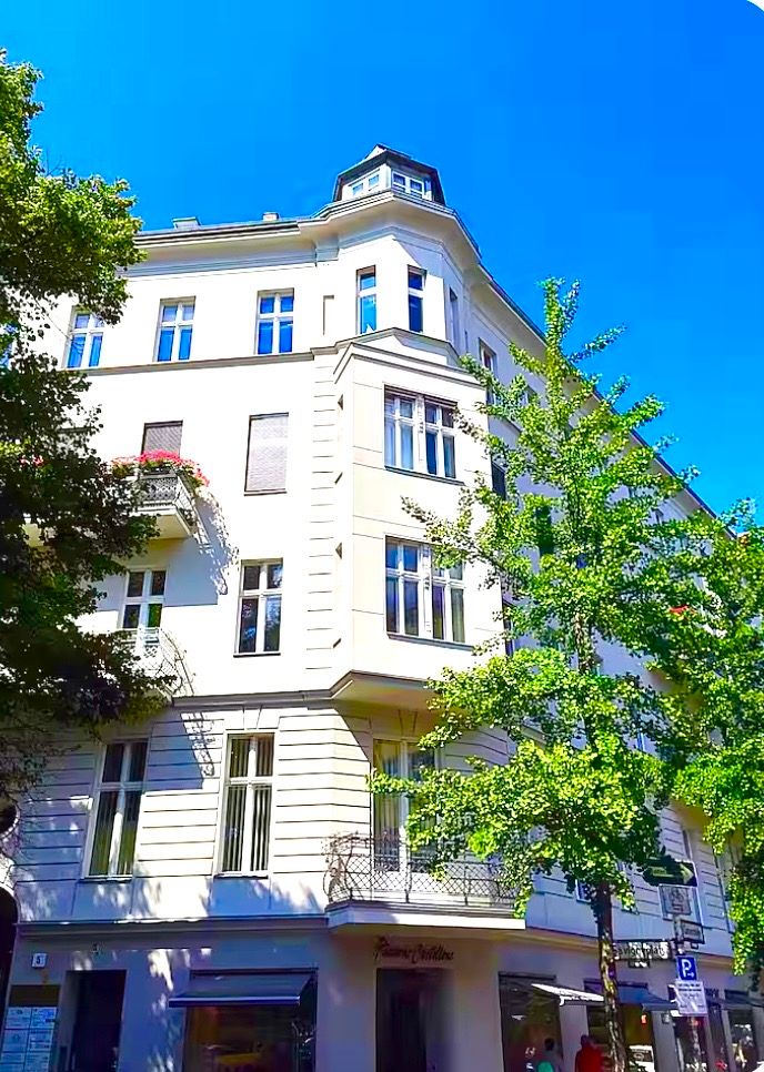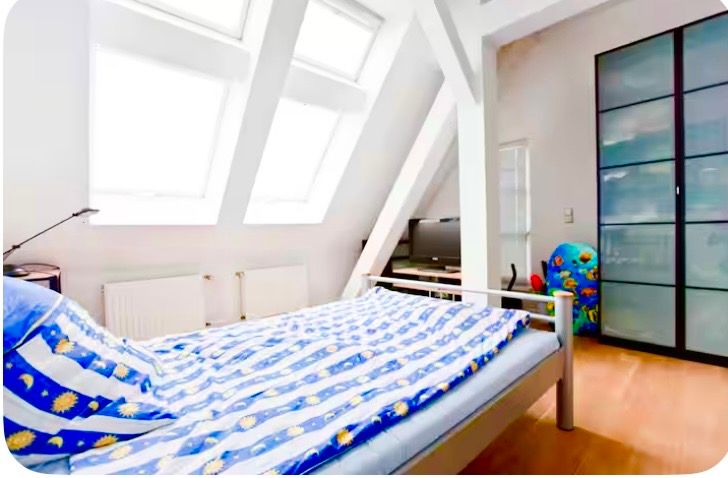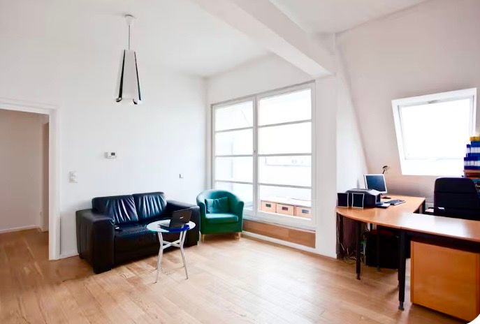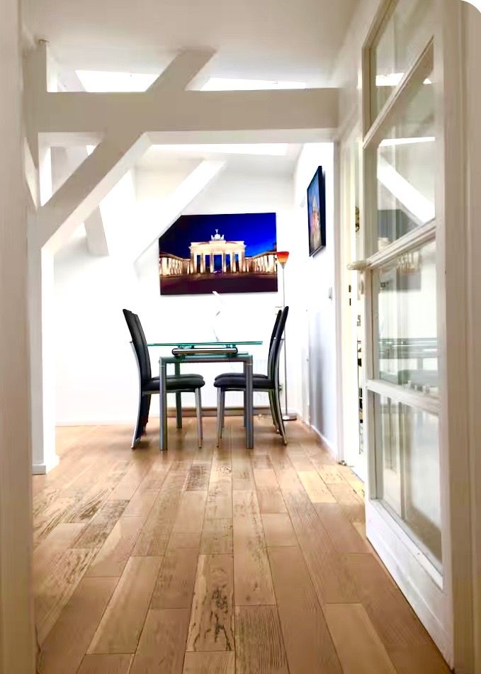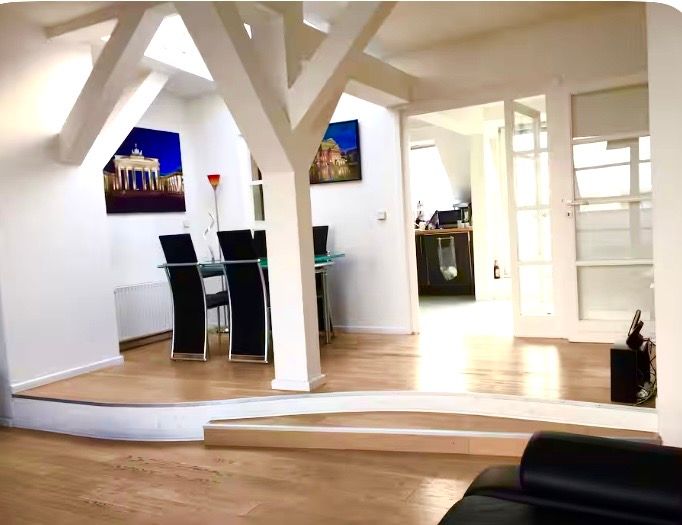 Moderne Dachgeschosswohnung am Savignyplatz mit freistehenden Balken und Oberlichtern, sowie 2 Balkonen mit Aussicht über die Dächer von Berlin.