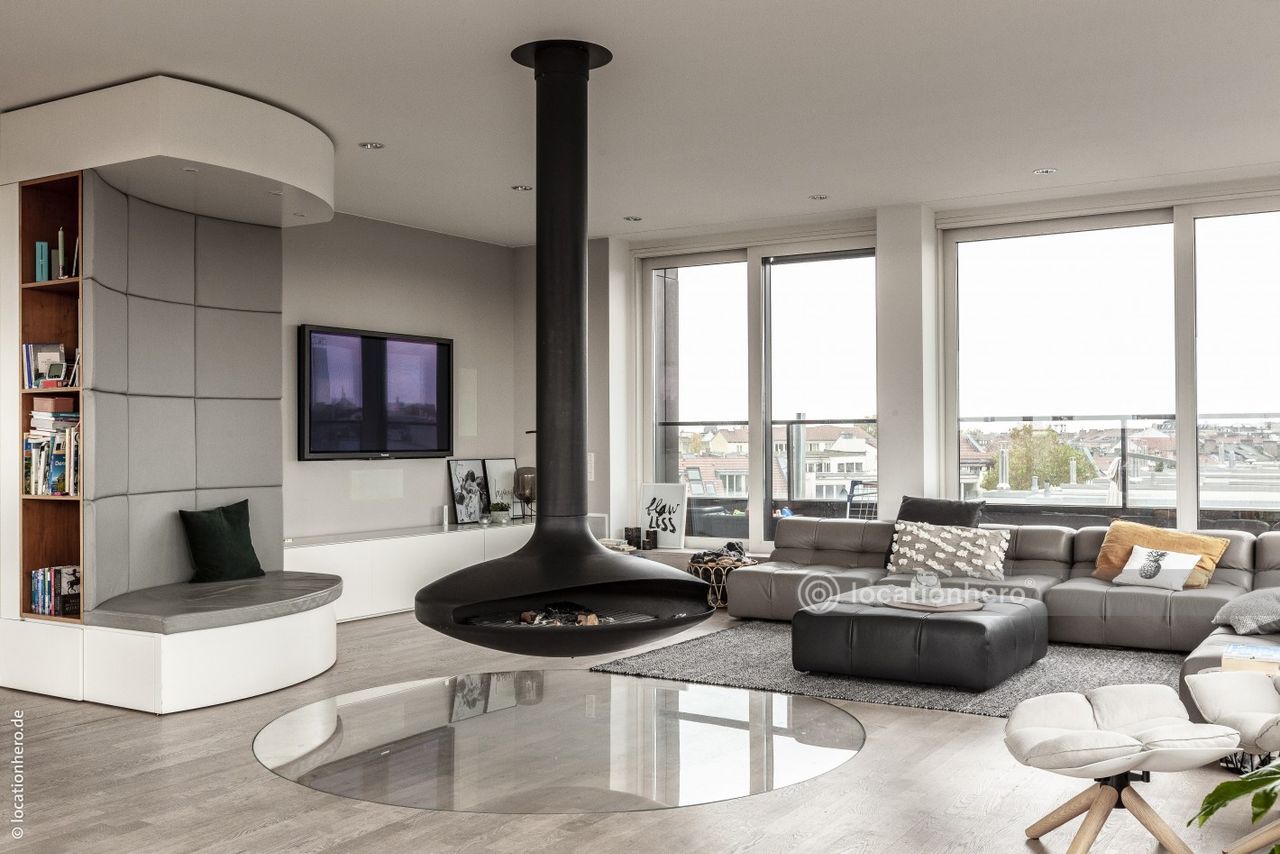 Im Wohnbereich befindet sich ein großer Kamin. Die Wohnung ist lichtdurchflutet.