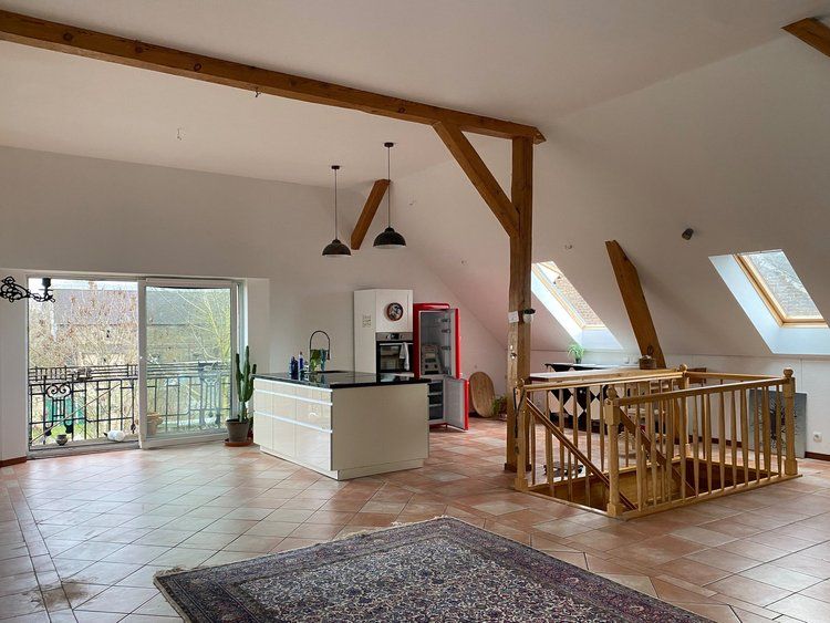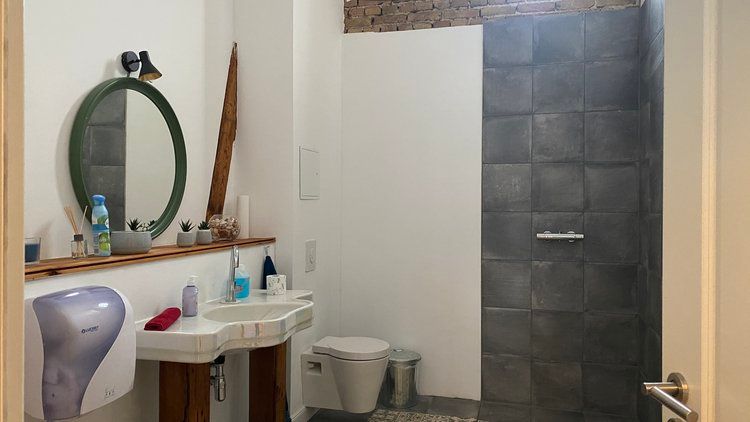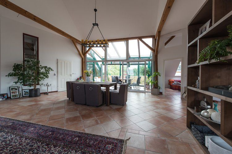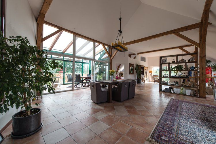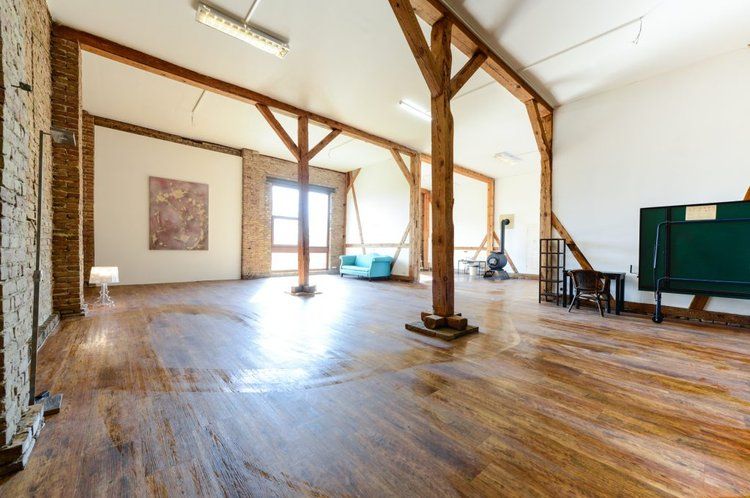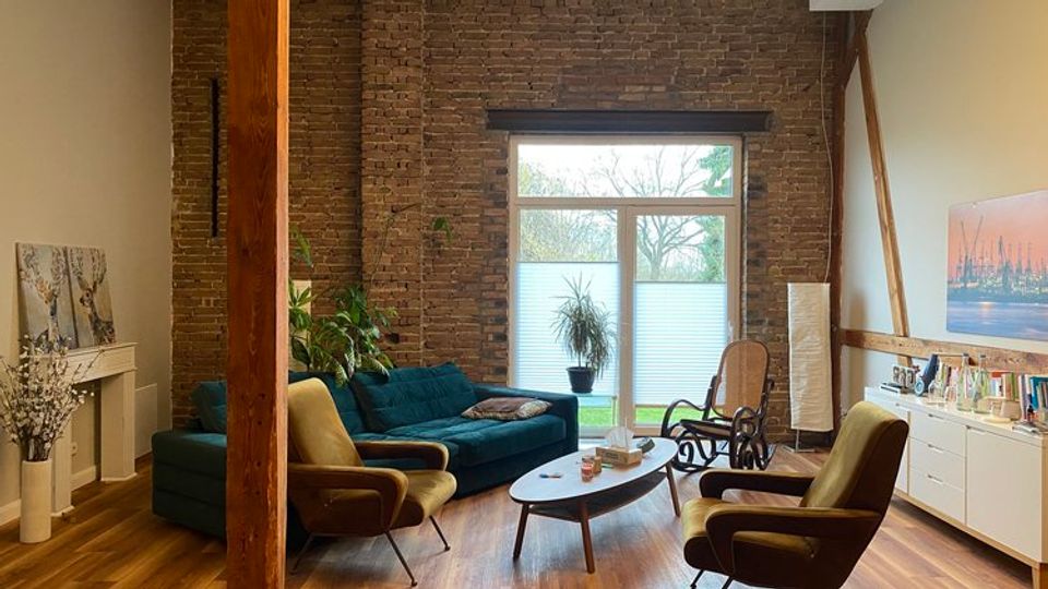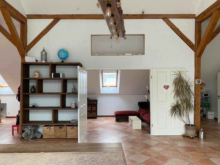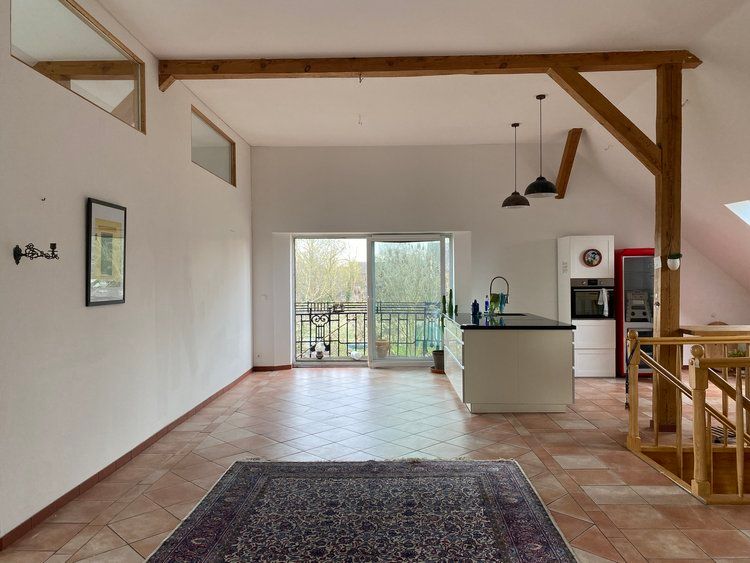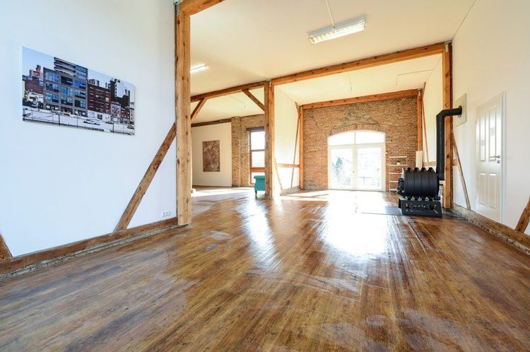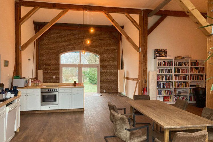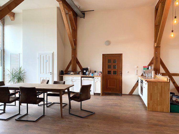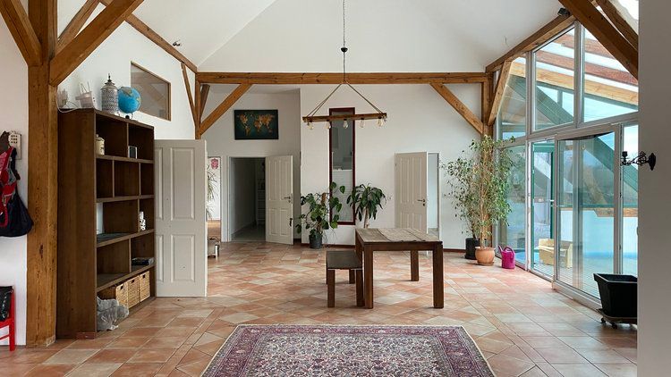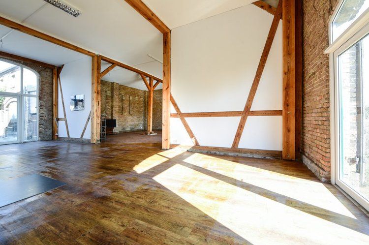 Über das Tor und den Hof gelangt man zum östlichen Stallgebäude, das komplett ausgebaut wurde und sich in drei Bereiche teilt. Das offene Studio, die etwas kleinere ebenerdige Wohnung und die Loftwohnung unterm Dach.