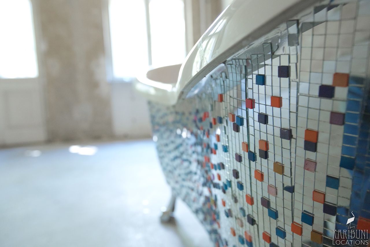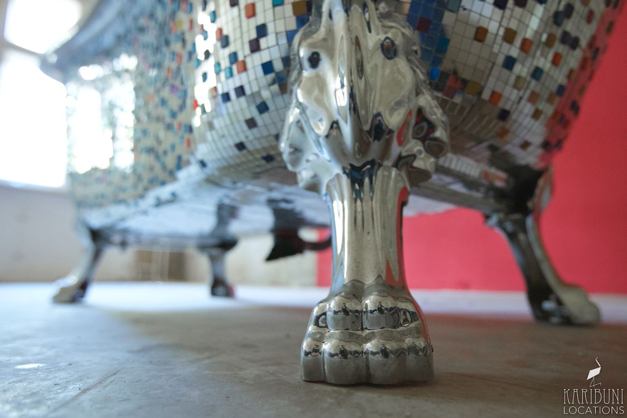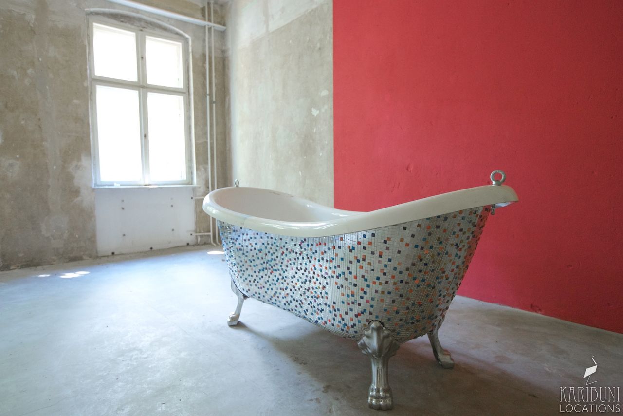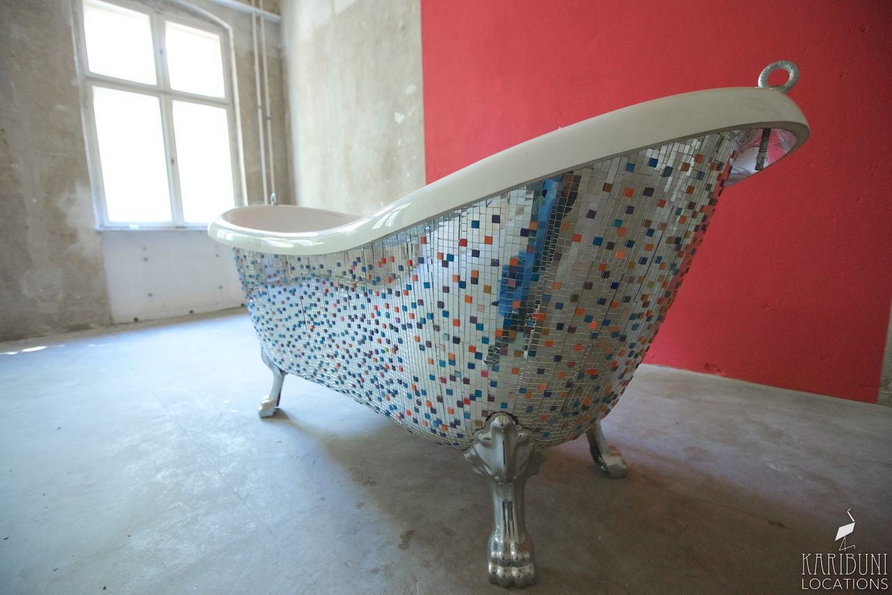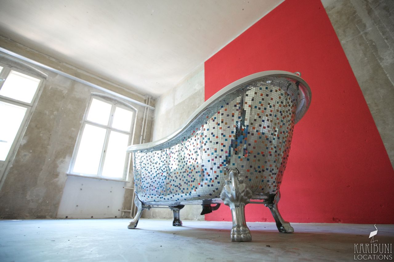 Liebhaber von Glitter, Glamour und Kitsch können sich in unserer aufwändig mit kleinen Spiegeln verkleideten Badewanne austoben. Dieses Einzelstück ist in jedem Fall ein Hingucker für jede Produktion!
