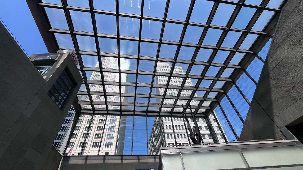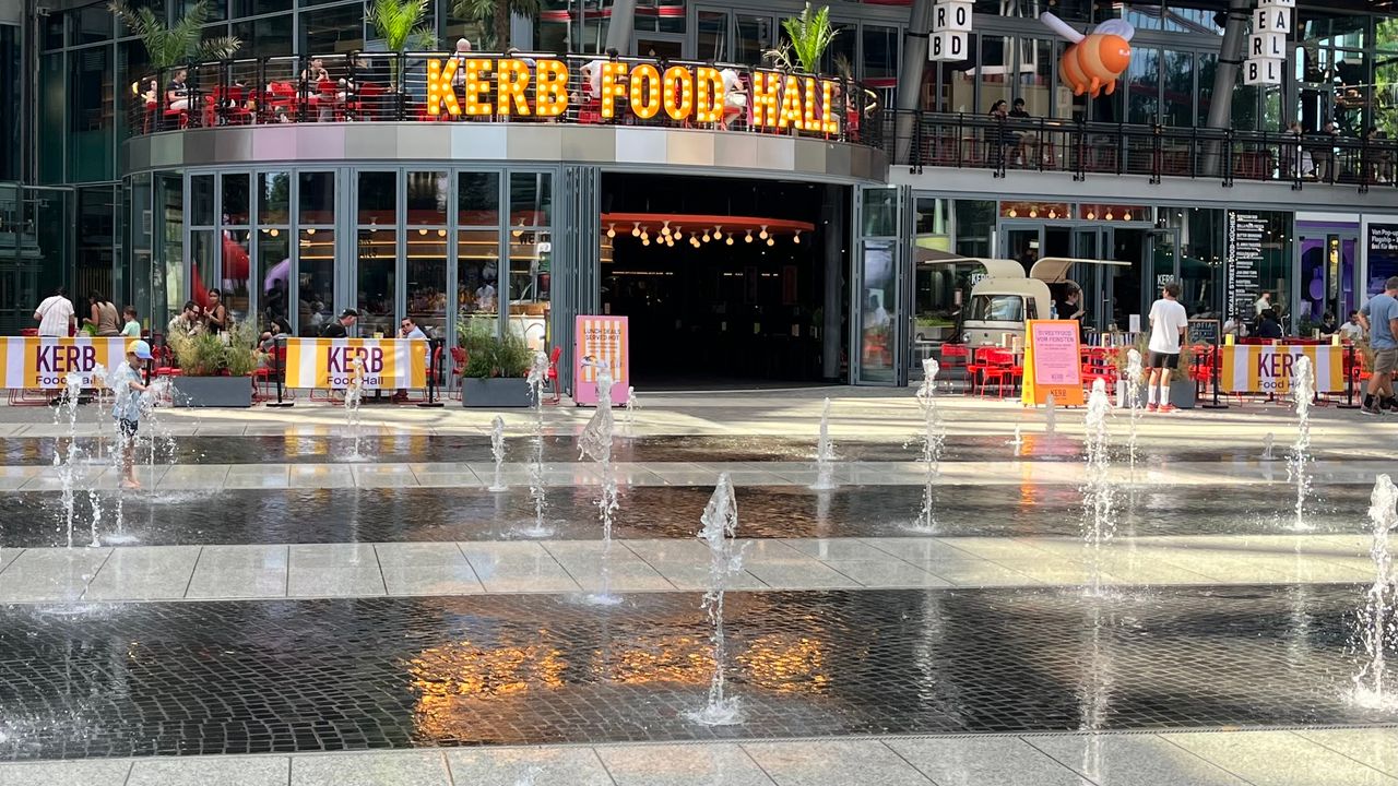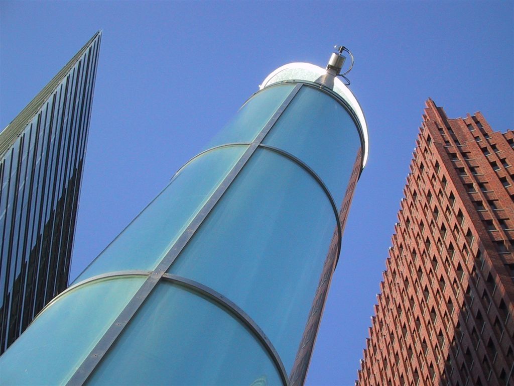 Moderne Architektur, Einkaufscenter Arcaden, Musicaltheater, Brunnen, Debis-Haus. Der Potsdamer Platz ist ein Verkehrsknoten im Berliner Ortsteil Tiergarten im Bezirk Mitte zwischen der alten Innenstadt im Osten und dem neuen Berliner Westen. Er schließt sich westlich an den Leipziger Platz an und liegt an der Stelle des ehemaligen Potsdamer Stadttors vor der Akzisemauer.