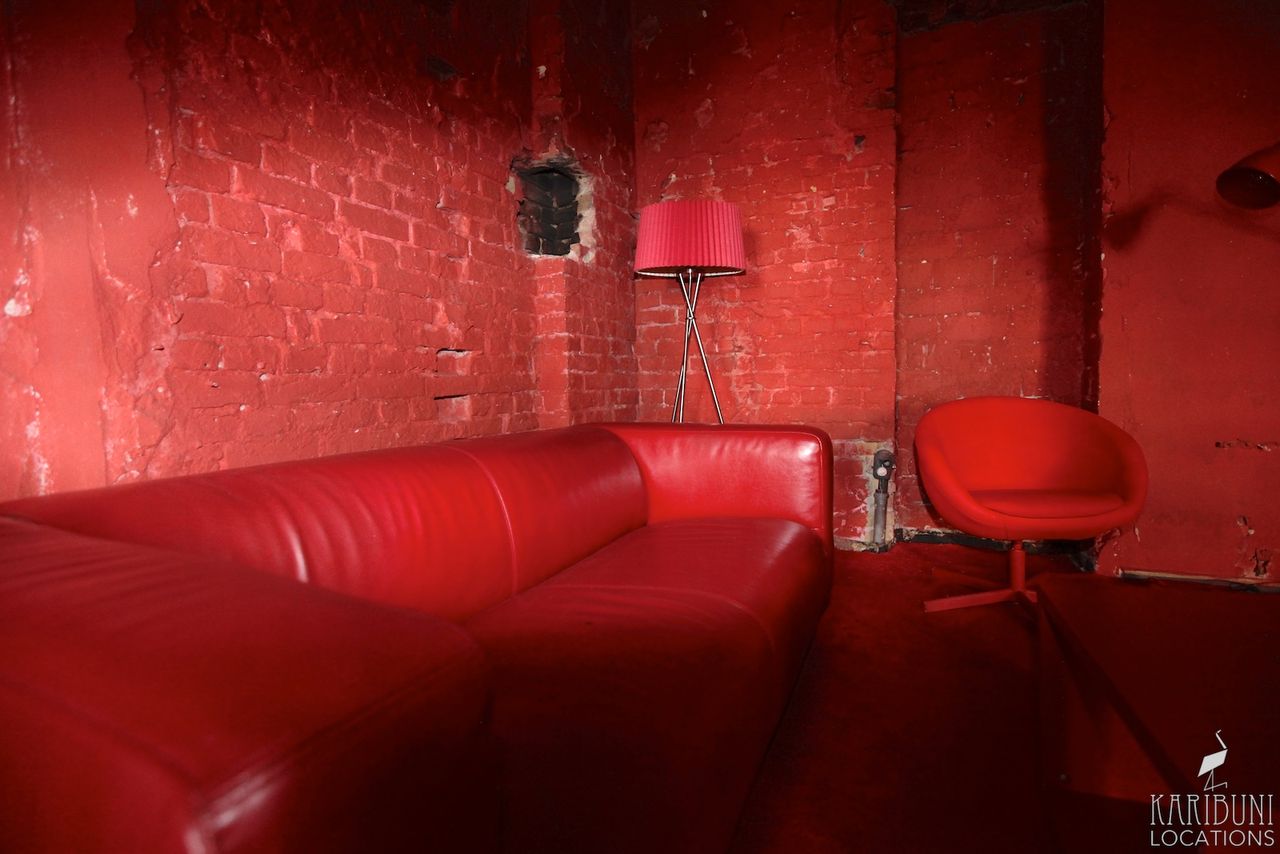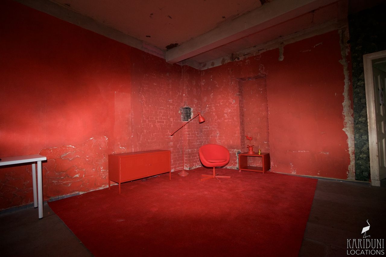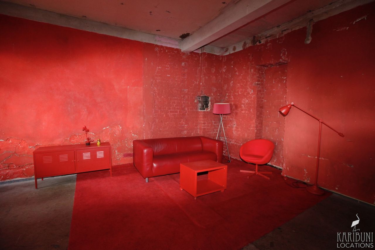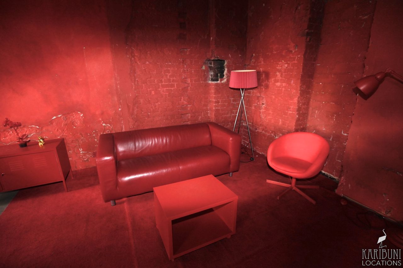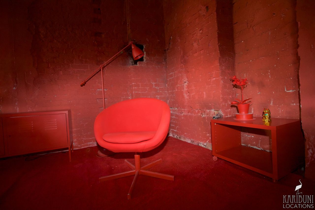 Knallrot bis zur Schmerzgrenze ist dieses Tableau-Set in einer Ecke aus Backsteinwänden, bestehend aus Schalenstuhl, Teppich und einiger weiterer Accessoires.
