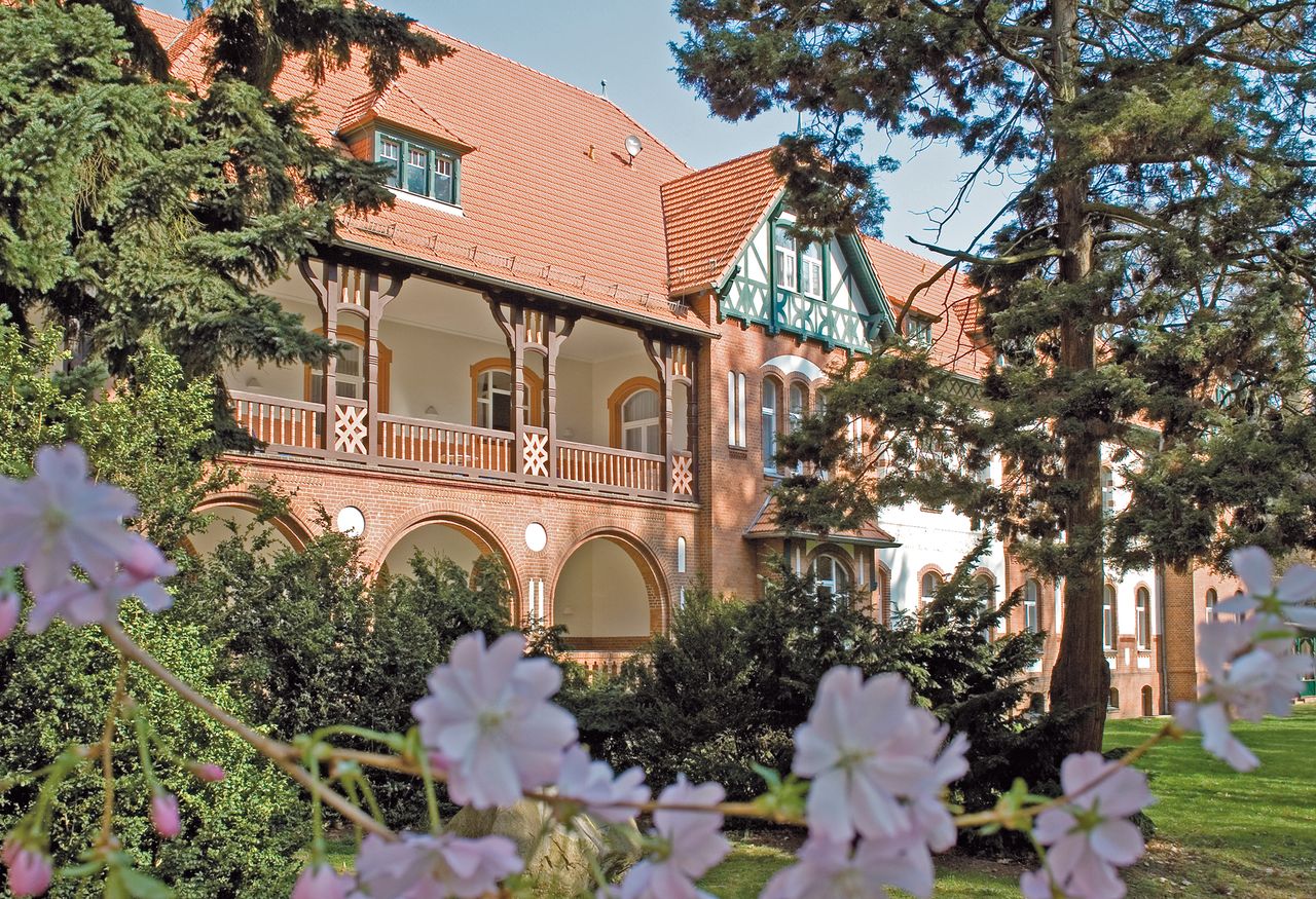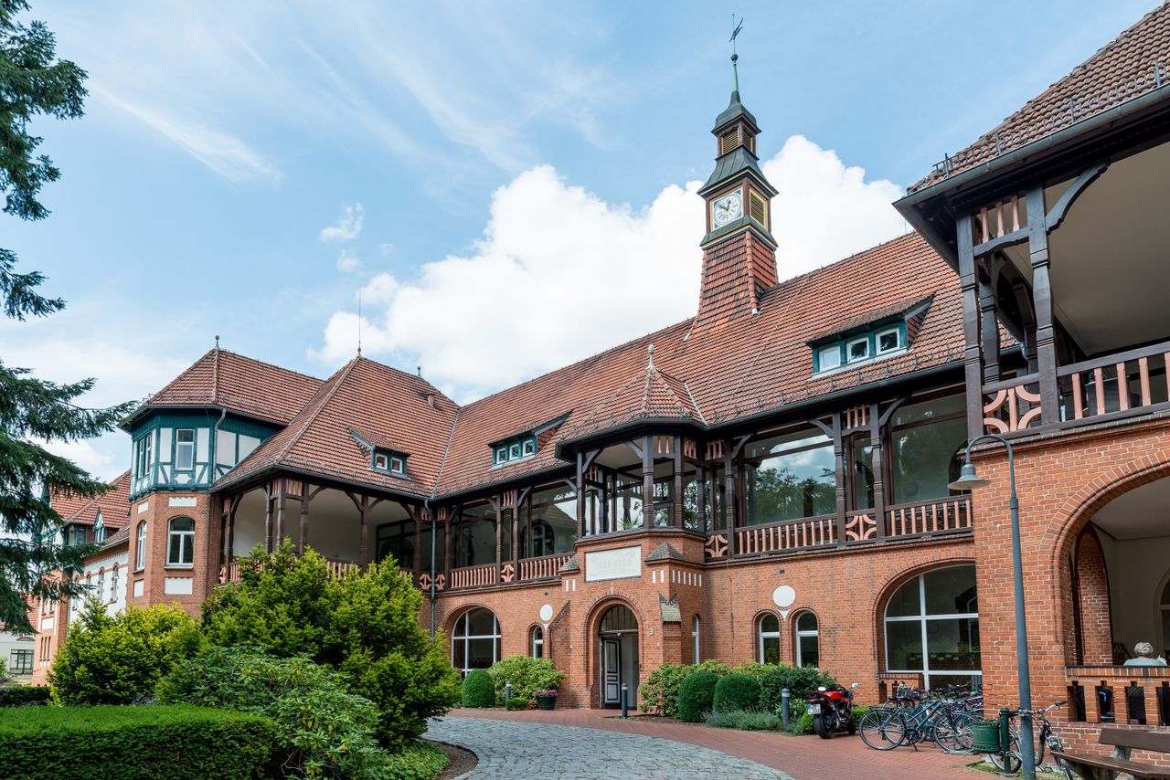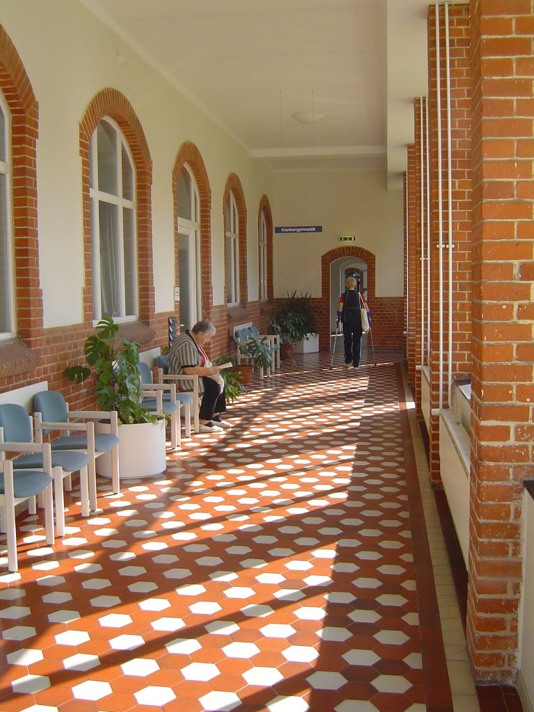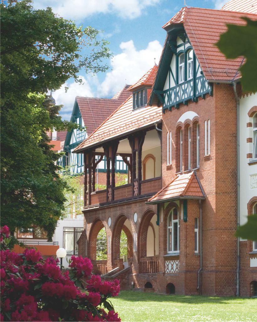 Landhaus-Baustil der vier Gebäude der Klinik mit Fachwerk und Türmchen, offenen Liegeflächen und modernem Innenausbau, bequemen breiten Treppen, Balkenzügen in der Decke und anderem mehr.