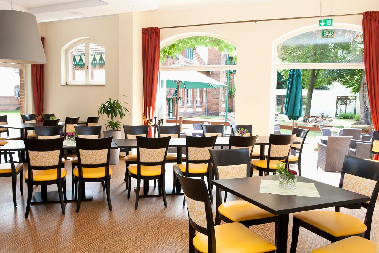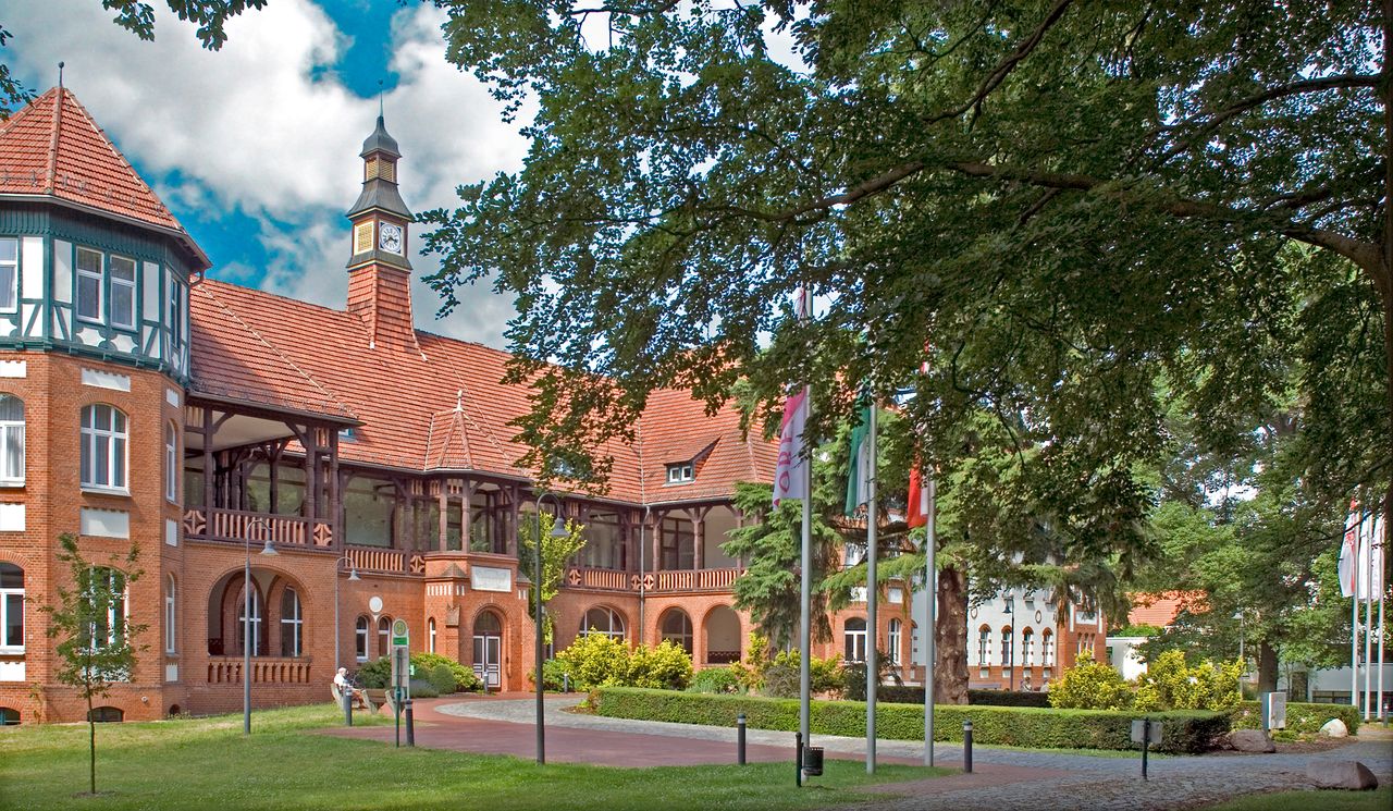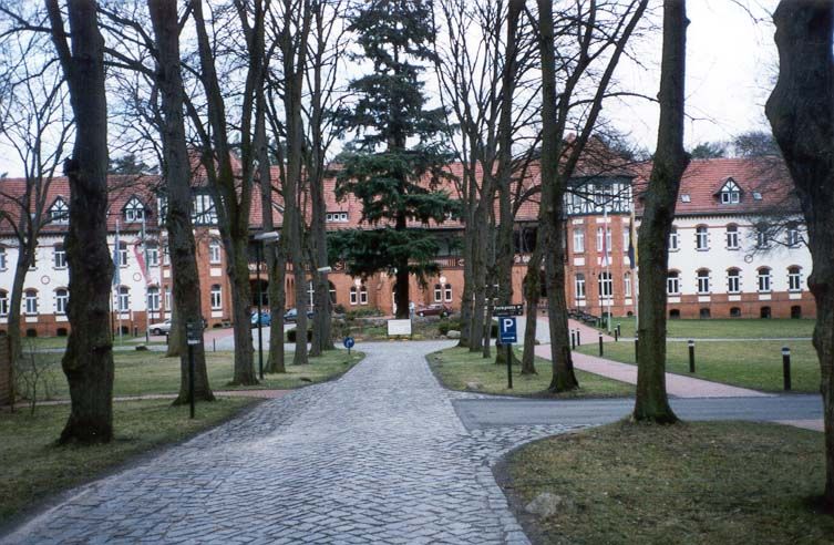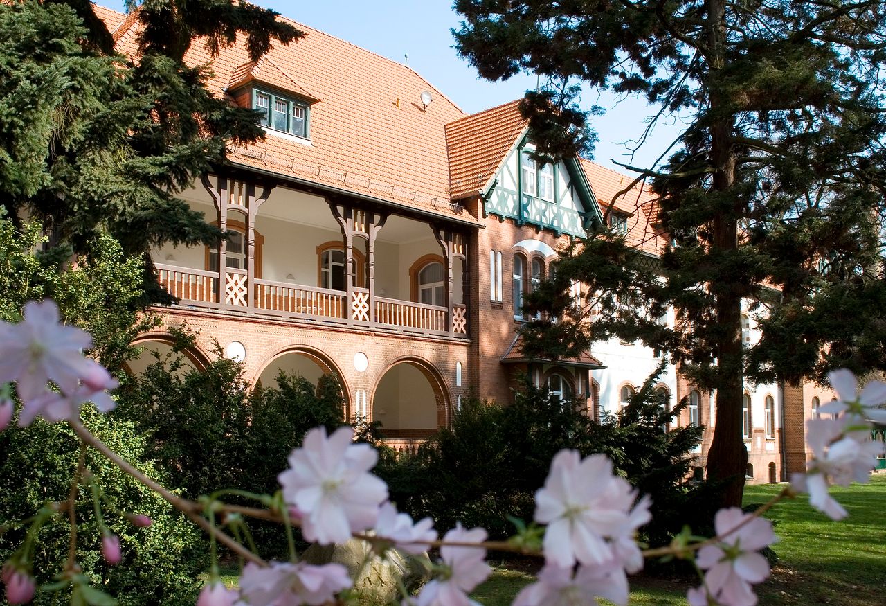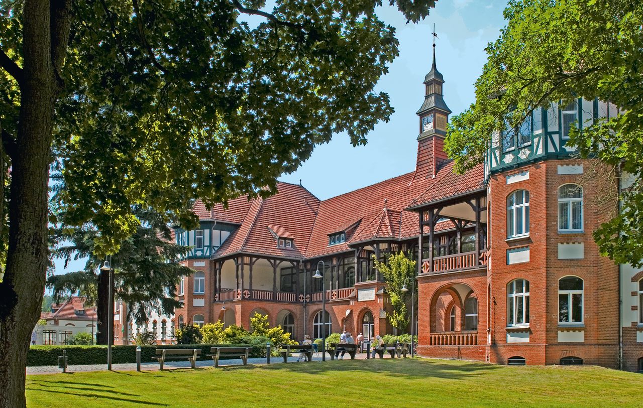 Landhaus-Baustil der vier Gebäude der Klinik mit Fachwerk und Türmchen, offenen Liegeflächen und modernem Innenausbau, bequemen breiten Treppen, Balkenzügen in der Decke und anderem mehr.