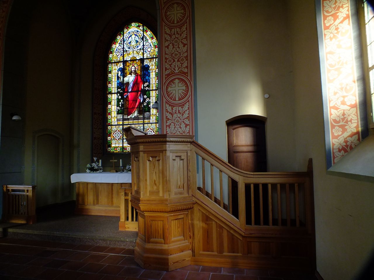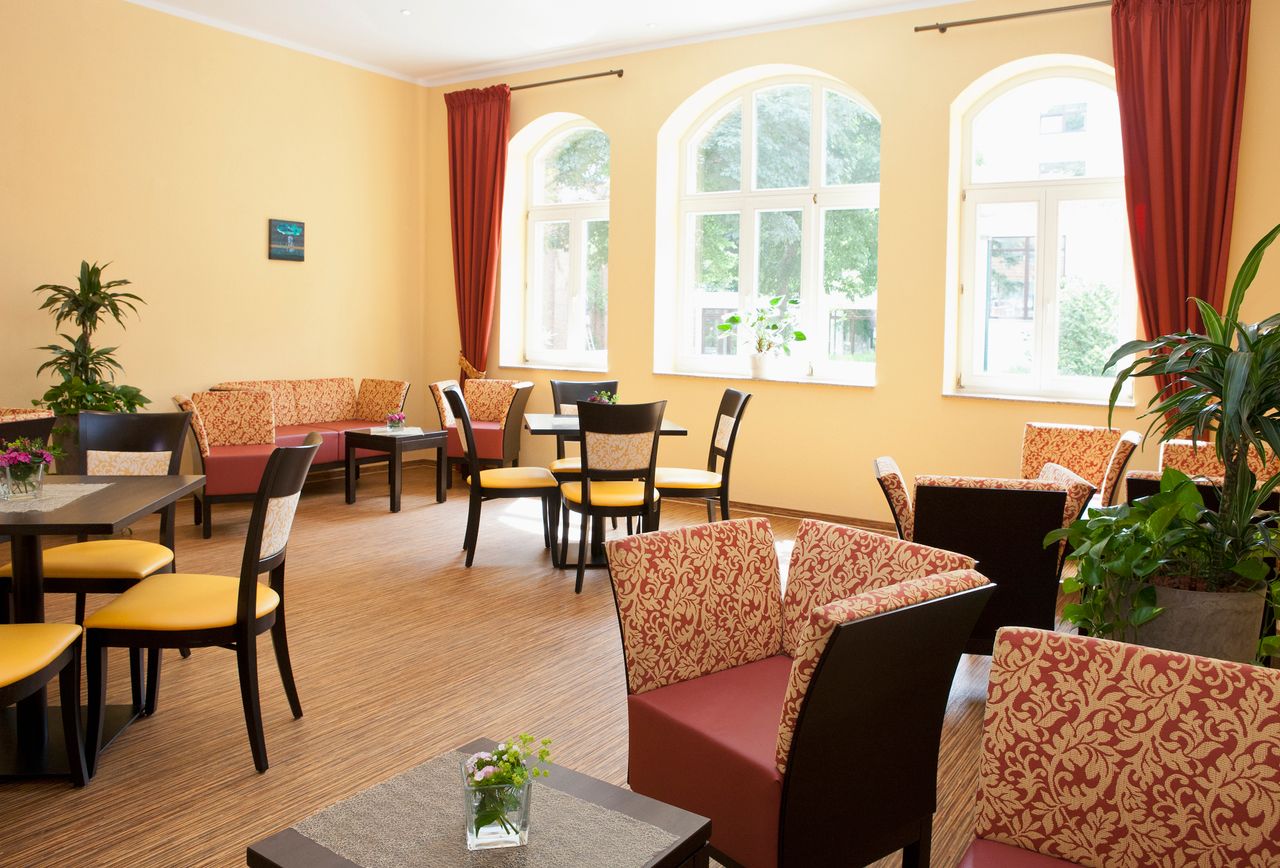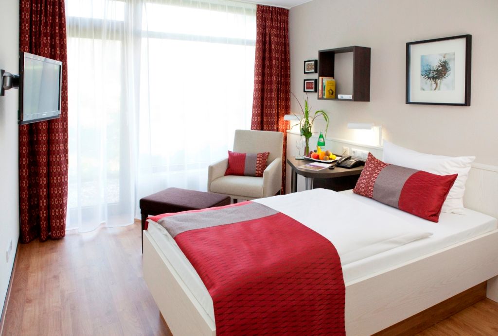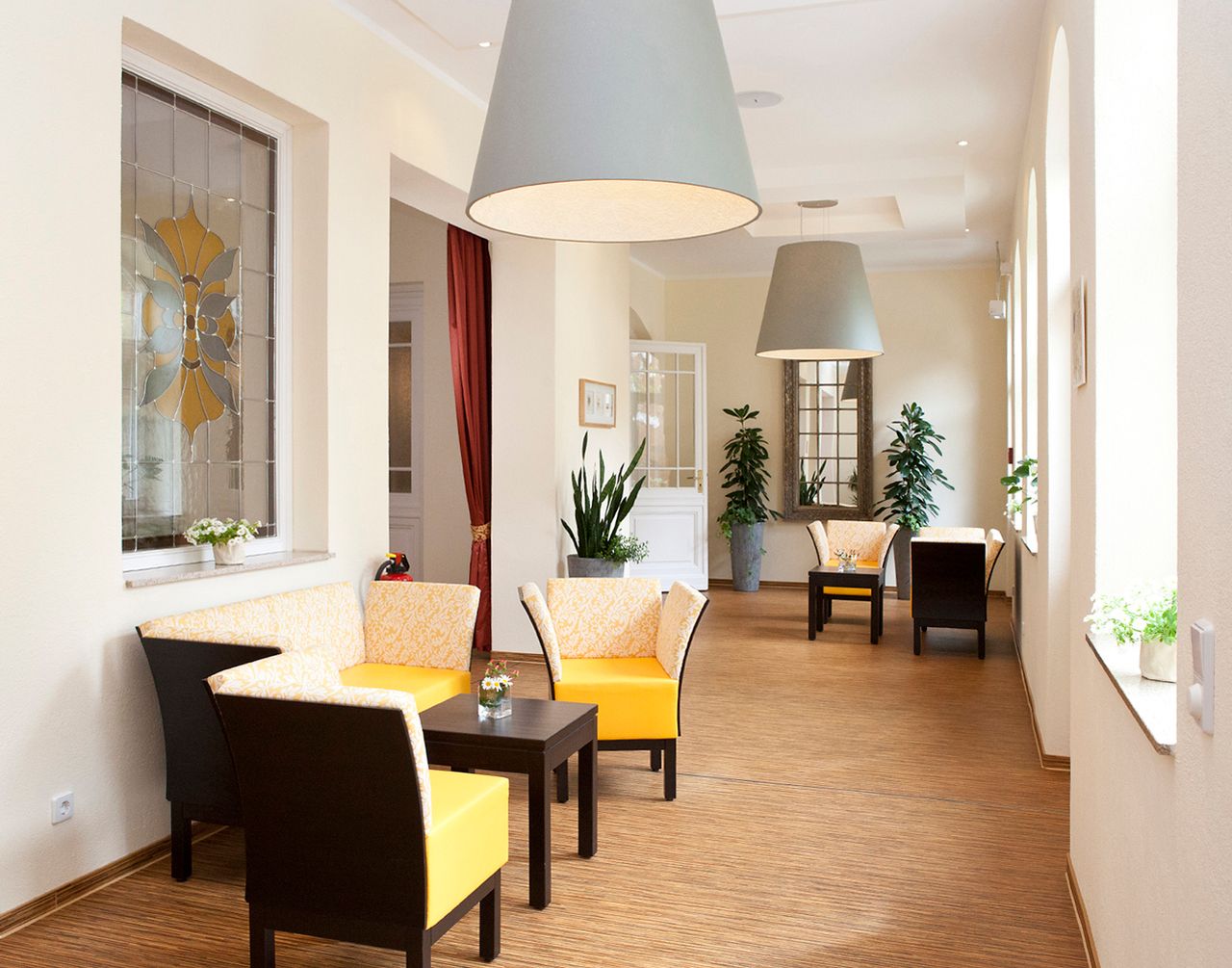 Landhaus-Baustil der vier Gebäude der Klinik mit Fachwerk und Türmchen, offenen Liegeflächen und modernem Innenausbau, bequemen breiten Treppen, Balkenzügen in der Decke und anderem mehr.