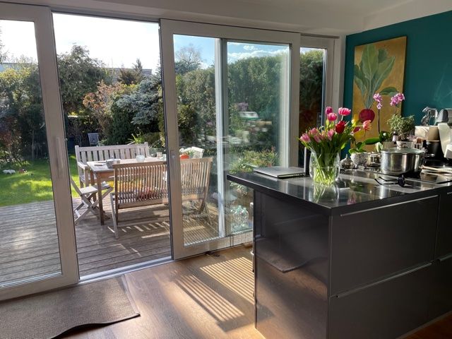 Reihenmittelhaus Erdgeschoss LWohnzimmer ca 40qm mit offener Küche mit Anbau in den Garten mit Terrasse.